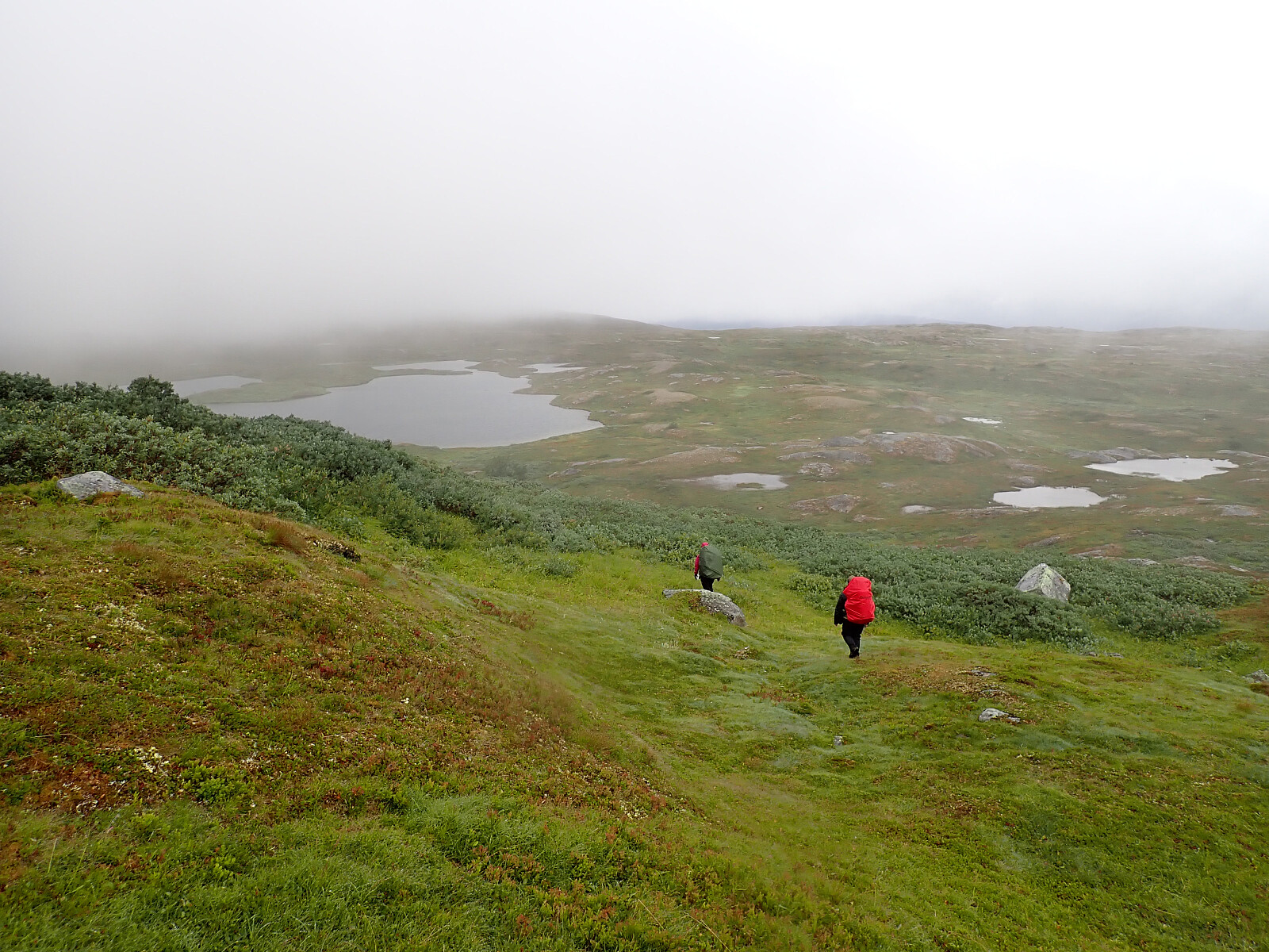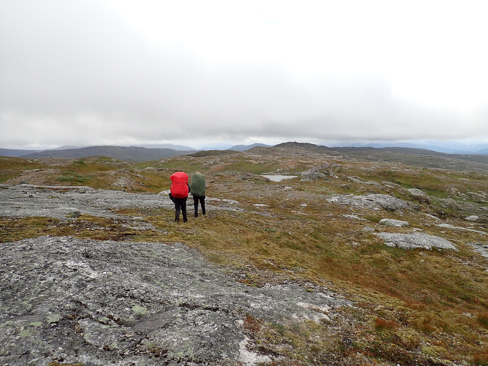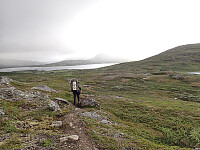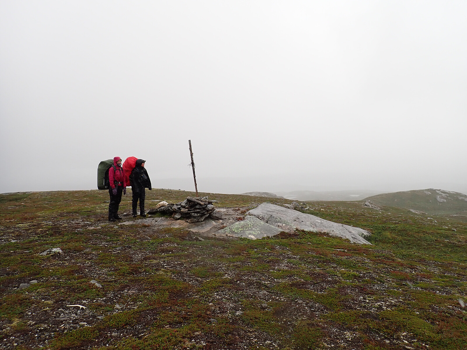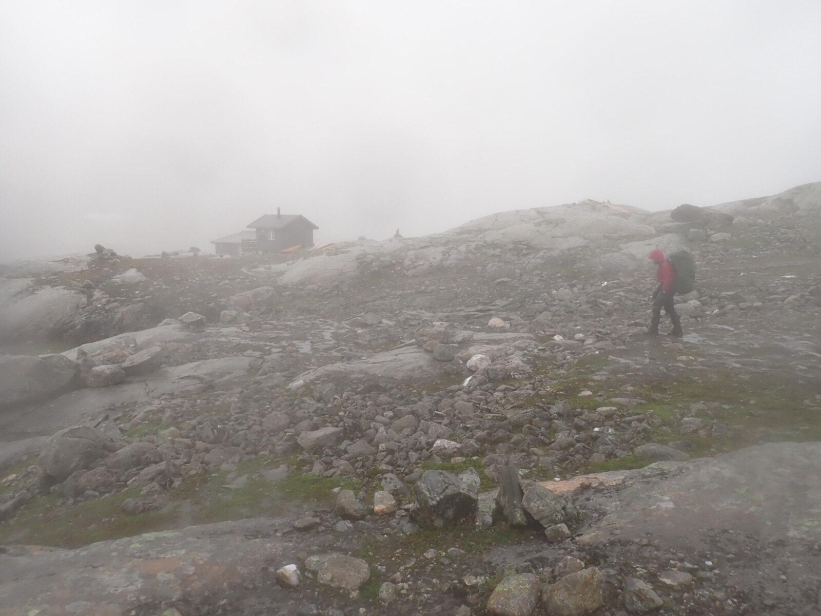 Vi var litt spent på dagens etappe siden de to damene vi traff på Virvasshytta hadde måttet snu på denne etappen pga for mye vann i en elv til å kunne krysse sikkert. Heldigvis hadde vannstanden nå sunket slik at det ikke var noe problem å krysse de elver og bekker som måtte krysses. Vi startet ut med overskyet men greit vær og godt humør. Fin sti opp mot Nordrumfjellet og så fulgte vi skilt mot Sauvasshytta i stikryss her oppe. Stigen over reingjerdet i sandtjønndalen manglet ett trinn, men gikk greit å komme seg over. Nå ble det litt mer myrterreng og da vi begynte oppstigninga fra dalen begynte vinden å ta seg opp og det begynte å regne. Det ble skikkelig ufyselig vær og veldig blaut i stien også. Opp Ivaksskardet var det sterk motvind, regn og tåke, så det gikk veldig sakte oppover. Tåka ble tettere jo lengre opp vi kom og stien var tidvis dekt av snø og vanskelig å se hvor den gikk i tåka. Var veldig godt å komme frem til Sauvasshytta der det heldigvis ikke var andre personer slik at vi fikk okkupert all tørkeplass til tøy og utstyr.