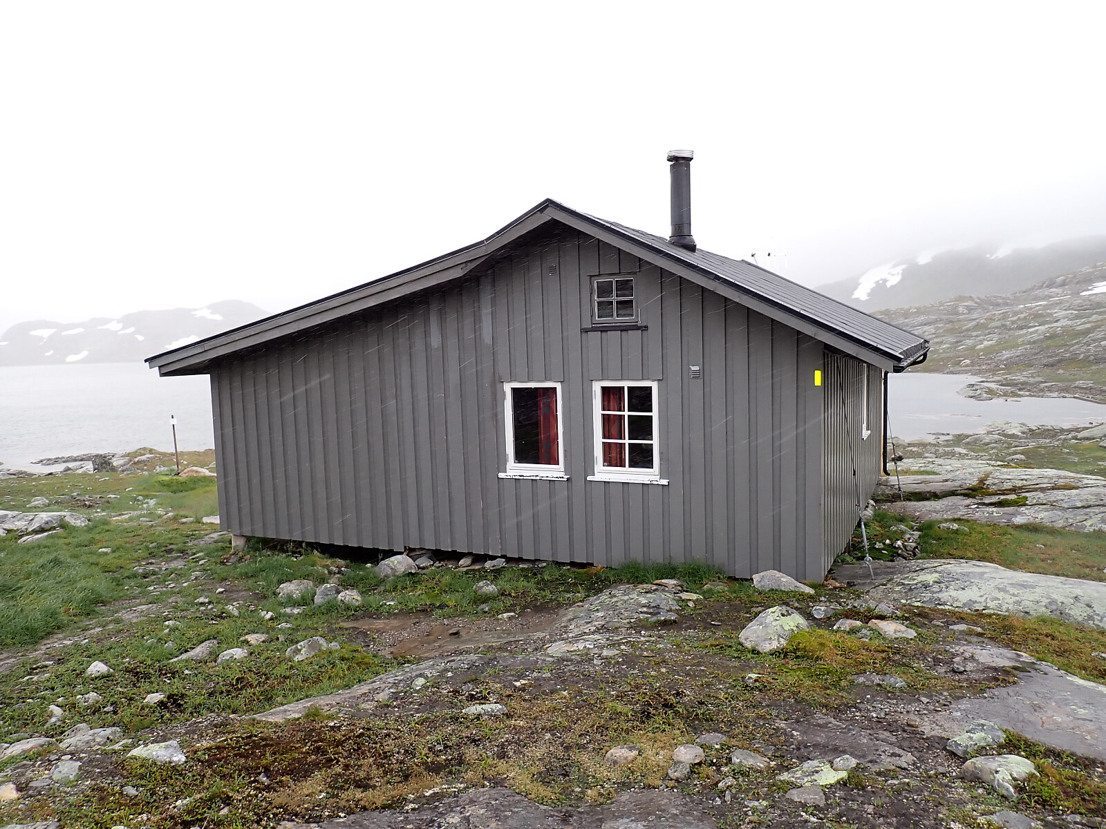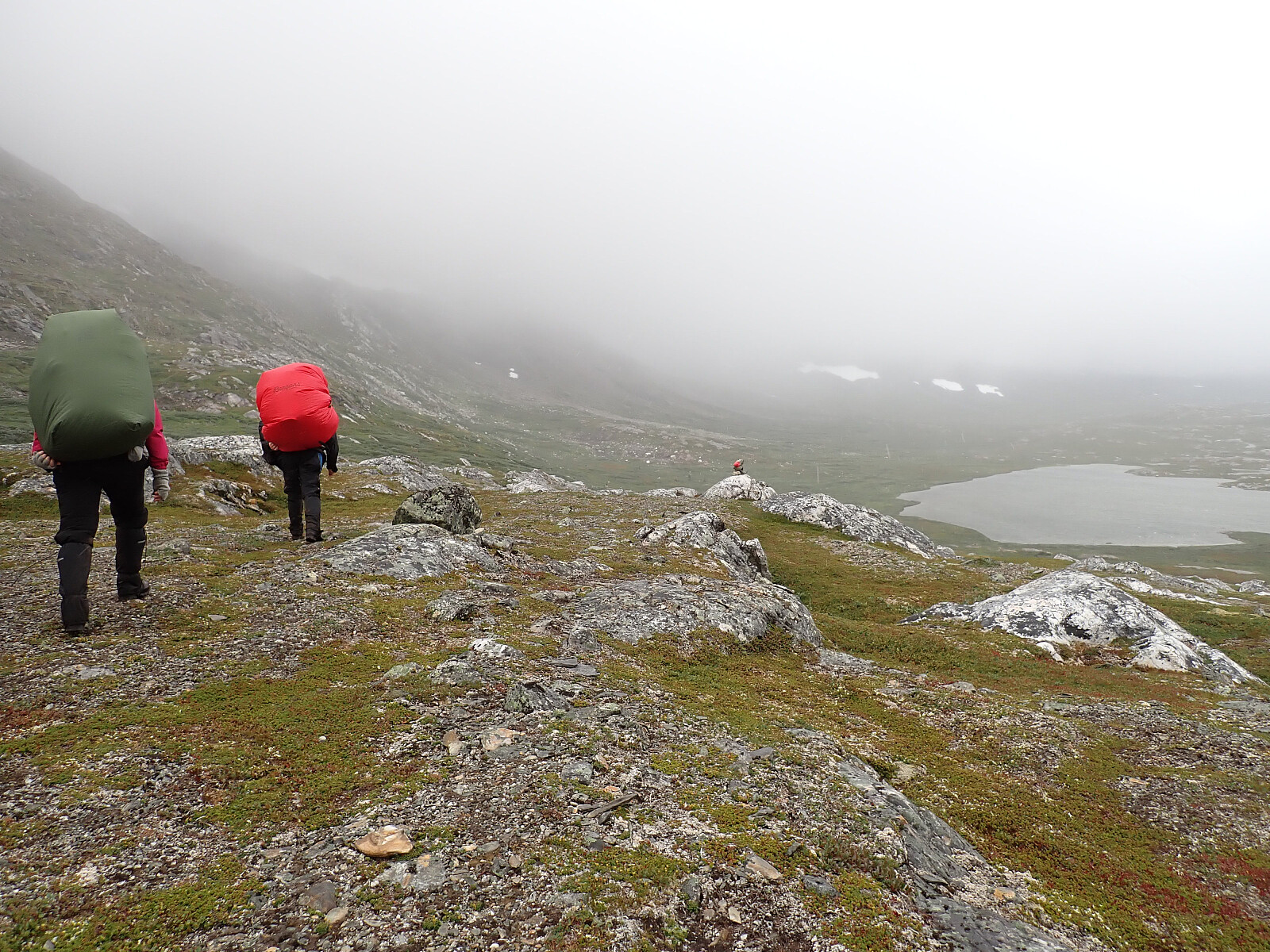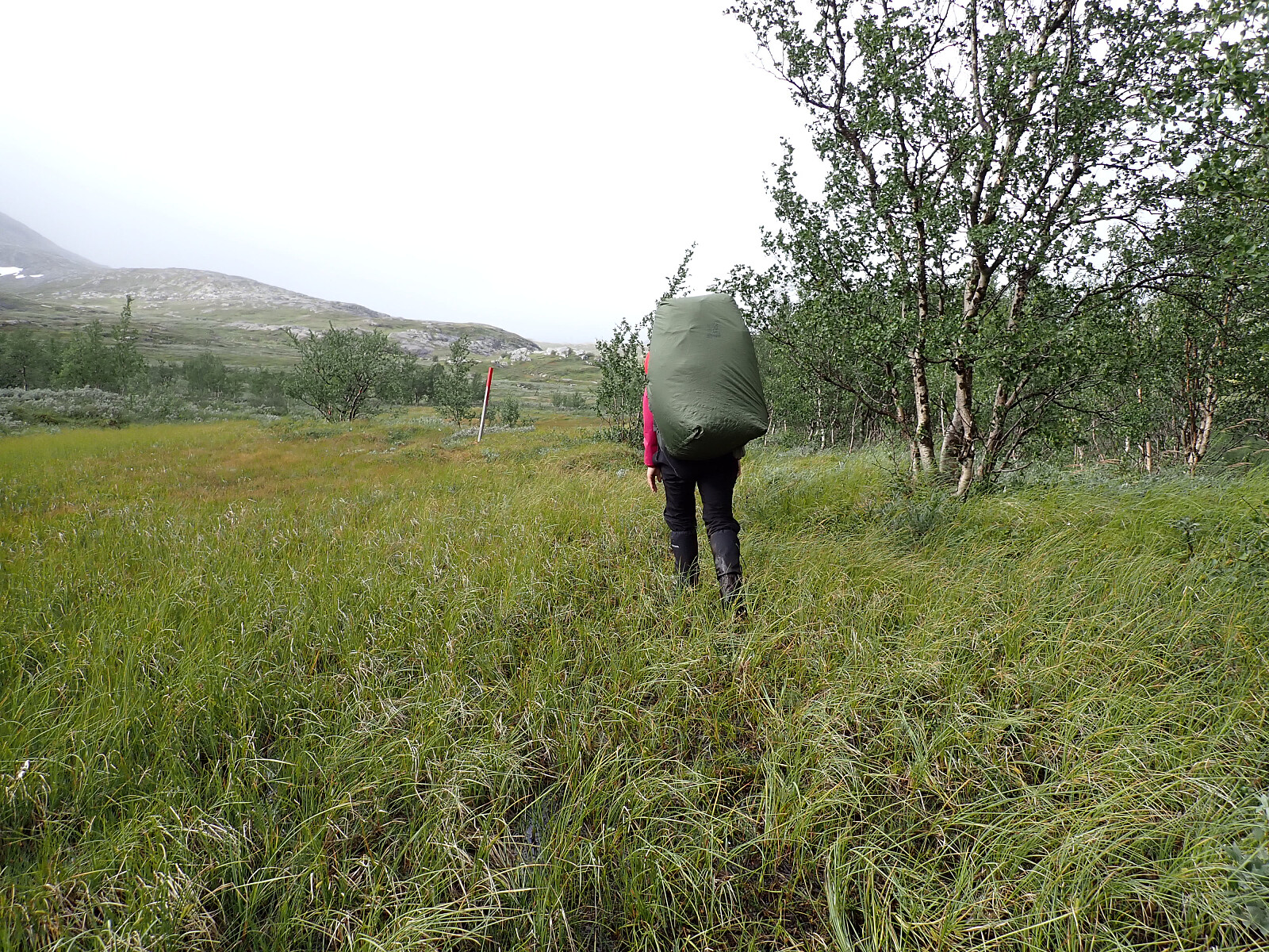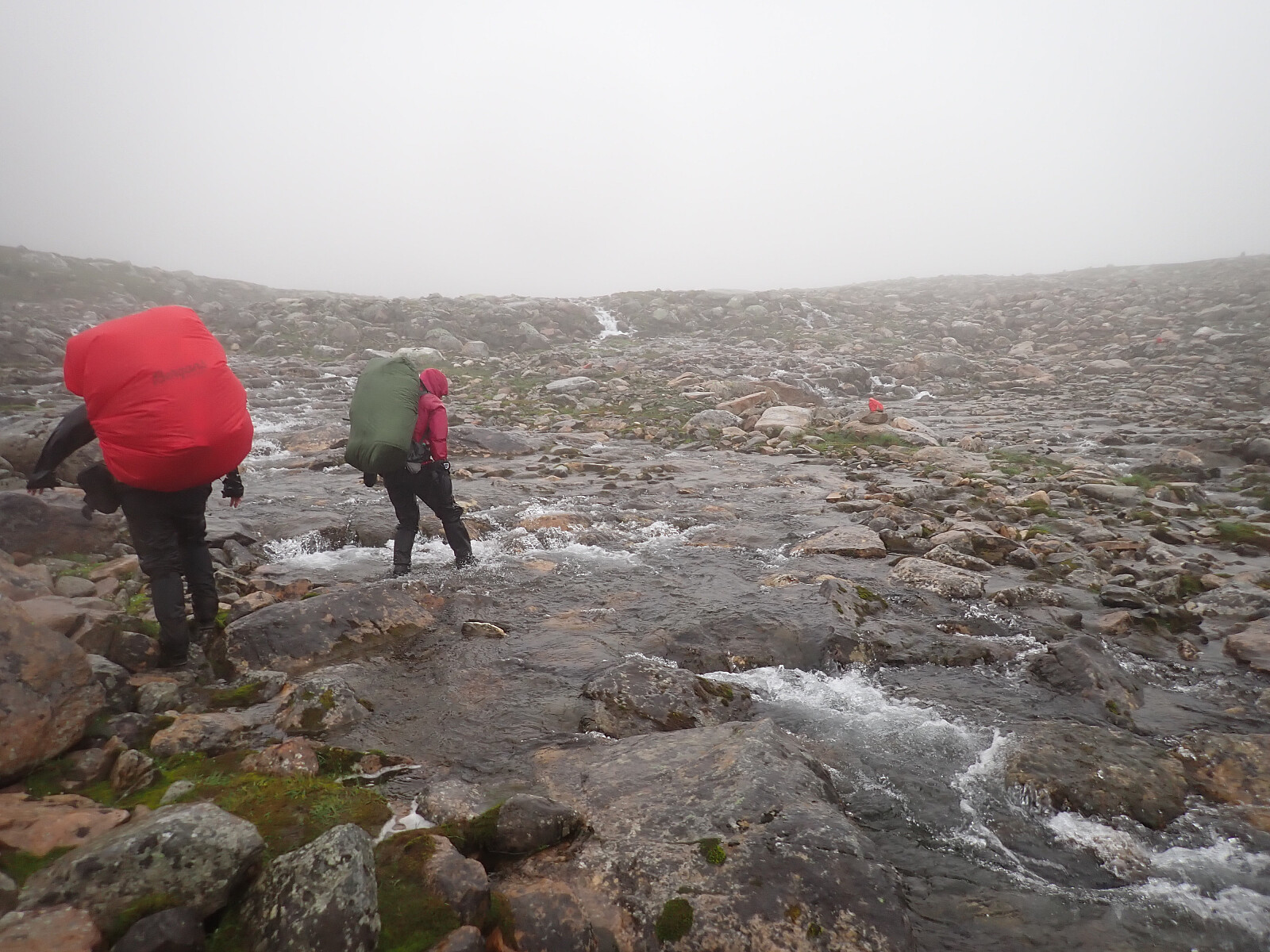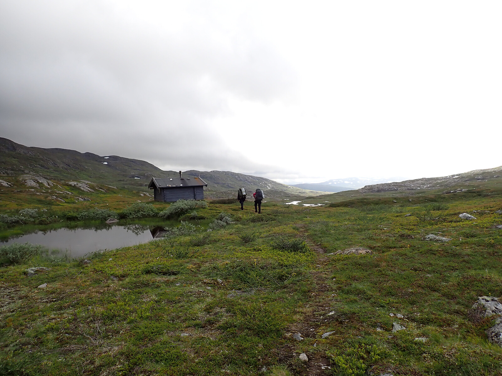 Vi var litt spent på dagens etappe siden de to damene vi traff på Virvasshytta hadde måttet snu på denne etappen pga for mye vann i en elv til å kunne krysse sikkert. Heldigvis hadde vannstanden nå sunket slik at det ikke var noe problem å krysse de elver og bekker som måtte krysses. Vi startet ut med overskyet men greit vær og godt humør. Fin sti opp mot Nordrumfjellet og så fulgte vi skilt mot Sauvasshytta i stikryss her oppe. Stigen over reingjerdet i sandtjønndalen manglet ett trinn, men gikk greit å komme seg over. Nå ble det litt mer myrterreng og da vi begynte oppstigninga fra dalen begynte vinden å ta seg opp og det begynte å regne. Det ble skikkelig ufyselig vær og veldig blaut i stien også. Opp Ivaksskardet var det sterk motvind, regn og tåke, så det gikk veldig sakte oppover. Tåka ble tettere jo lengre opp vi kom og stien var tidvis dekt av snø og vanskelig å se hvor den gikk i tåka. Var veldig godt å komme frem til Sauvasshytta der det heldigvis ikke var andre personer slik at vi fikk okkupert all tørkeplass til tøy og utstyr.