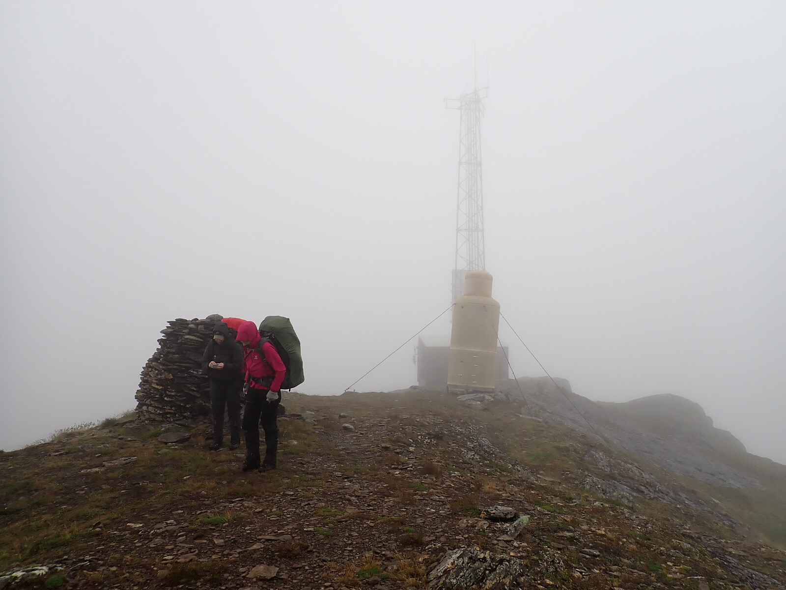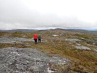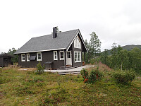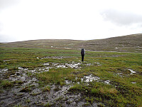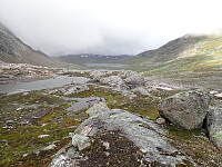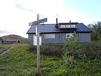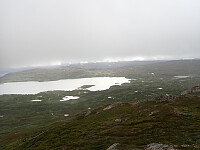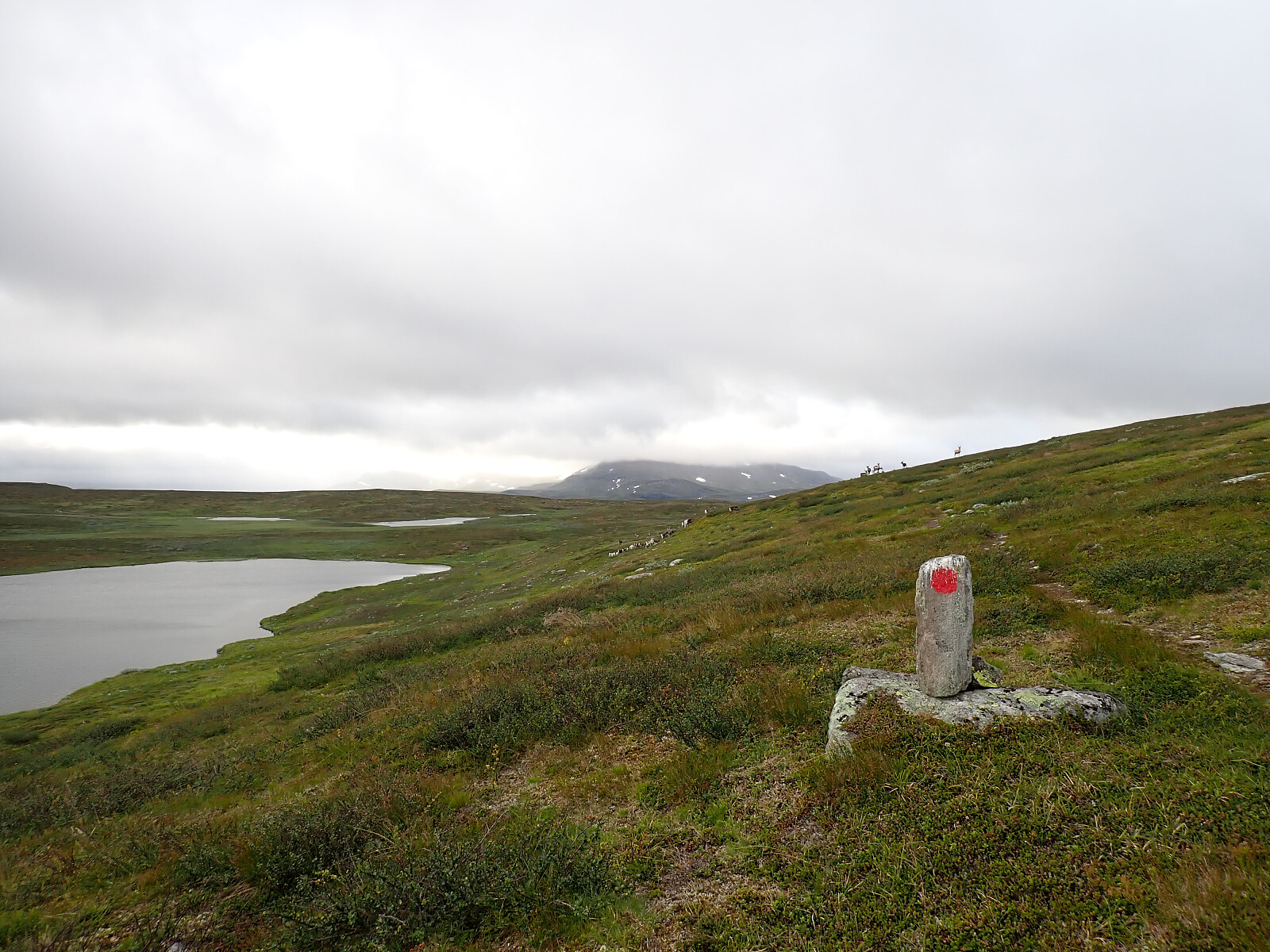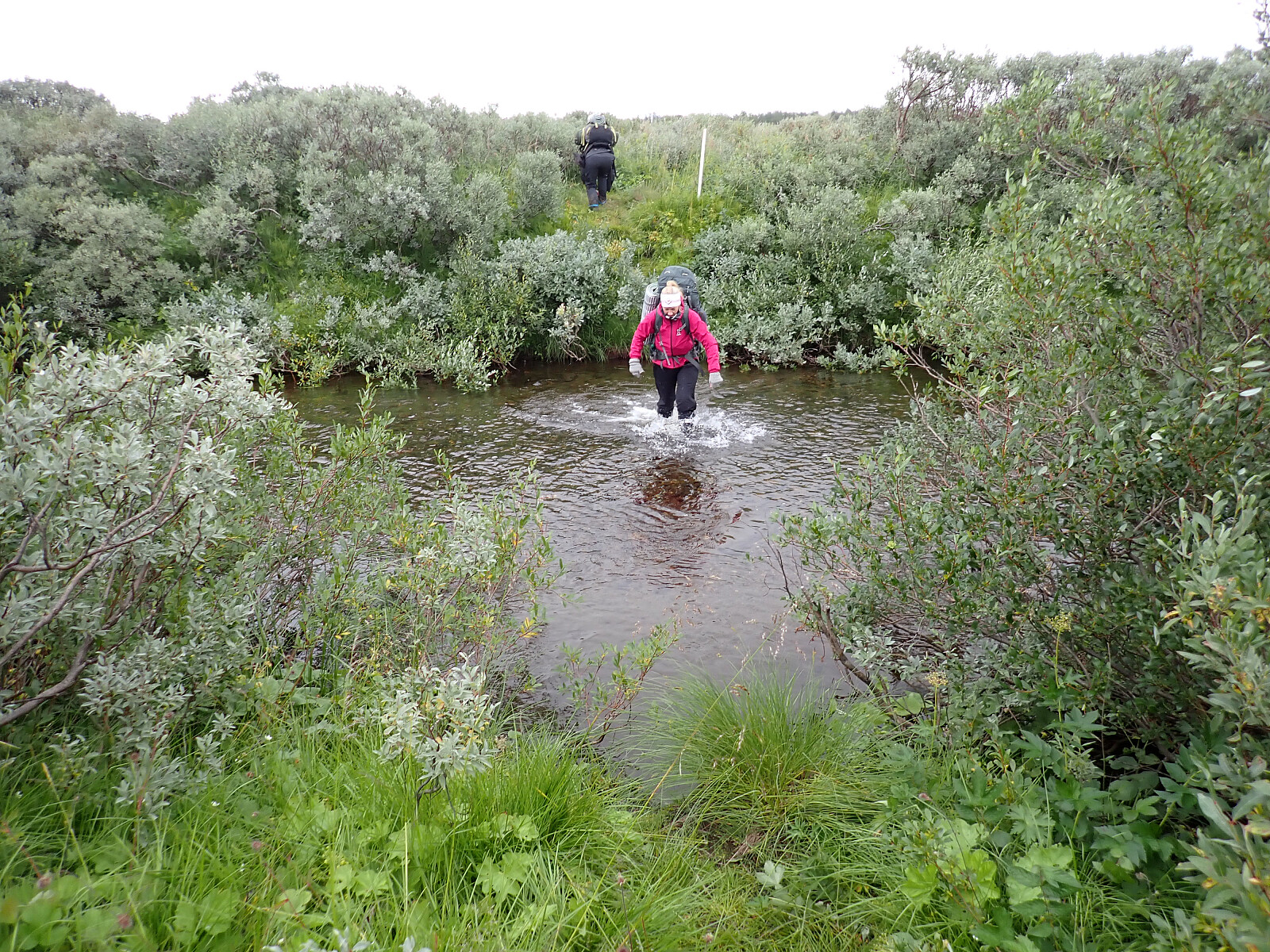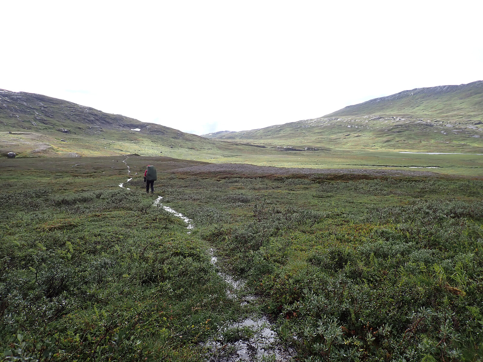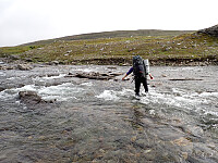 Vi var litt spent på dagens etappe siden de to damene vi traff på Virvasshytta hadde måttet snu på denne etappen pga for mye vann i en elv til å kunne krysse sikkert. Heldigvis hadde vannstanden nå sunket slik at det ikke var noe problem å krysse de elver og bekker som måtte krysses. Vi startet ut med overskyet men greit vær og godt humør. Fin sti opp mot Nordrumfjellet og så fulgte vi skilt mot Sauvasshytta i stikryss her oppe. Stigen over reingjerdet i sandtjønndalen manglet ett trinn, men gikk greit å komme seg over. Nå ble det litt mer myrterreng og da vi begynte oppstigninga fra dalen begynte vinden å ta seg opp og det begynte å regne. Det ble skikkelig ufyselig vær og veldig blaut i stien også. Opp Ivaksskardet var det sterk motvind, regn og tåke, så det gikk veldig sakte oppover. Tåka ble tettere jo lengre opp vi kom og stien var tidvis dekt av snø og vanskelig å se hvor den gikk i tåka. Var veldig godt å komme frem til Sauvasshytta der det heldigvis ikke var andre personer slik at vi fikk okkupert all tørkeplass til tøy og utstyr.