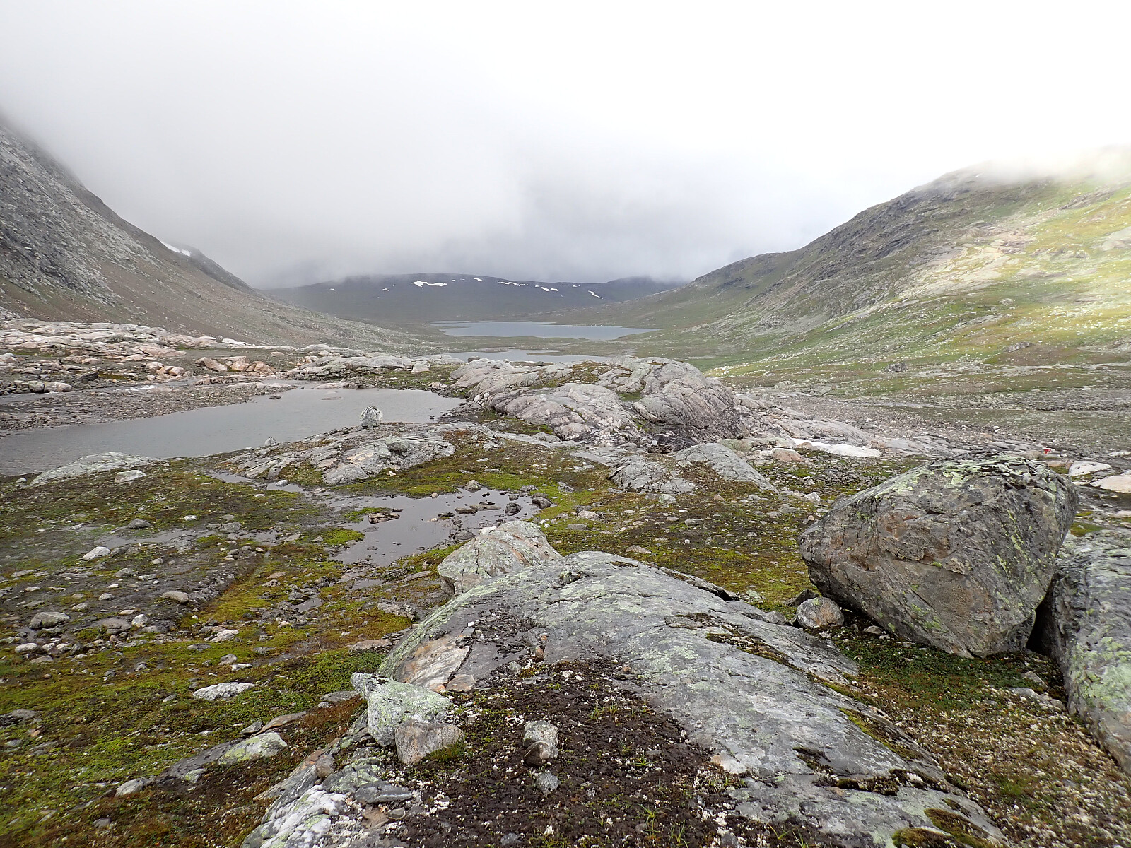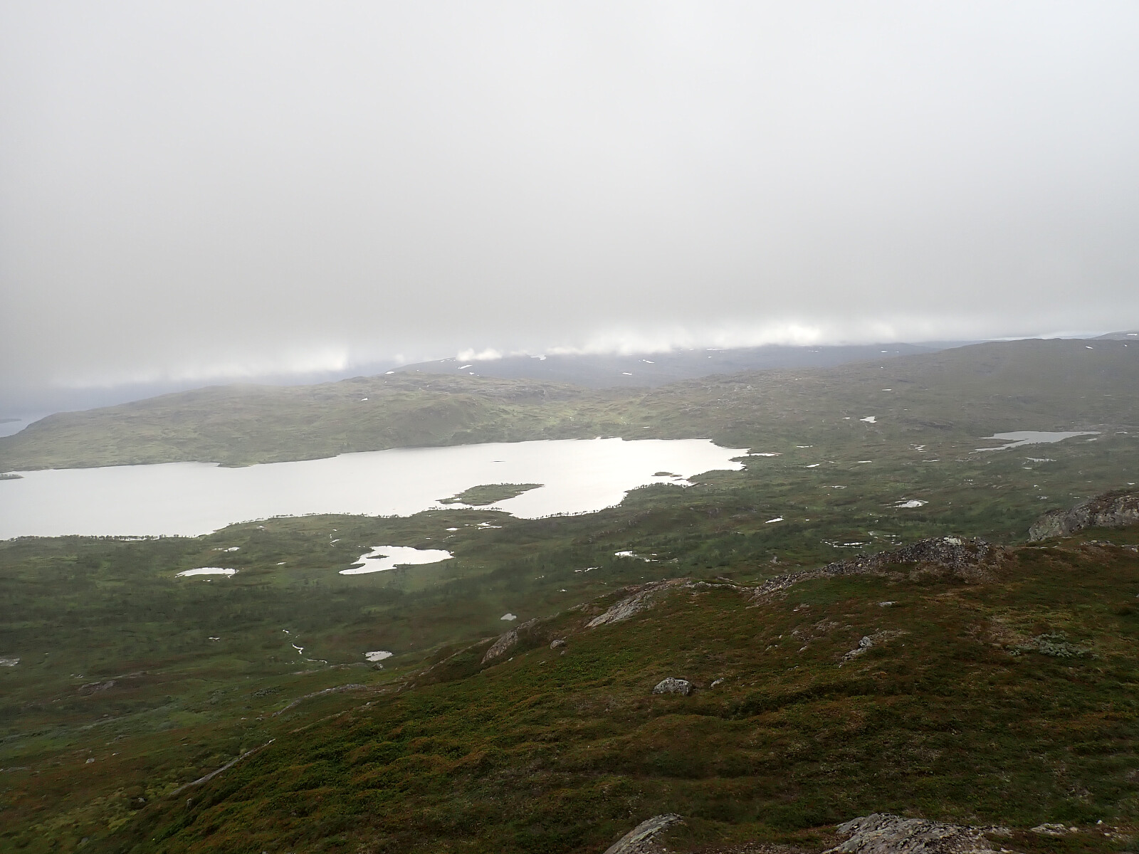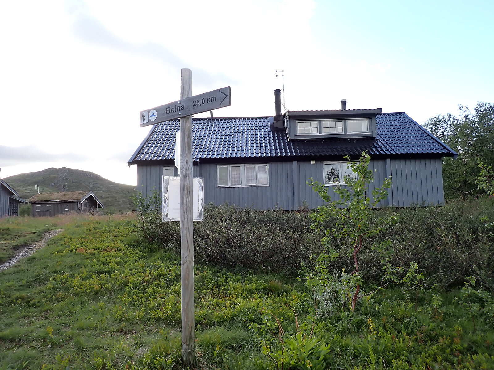 Våknet opp til bedre vær og tørt tøy, nå var sikten betraktelig bedre så vi så hvordan det så ut her oppe, men skydekke var lavt og hang over de høyeste fjellene. Fulgte DNT stien videre mot Umbukta som ligger ganske mye lavere i terrenget så det var endel høydemetre som skulle gås nedover. Stort sett lettgått åpent høyfjellsterreng. Kom inn i skogen siste biten mot Umbukta som er en privatdrevet fjellstue. Her bestilte vi middag på kafeen, og overnatting i ett lite gjestehus.