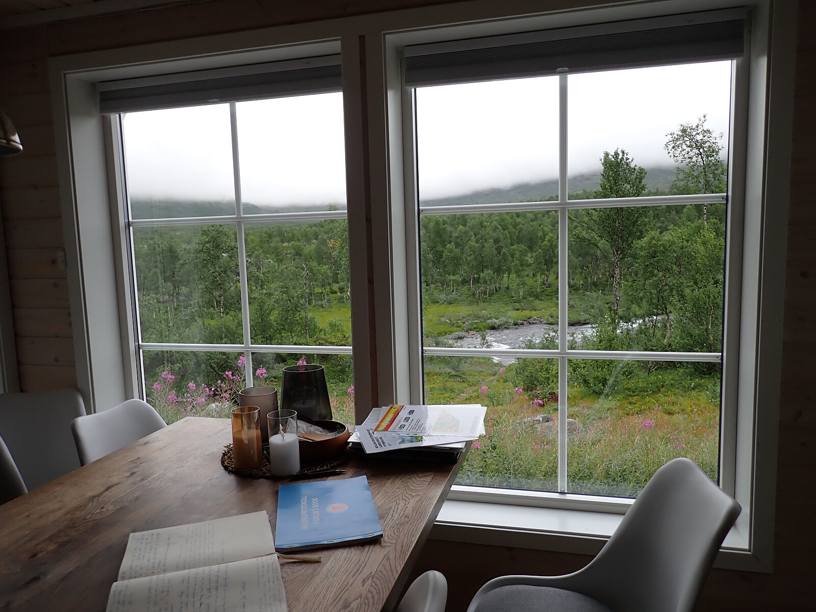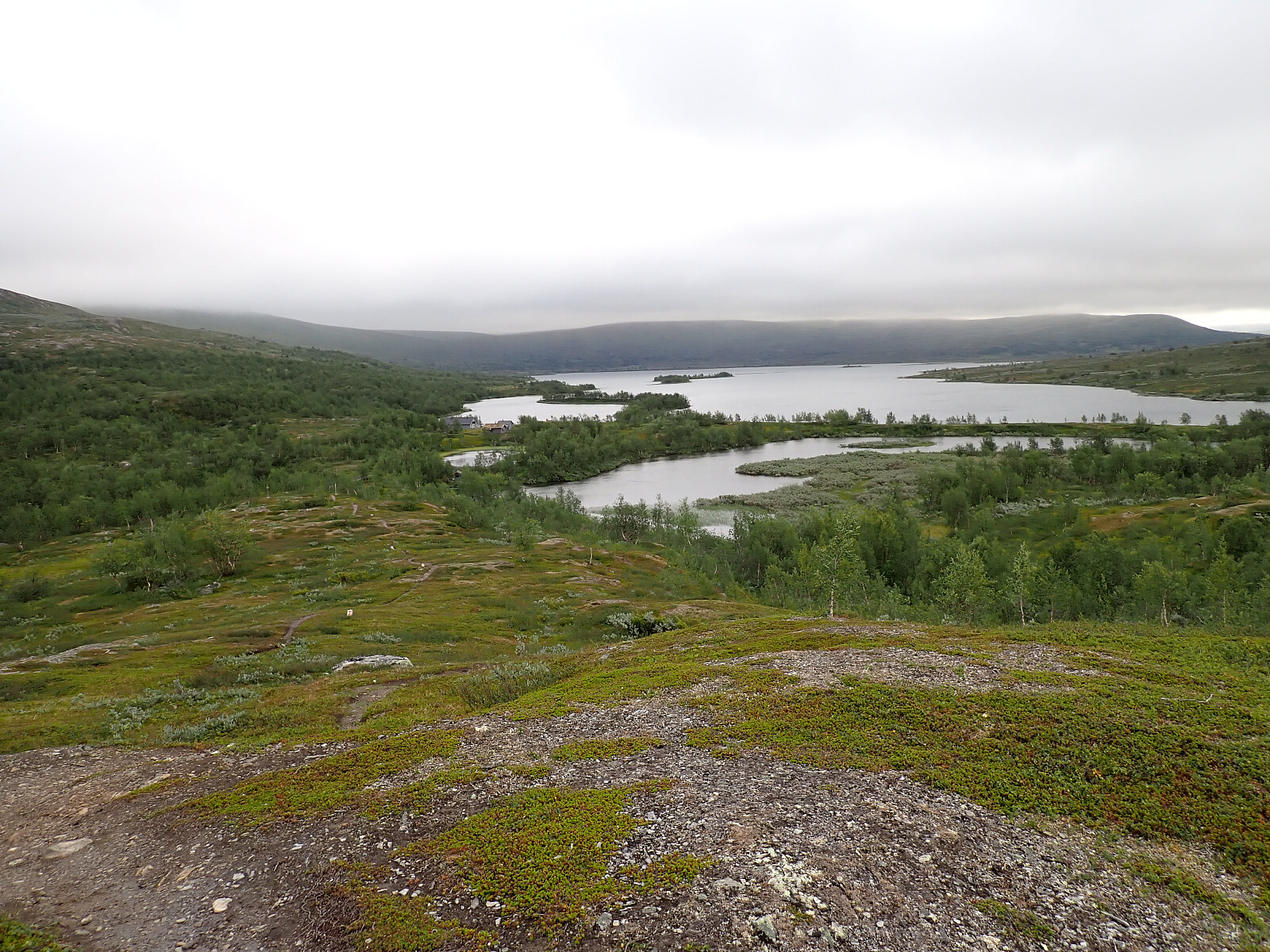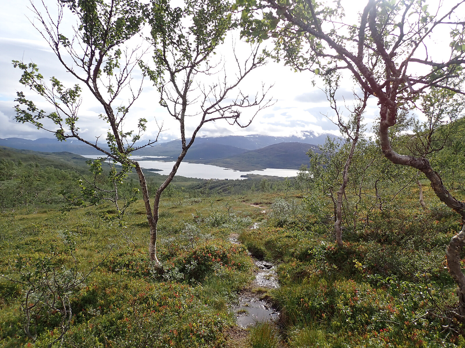 Våknet opp til bedre vær og tørt tøy, nå var sikten betraktelig bedre så vi så hvordan det så ut her oppe, men skydekke var lavt og hang over de høyeste fjellene. Fulgte DNT stien videre mot Umbukta som ligger ganske mye lavere i terrenget så det var endel høydemetre som skulle gås nedover. Stort sett lettgått åpent høyfjellsterreng. Kom inn i skogen siste biten mot Umbukta som er en privatdrevet fjellstue. Her bestilte vi middag på kafeen, og overnatting i ett lite gjestehus.