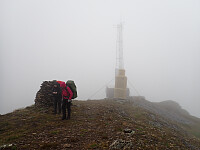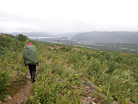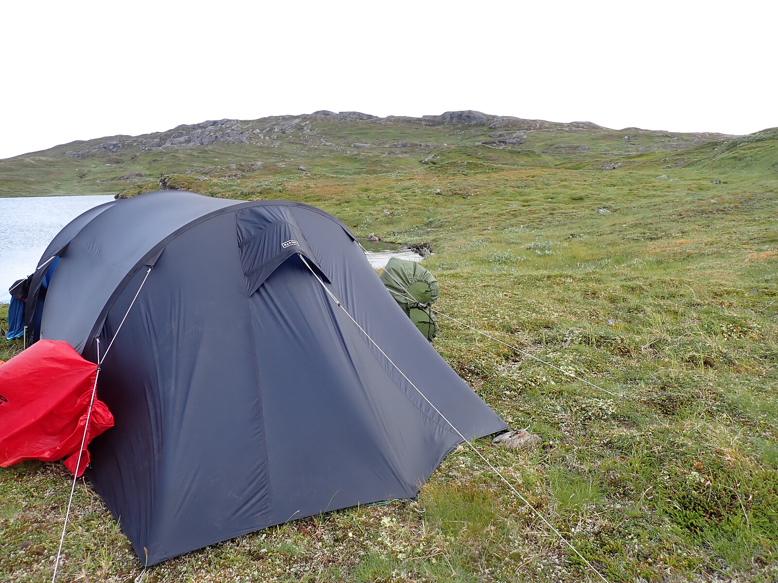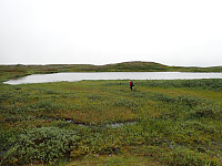 I dag skulle vi forlate DNT-stiene og gå mot Mo i Rana. Vi gikk først ett lite stykke langs E12 og tok inn på første vei til høyre som vi fulgte opp mot umskardtjønna. Gikk litt feil i krysset før Umskardstjønna og måtte gå litt tilbake for å komme til stien som går opp til Hellerfjellet. Grei sti å følge, men vi kom etterhvert opp i tåka og det var surt og kaldt. Nesten ikke sikt på toppen pga tåke. Stor mast og varde på toppen. Fulgte ryggen videre og skrådde så ned mot vann 845. Kom etterhvert under skydekket igjen og fikk sikt. Det var da grei skuring og lettgått terreng mot Stangfjellet der vi gikk innom 884 toppen og diverse andre toppunkter på fjellet. Fant en fin teltplass ved stangfjelltjønna og Tone og Randi prøvde fiskelykken også her uten hell. Noen reinsdyr å se og masse bær.
