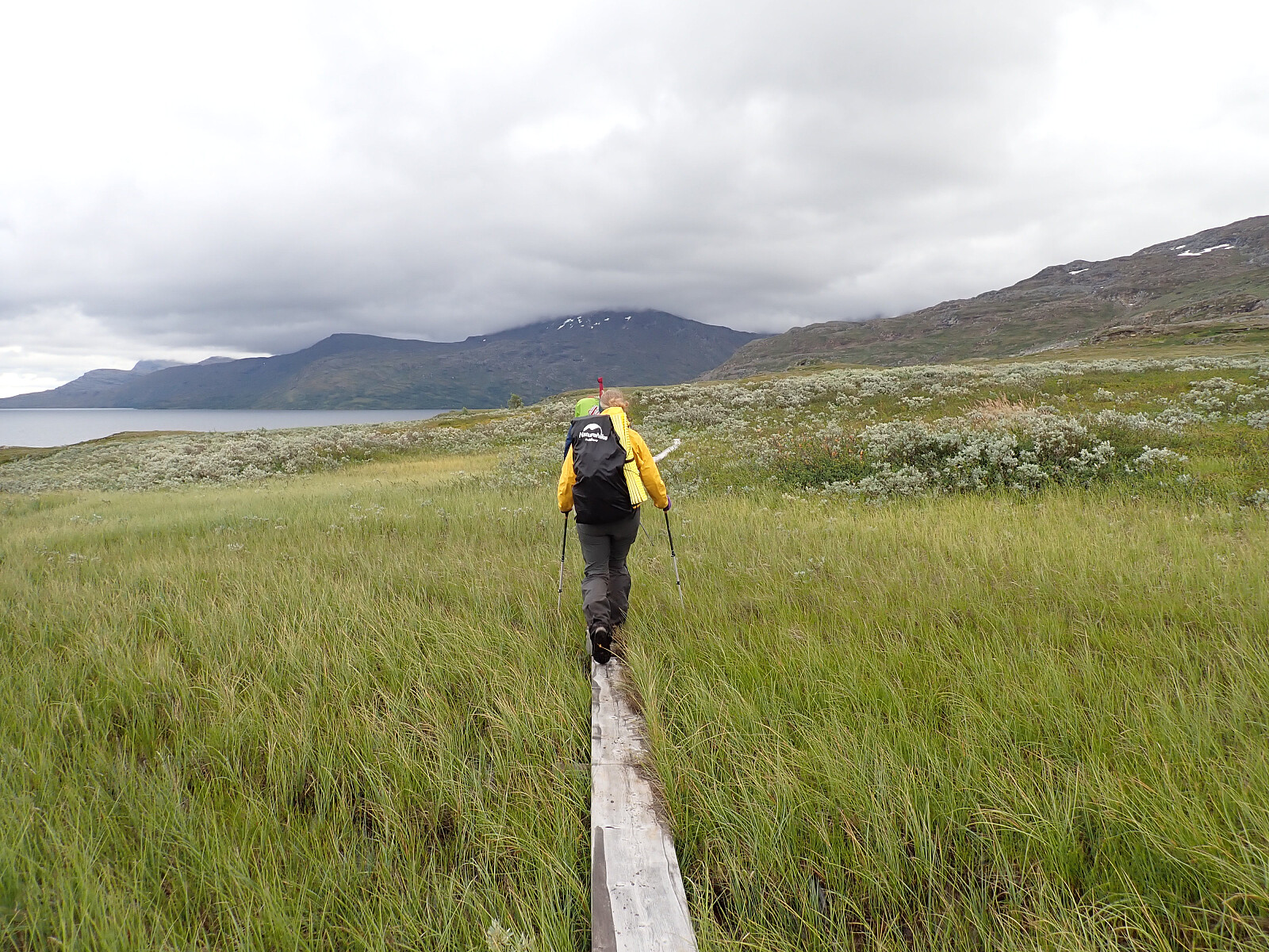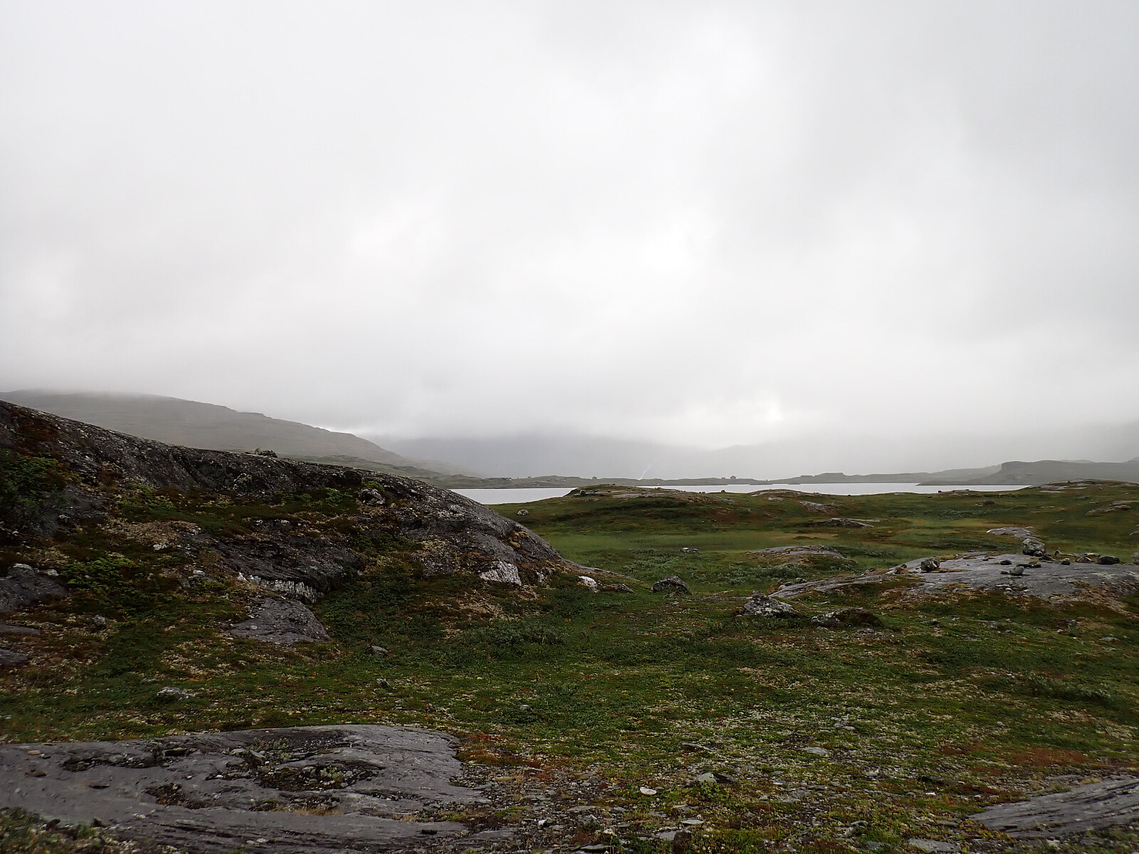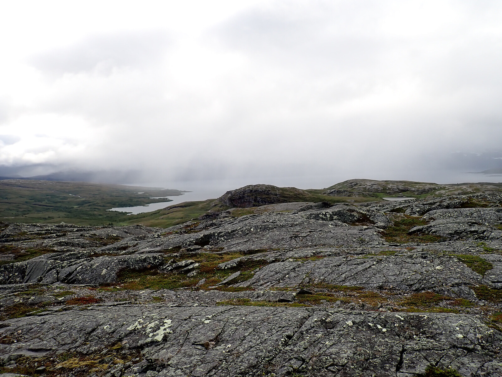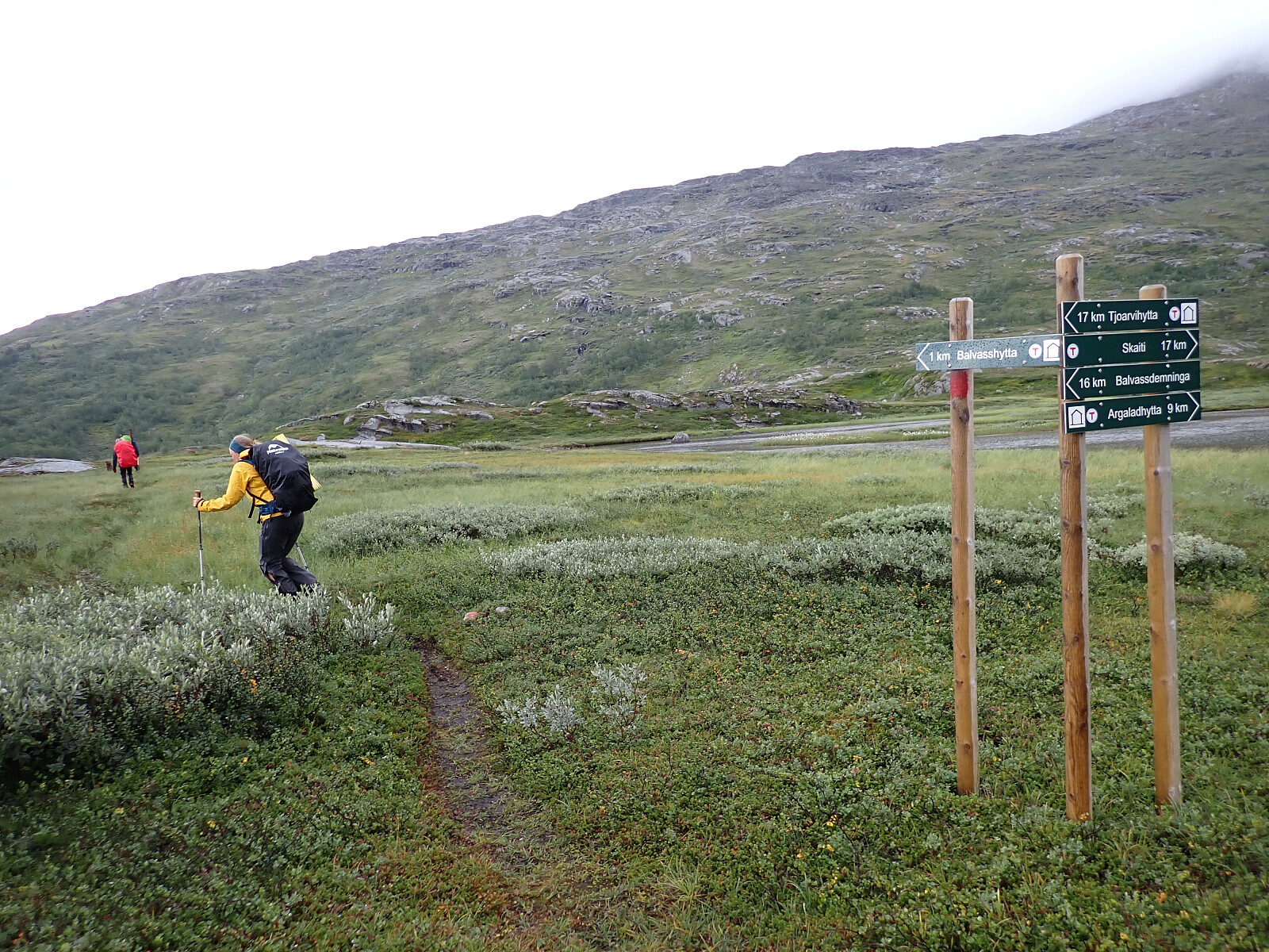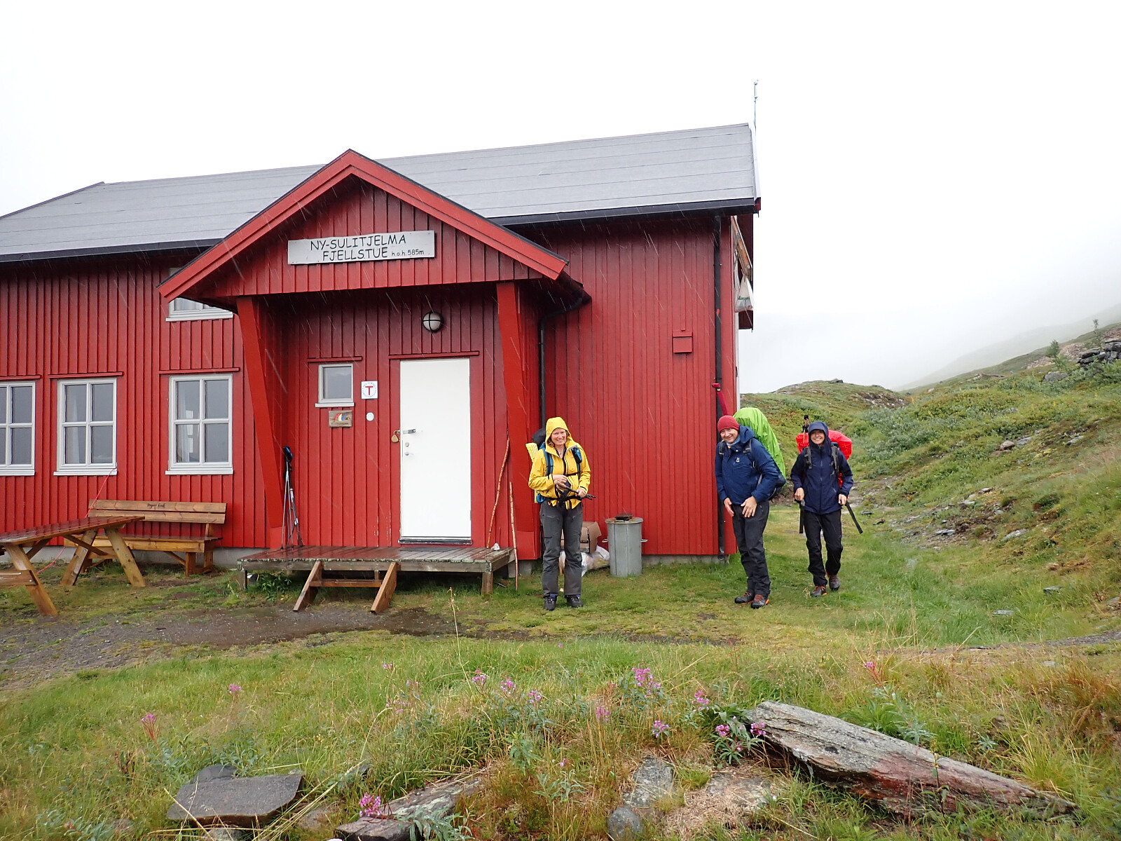 Dagen før hadde jeg og Lena blitt plukket opp på Russånes parkering av Silje og Rolf, og blitt kjørt opp til Ny-Sulitjelma fjellstue der det ble tid for middag før vi tok kvelden. Neste morgen våknet vi opp til hustrig vær, regn og tåke. Vi la i vei på grusvei til Lomvivatnet. Der veien sluttet fulgte vi godt merket sti videre til fjells. Ble en kort matpause og tåka lå tykk hele dagen, så vi fikk ikke så mye inntrykk av omgivelsene. Noen bekker/små elver som måtte forseres, men gikk greit uten å vade. Over den største var det heldigvis bygd bro. Stien gikk etterhvert nedover i terrenget til Tjalaveshytta som ligger rett ved et stort vann, da kom vi også under tåka og fikk sett litt av landskapet rundt oss. Koselig hytte der det allerede var noen gjester inkludert Kirsten som jeg og Lena kjenner fra Tromsø, hun var på vei i motsatt retning, men vi fikk tilbrakt en koselig kveld sammen på hytta før vi dro i hver vår retning neste dag.