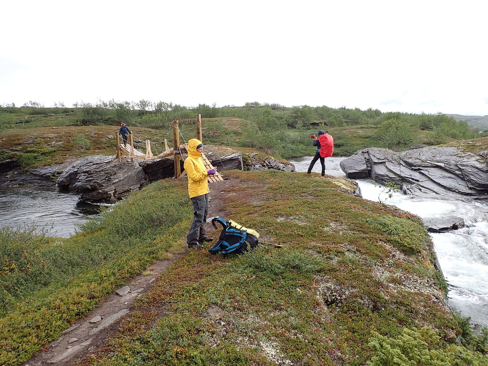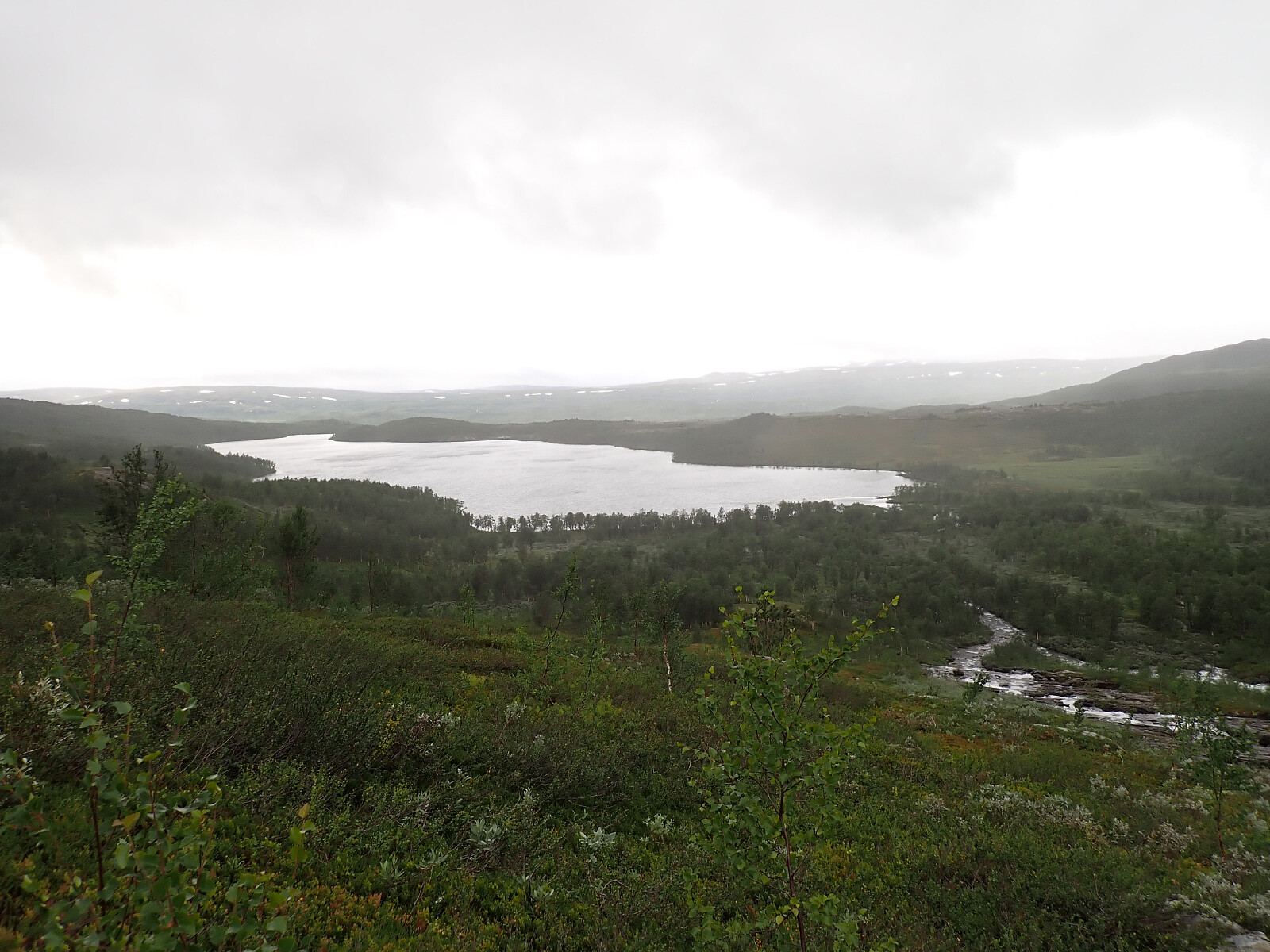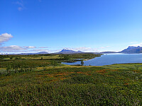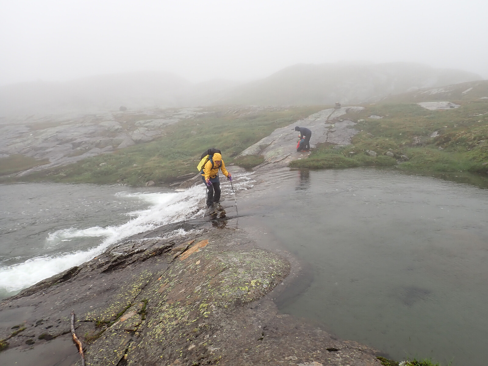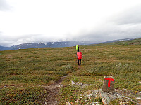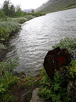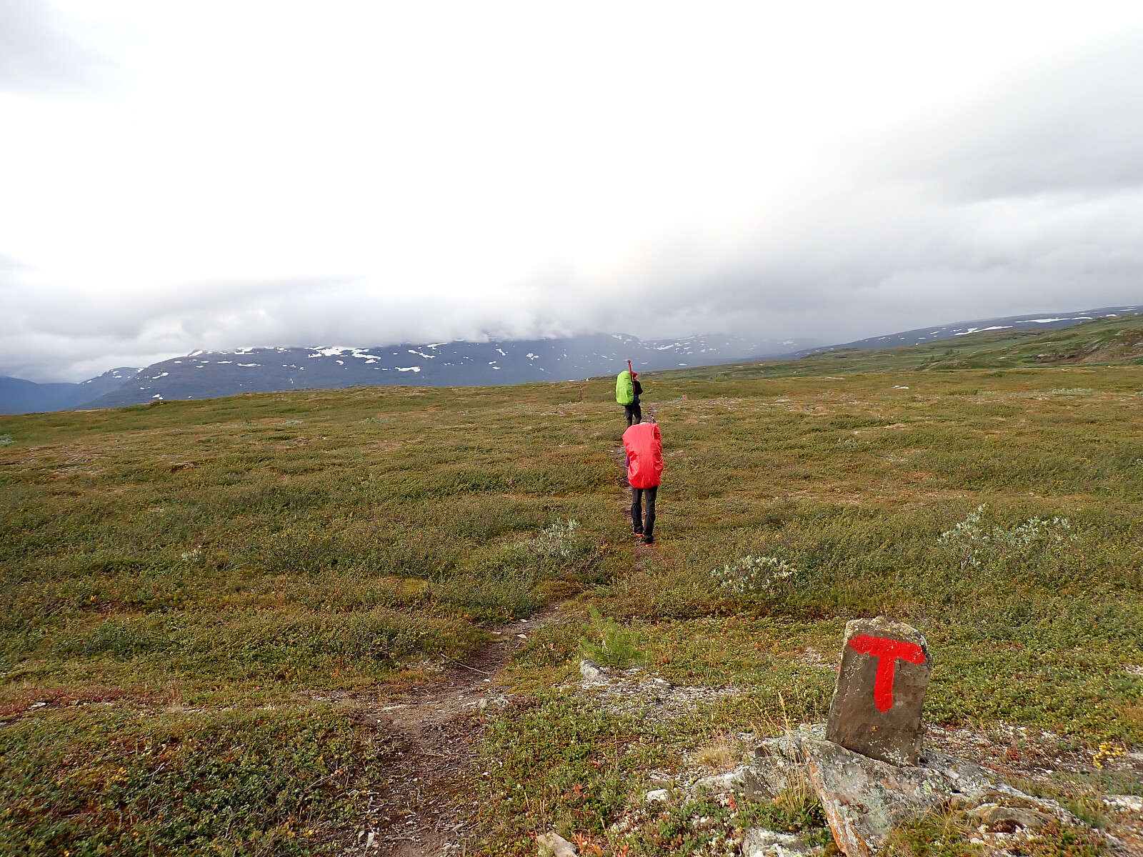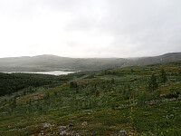 Dagen før hadde jeg og Lena blitt plukket opp på Russånes parkering av Silje og Rolf, og blitt kjørt opp til Ny-Sulitjelma fjellstue der det ble tid for middag før vi tok kvelden. Neste morgen våknet vi opp til hustrig vær, regn og tåke. Vi la i vei på grusvei til Lomvivatnet. Der veien sluttet fulgte vi godt merket sti videre til fjells. Ble en kort matpause og tåka lå tykk hele dagen, så vi fikk ikke så mye inntrykk av omgivelsene. Noen bekker/små elver som måtte forseres, men gikk greit uten å vade. Over den største var det heldigvis bygd bro. Stien gikk etterhvert nedover i terrenget til Tjalaveshytta som ligger rett ved et stort vann, da kom vi også under tåka og fikk sett litt av landskapet rundt oss. Koselig hytte der det allerede var noen gjester inkludert Kirsten som jeg og Lena kjenner fra Tromsø, hun var på vei i motsatt retning, men vi fikk tilbrakt en koselig kveld sammen på hytta før vi dro i hver vår retning neste dag.