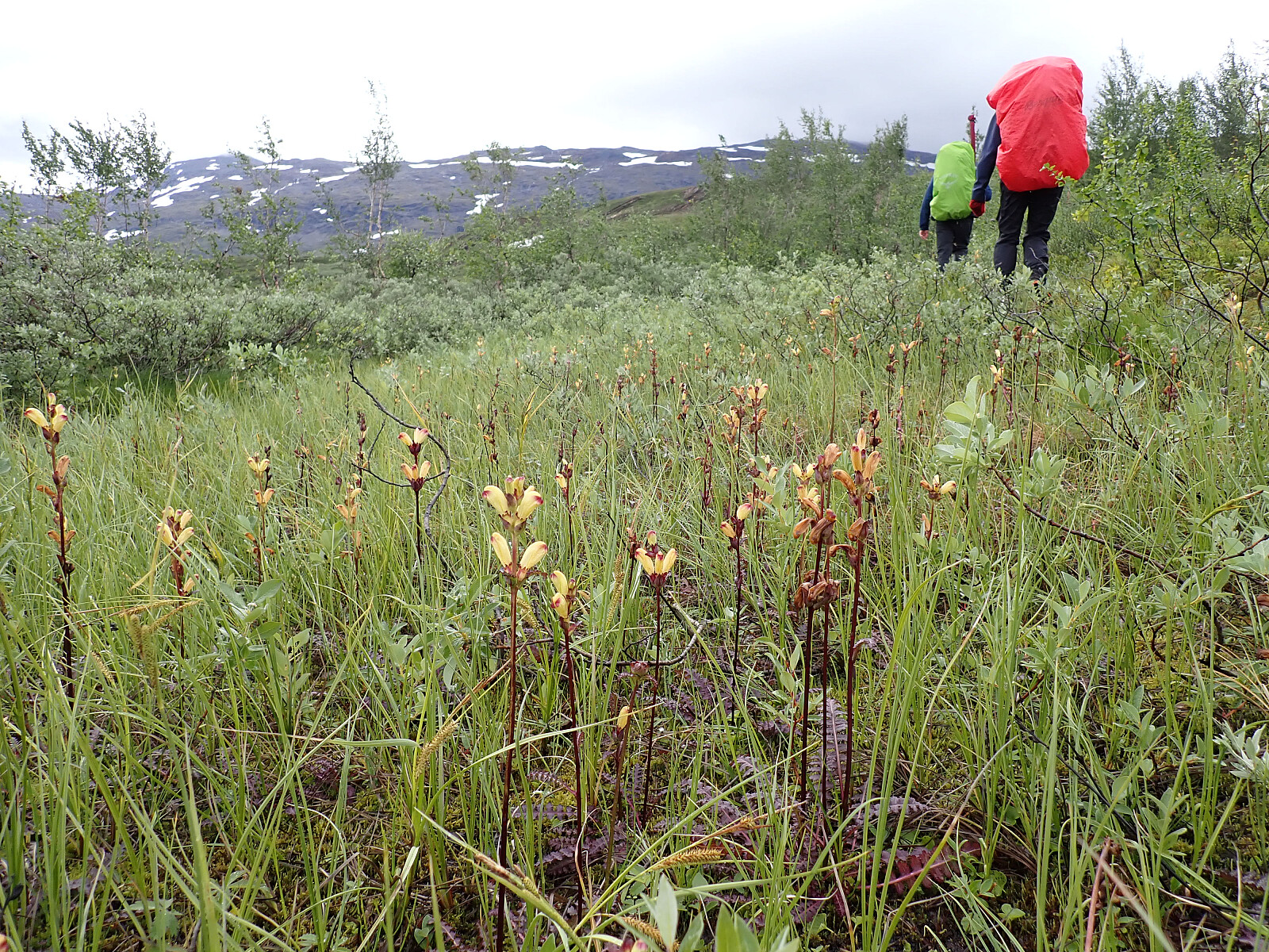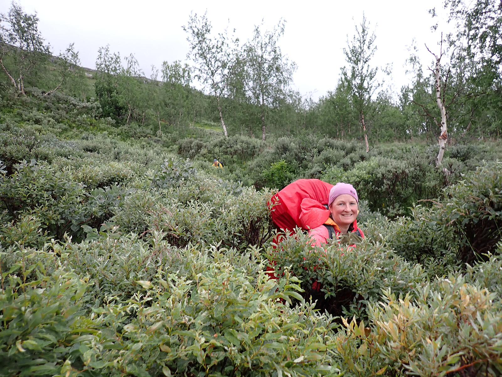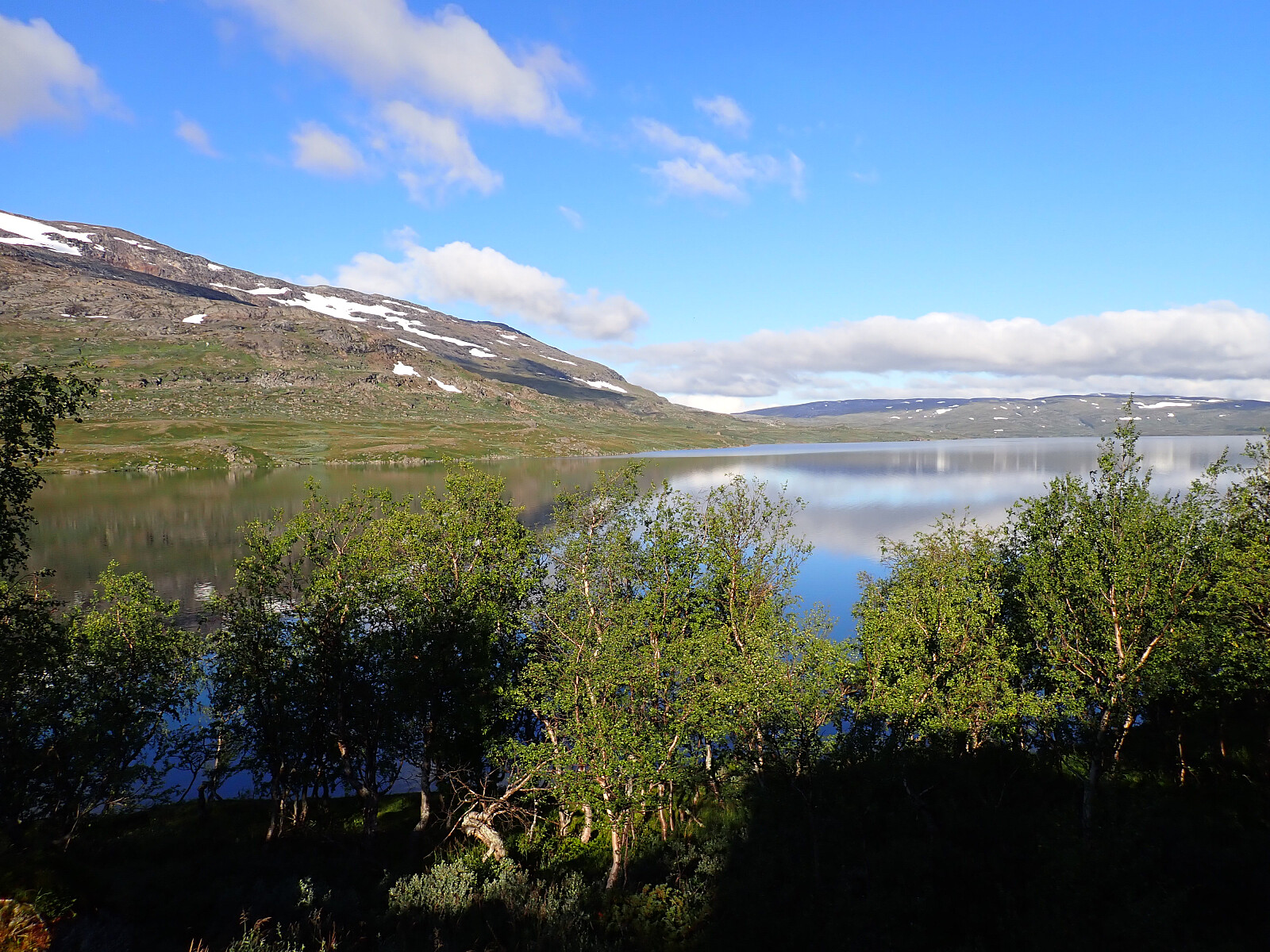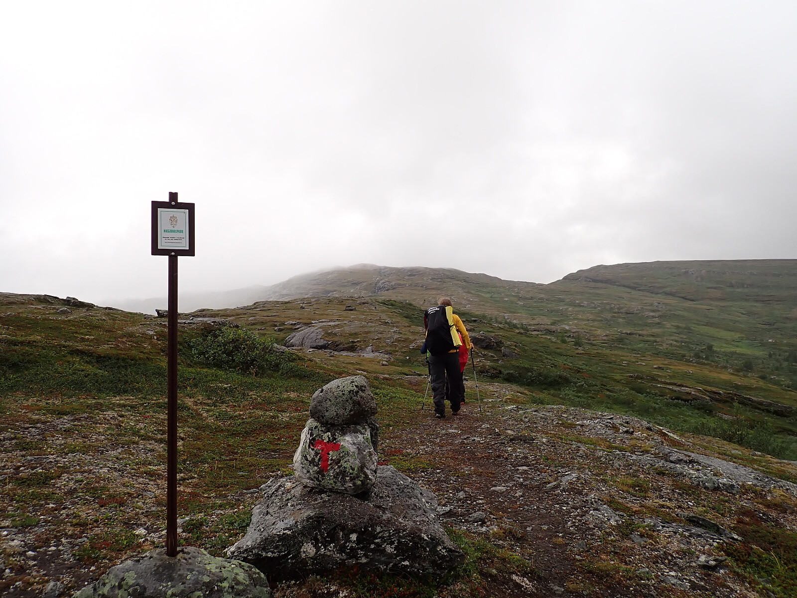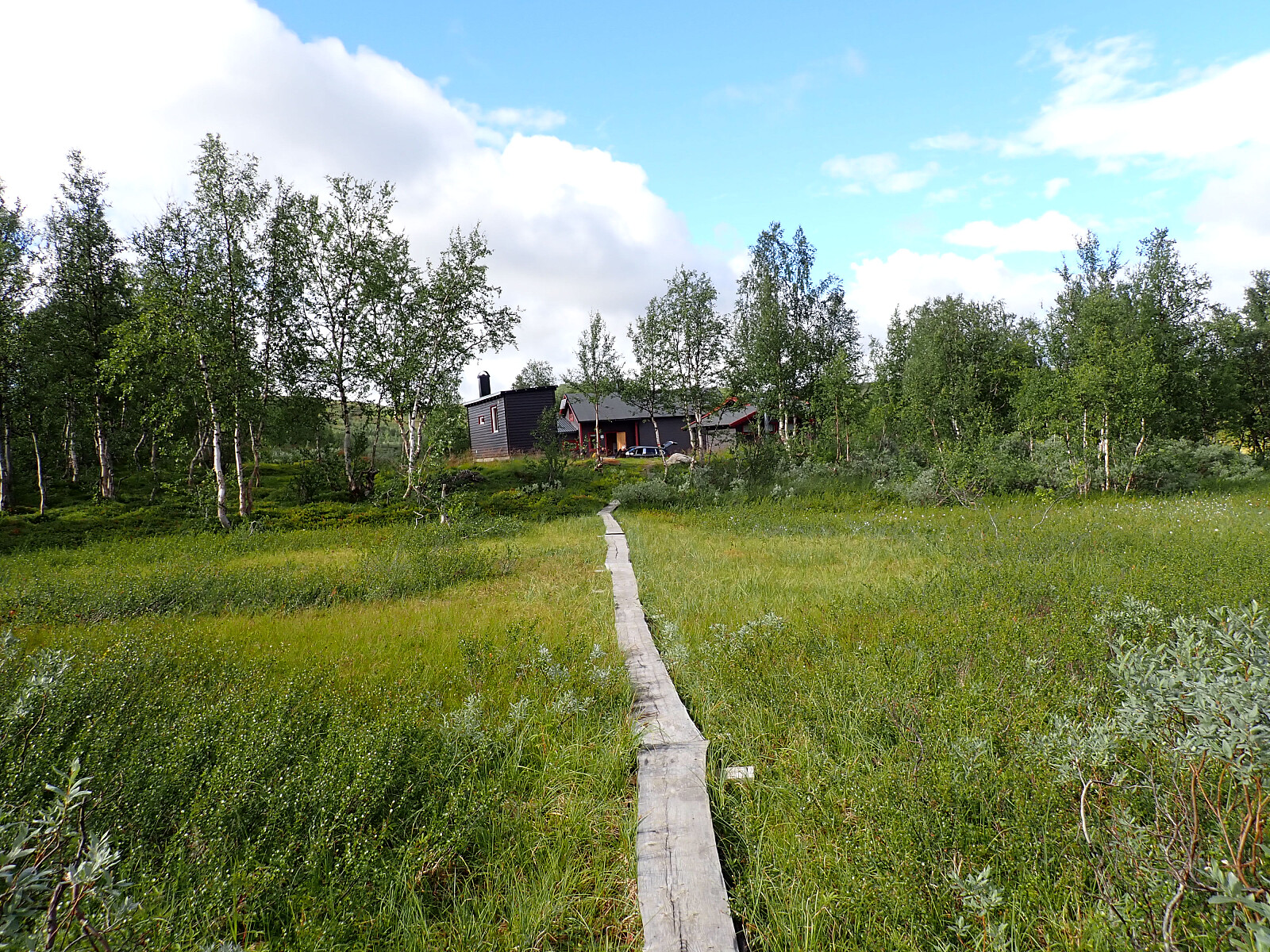 Dagen før hadde jeg og Lena blitt plukket opp på Russånes parkering av Silje og Rolf, og blitt kjørt opp til Ny-Sulitjelma fjellstue der det ble tid for middag før vi tok kvelden. Neste morgen våknet vi opp til hustrig vær, regn og tåke. Vi la i vei på grusvei til Lomvivatnet. Der veien sluttet fulgte vi godt merket sti videre til fjells. Ble en kort matpause og tåka lå tykk hele dagen, så vi fikk ikke så mye inntrykk av omgivelsene. Noen bekker/små elver som måtte forseres, men gikk greit uten å vade. Over den største var det heldigvis bygd bro. Stien gikk etterhvert nedover i terrenget til Tjalaveshytta som ligger rett ved et stort vann, da kom vi også under tåka og fikk sett litt av landskapet rundt oss. Koselig hytte der det allerede var noen gjester inkludert Kirsten som jeg og Lena kjenner fra Tromsø, hun var på vei i motsatt retning, men vi fikk tilbrakt en koselig kveld sammen på hytta før vi dro i hver vår retning neste dag.