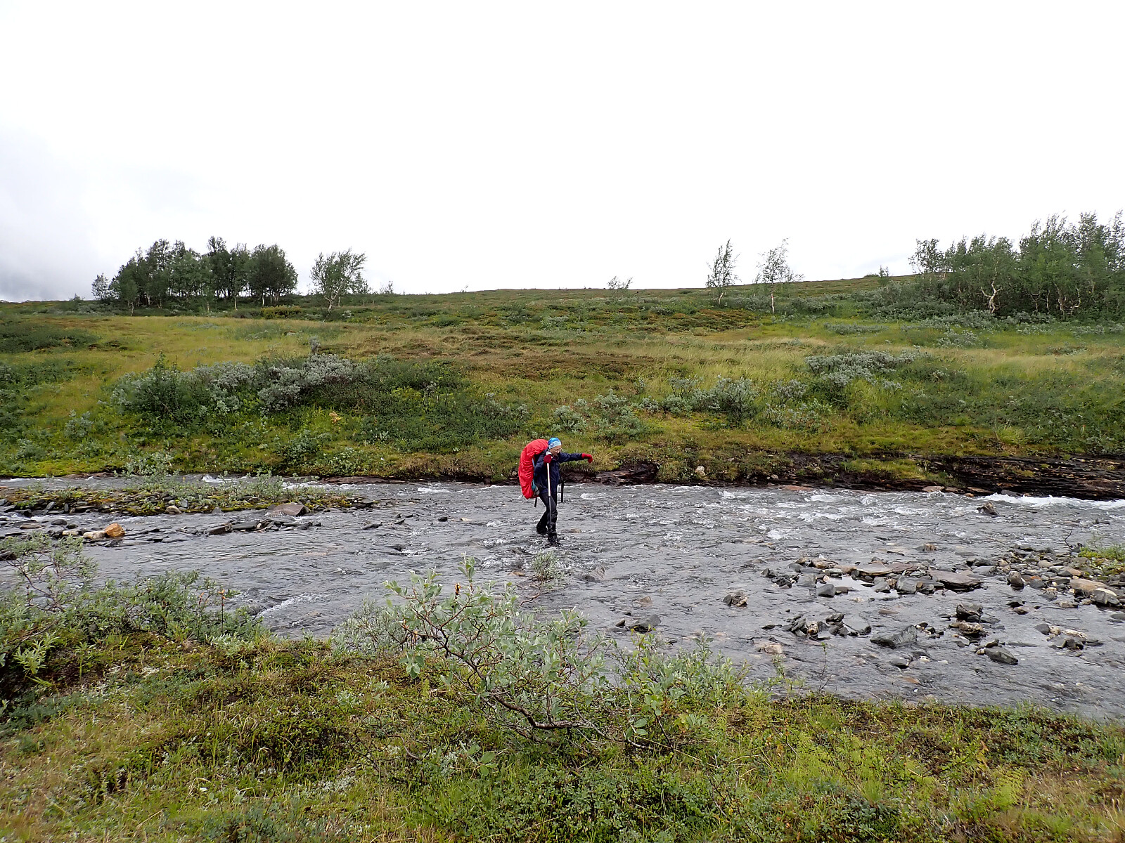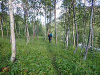 Dagens etappe gikk DNT løypa fra Tjoarvihytta til Balvasshytta, som ligger i sørenden av Balvatnet. Det var fin sti å følge i starten, åpent og lettgått terreng og lett å følge stien. Det var fremdeles lavt skydekke, så Nordre Saulo lå gjemt i tåka i dag også. Krysset broa ovenfor Fuglvatnet, og jeg mimret om den fine packraftturen jeg og Bjørn hadde for noen år siden der vi måtte bære forbi denne broa og ned til Fuglvatnet for å unngå strykene her. Ett stykke etter Fuglvatnet ble det litt mer kratt og noen ganger litt vanskelig å se hvor stien gikk, men vi fant relativt kjapt tilbake til stien igjen de gangene vi greide å miste den. Er noen vadinger etter Fuglvatnet, og Kirsten som vi møtte på Tjalaveshytta for ett par dager siden hadde fortalt om mye vann og at skoene måtte av flere ganger da de gikk her. Heldigvis hadde vannstanden gått ned så det gikk greit å beholde skoene på nå. Møtte ett utenlandskpar som hadde overnattet på Balvasshytta og skrøt veldig av den, de gikk faktisk med paraply og syntes det var praktisk, noe som er første gang jeg har sett langt til fjells. Noe klopper å gå på langs vestsiden av Balvatnet og ett par broer til. Siste bit langs bukta til Balvasshytta var utfordrende, for vannstanden i vannet var så høy at stien lå under vann. Vi måtte derfor kjempe oss gjennom høyt kratt litt lengre opp i terrenget. Det var godt å komme frem til hytta, lita og koselig og vi fikk den for oss selv. Ble god mat og en koselig kveld på hytta.