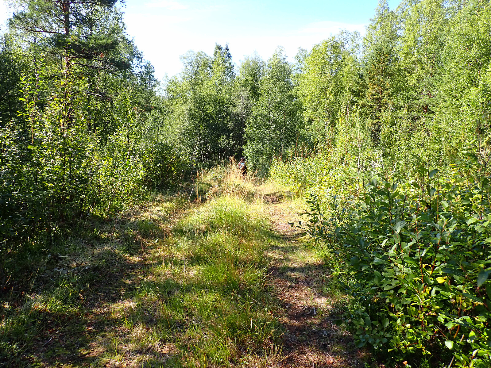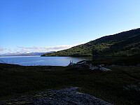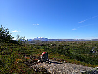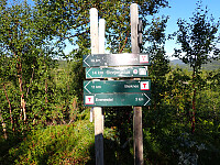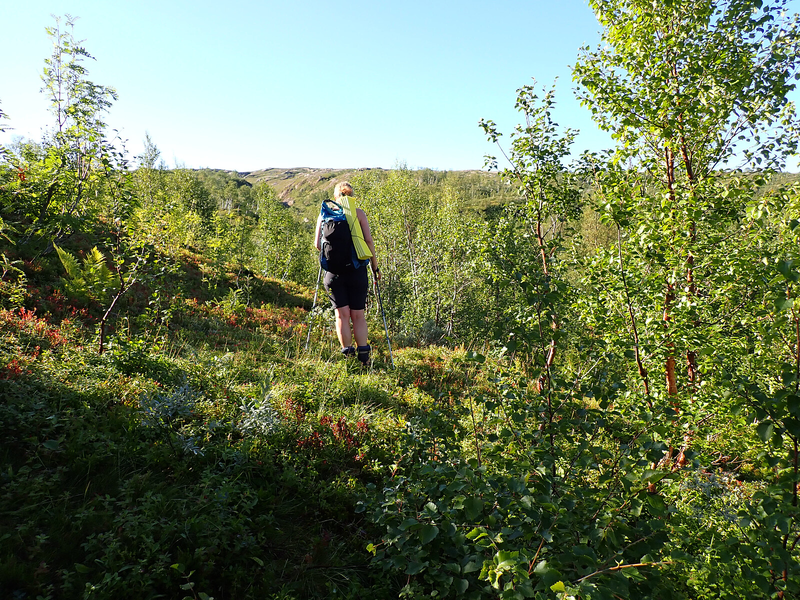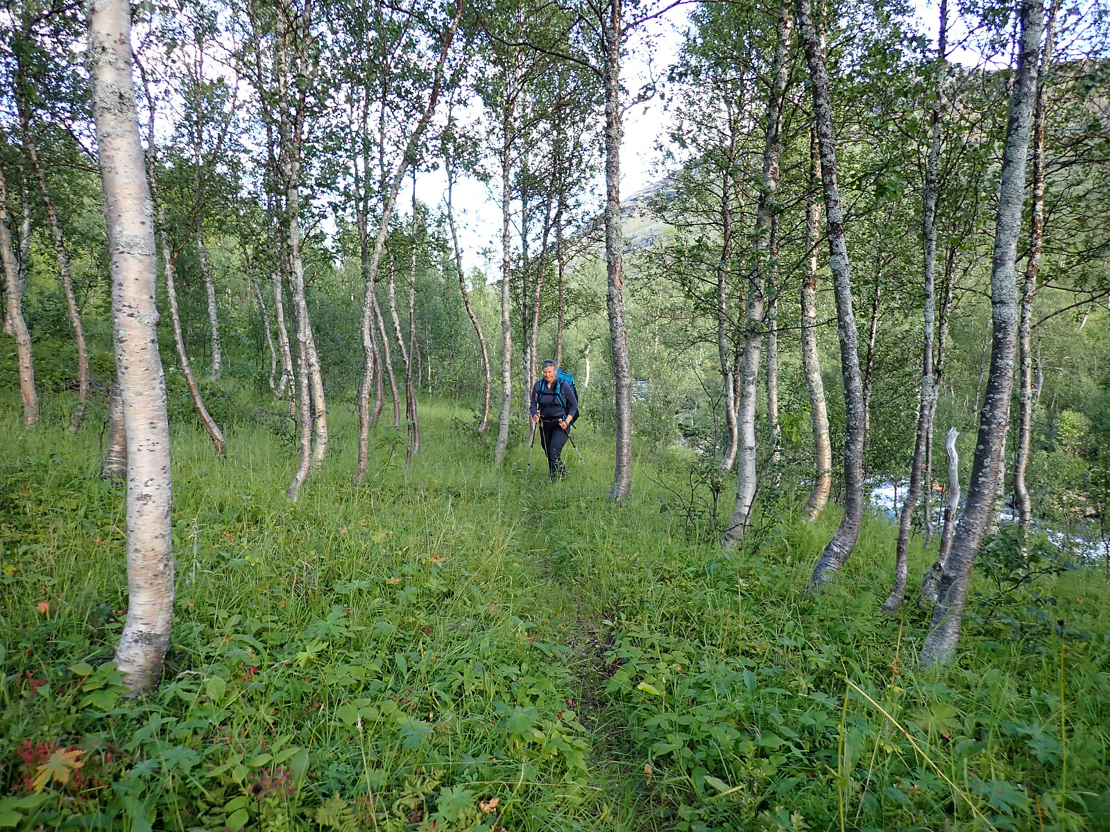 Siste dag på tur, og vi våknet fornøyde opp i lavvoen og pakket sammen før vi la i vei mot Russånes. Et lite stykke langs veien før vi tok inn på DNT sti. Vi fulgte skilt mot Bleiknes. Først over elva på bro, så bratt oppover lia i skogen. Det var en fin dag, og godt og varmt å gå oppover. Kom oss opp i høyden og over tregrensa. Var flere stikryss, men de var godt skiltet i starten, så lett å finne rett sti i stikryss. Det ble en større utfordring etterhvert når vi begynte å bevege oss nedover igjen, da måtte vi se nøye etter de røde merkene for ofte så forlot de den godt synlige hovedstien og over på en mindre brukt sti som vi ikke la merke til at var der, mange stier her og ingen skilt så gjaldt å følge med på merkinga. Siste bit var det mange høydemeter som skulle gås nedover først på sti og siden på skogsbilvei og så ned til asfaltvei parallelt med E6. Gikk over broa ved Skjelgånes og fulgte veien til Russånes parkering der bilene sto. Her tok jeg farvell med Lena som kjørte sørover, og kjørte en tur til nærmeste butikk for å proviantere litt før neste dags tur innover saltfjellet. Overnattet i bilen på parkeringsplassen.