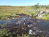 Dette ble turens fineste etappe. Jeg og Lena tok avskjed med Silje og Rolf som skulle gå videre sørover mot Argaladhytta. Vi skulle vestover og måtte da gå tilbake samme veien som vi kom i går ca 7 km til stidele ved Daudmanselva. Her går det sti mot Storengan, 14 km. Det var mye bedre utsikt i dag, fjellene kom ut fra skyene og både Nordre Saulo og Suliskongen ble observert. Det var tungt opp fra krysset og ikke alltid lett å se hvor stien gikk, den var tydelig mye mindre brukt enn der vi gikk tidligere, og mange steder ikke synlig, så da var det å speide etter merker og varder og rødmerking som ikke alltid var like synlige. Fint terreng å gå i i dalen før det ble bratt opp mot Tverrfjellvatnet. Her var det noen varder som hadde fått hard medfart og ikke var lette å se. Veldig fin utsikt og fint å gå langs Tverrfjellvatnet. Bratt men lettgått ned til storengdalen. I storengdalen var det fint å gå, og vi gikk innom Tjelmagammen som ligger like ved stien og som de holder på å restaurere. Kom inn i skogen etterhvert og fulgte litt blanding av sti og firhjulingsspor langs Tverrelva ned til Storeng Fjellgård der vi hadde bestilt overnatting i en lavo da hytta her må bookes på forhånd og var allerede booket da vi tok kontakt. Veldig koselig vertsskap på gården så vi fikk komme inn i hovedhuset og lage mat der. Pratet lenge med vertsskapet før vi gikk opp i lavoen som var satt opp like bak huset og la oss for natten.