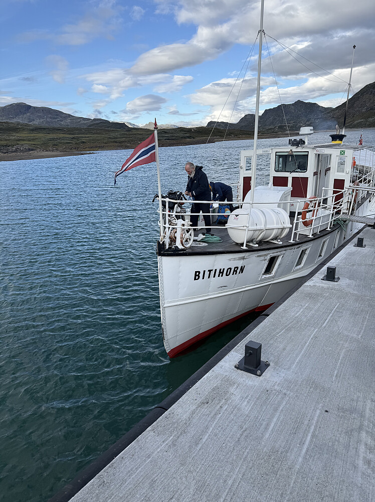 Kjørte opp til kaféen på Valdresflye fredag kveld og la meg i teltet et par hundre meter fra veien. Stod opp tidlig, heiv innpå litt kaffe, egg & bacon før jeg satte meg på sykkelen og trilla ned til Bygdin. Optimalt skulle jeg sovet på Torfinnsbu, men siste båt inn fredag gikk for tidlig og første båt inn lørdag går "for seint", men lite å gjøre med det.