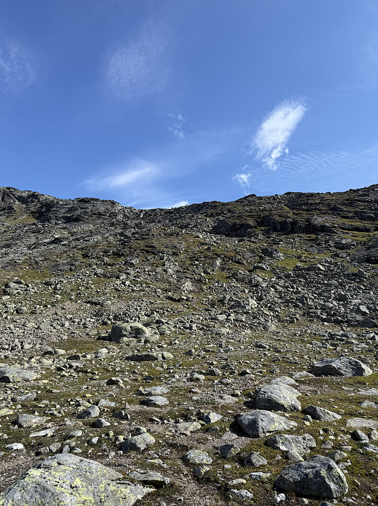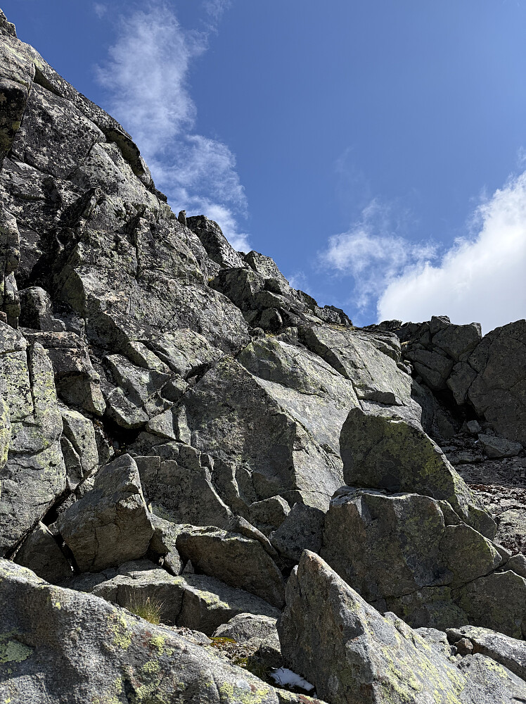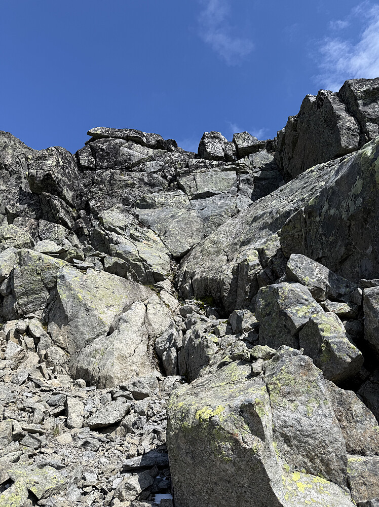Nesten oppe ved bandet tar jeg en kikk på veien videre. Herfra synes jeg eggen ser noe kjei ut med en god del store blokker. Det ser sikkert verre ut på avstand enn det er og jeg skulle ønske jeg ga det et forsøk, men her tar jeg valget om å trekke ut i vestsiden til høyre for ryggen. Det valget angret jeg bittert på senere da det var mye kaving i løs ur før jeg til slutt kom meg opp på eggen igjen litt lenger opp mot toppen. Tapte mye tid her.