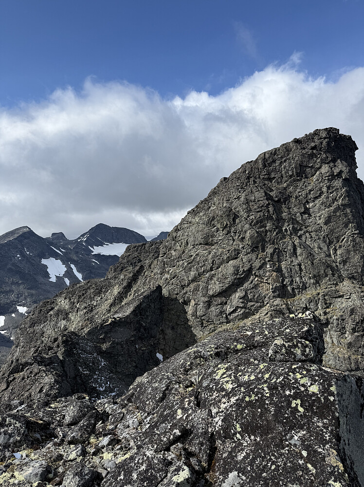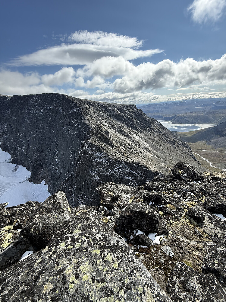 Hadde ikke med tau på turen og trakk derfor ned i renna vest for hovedtoppen. Jeg syntes det var vanskelig å finne veien videre, mer spesifikt når jeg skulle trekke ut av renna igjen, men jeg fant et slags hyllesystem jeg fulgte til det jeg vil anta er bunnen av den rød trekanten til Helgesen. Her var det en liten hammer mellom meg og eggen videre jeg skulle ønske jeg fant en trygg og akseptabel løsning på, men den var akkurat for grov til at jeg tok sjangsen og måtte derfor trekke lenger ned i sida igjen. Her kavet jeg en del med å finne veien opp igjen på veggen og måtte på et tidspunkt nedklatre ganske langt etter å ha tatt et lodd opp noen formasjoner som jeg til slutt ble stående fast på. Noe forhøyet puls der, men jeg kom meg til slutt trygt ned og litt lenger bort fant jeg en bedre vei opp på eggen igjen.