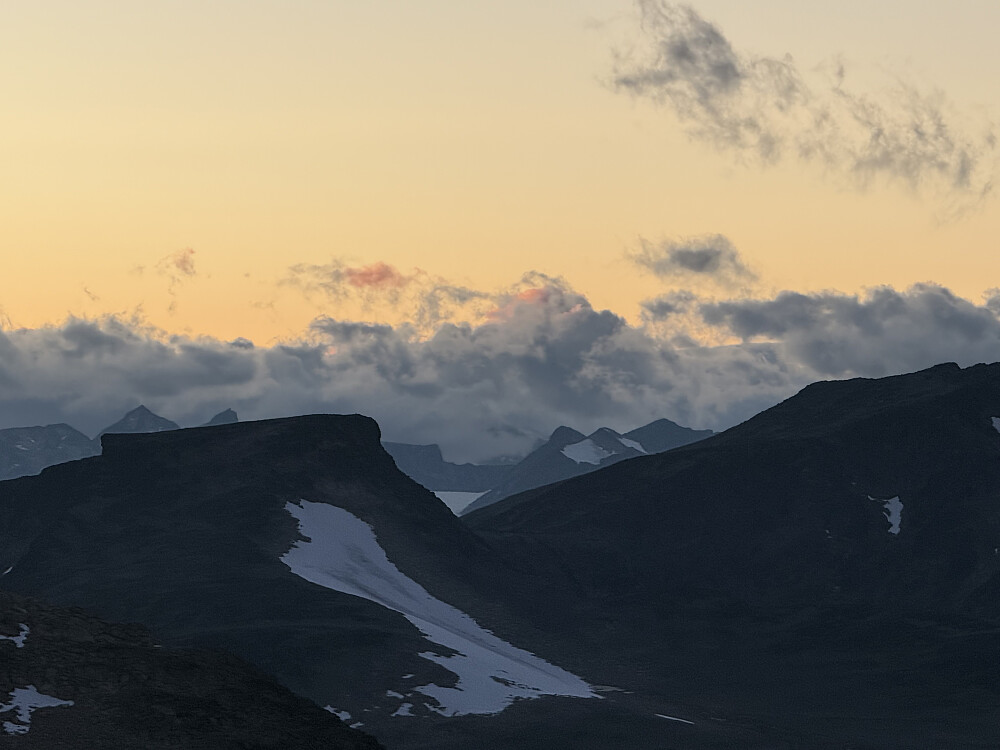 Vel oppe på Vestraste Kalvehøgde var alt det vanskelige unnagjort og nå var det i grunn bare å sette i marsj og plukke topper. Veloppdratt steinur som stort sett lå i ro der jeg hoppet av fra stein til stein bortover. Satte fra meg sekken før tur/retur til Nørdre Kalvehølotinden og senere tur/retur Munken. Bomturen opp eggen til Leirungskampen og all stukingen bortover eggen der hadde kostet mye tid og sola gikk ned litt før jeg ankom Rasletind. Det ble en liten strek i regningen da det betød betraktelig mer knotete retur til Valdresflye med leting etter varder og sti i steinura. Men man kom da ned til slutt og det var særdeles godt å knerte colaboksen ved bilen klokken 0030, sliten og fornøyd med 17 nye topper i boka.