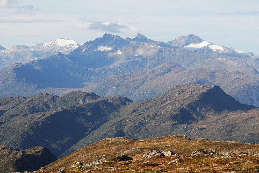 Kjente fjell dukker opp; Fra høyre Skjorta, Ryssdalsnebba, Skrommelnebba og Fløtatind.
