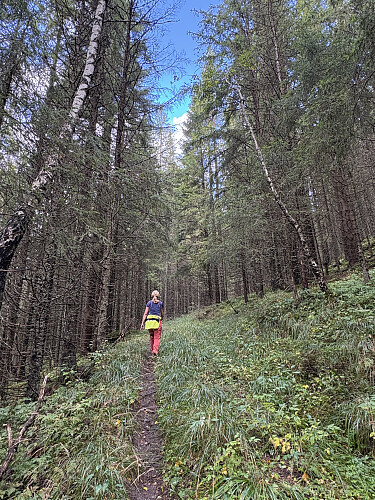 Vi kjørte opp fra Fåvang sentrum og nesten til veis ende ved Mjogdalen. Like ovenfor der hvor den merkede stien gikk opp fra var det en liten parkeringslomme hvor det er plass til en bil. Else satte opp et imponerende tempo oppover lia med et klart ønske om å rekke flere turer denne ettermiddagen:) Vi stoppet opp litt da vi var kommet opp på selve ryggen for å nyte utsikten og villskapen i stupet ned mot Oppsaldalen i øst. Utrolig flott! Vi fulgte kanten av stupet et stykke oppover før vi gikk inn på stien igjen.