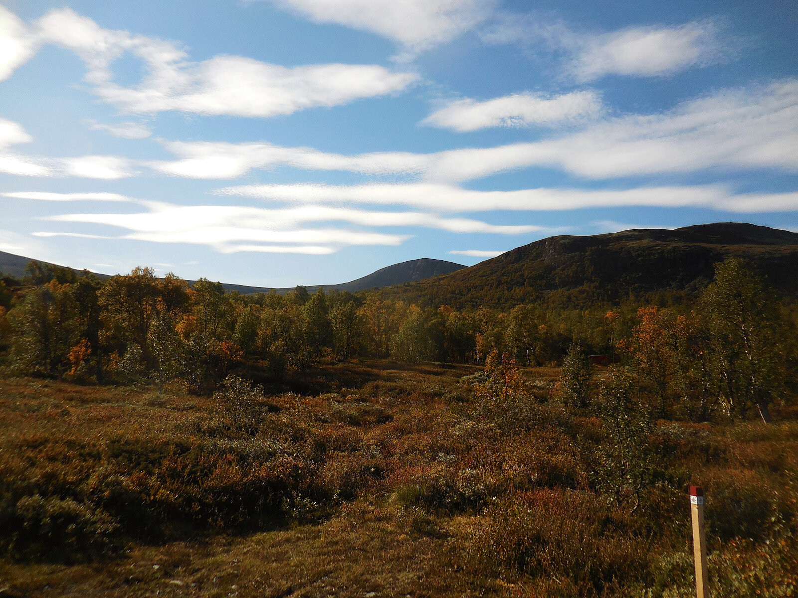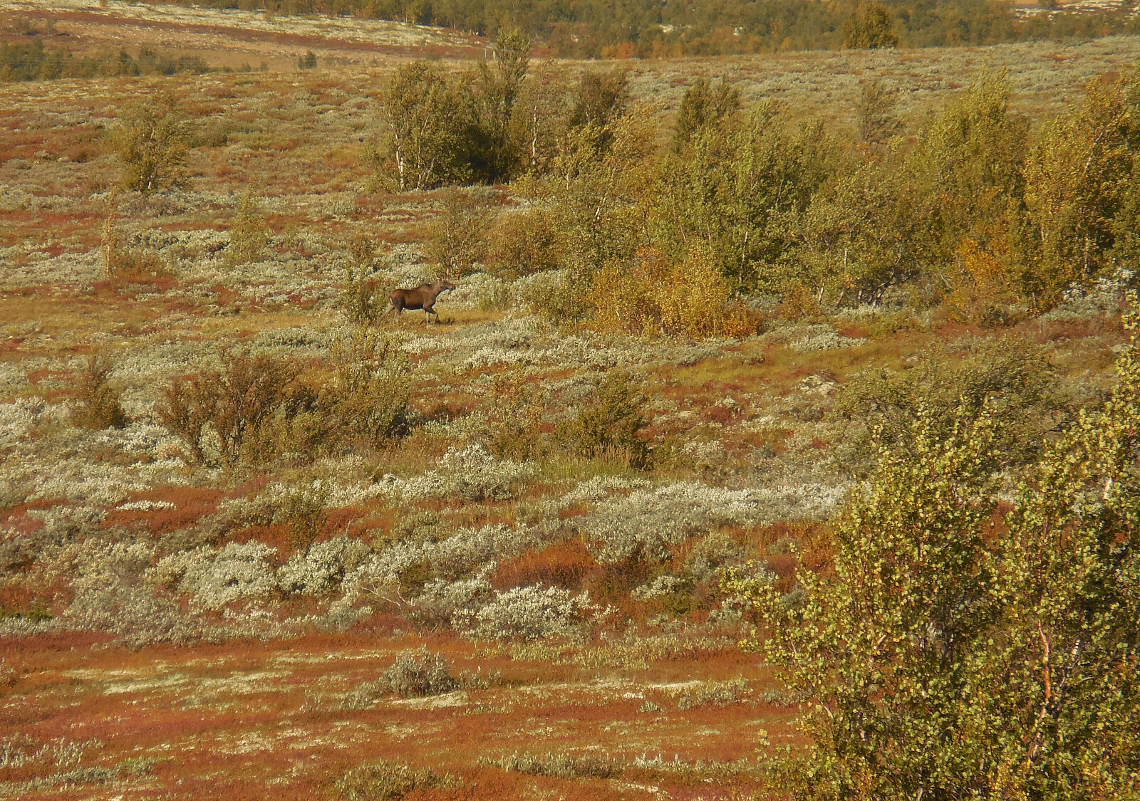 Tur med Turid. Sterk vind i høyden. Høstfargene er i ferd med å komme. Vi ser noen fjellryper samt 3 elger på turen.