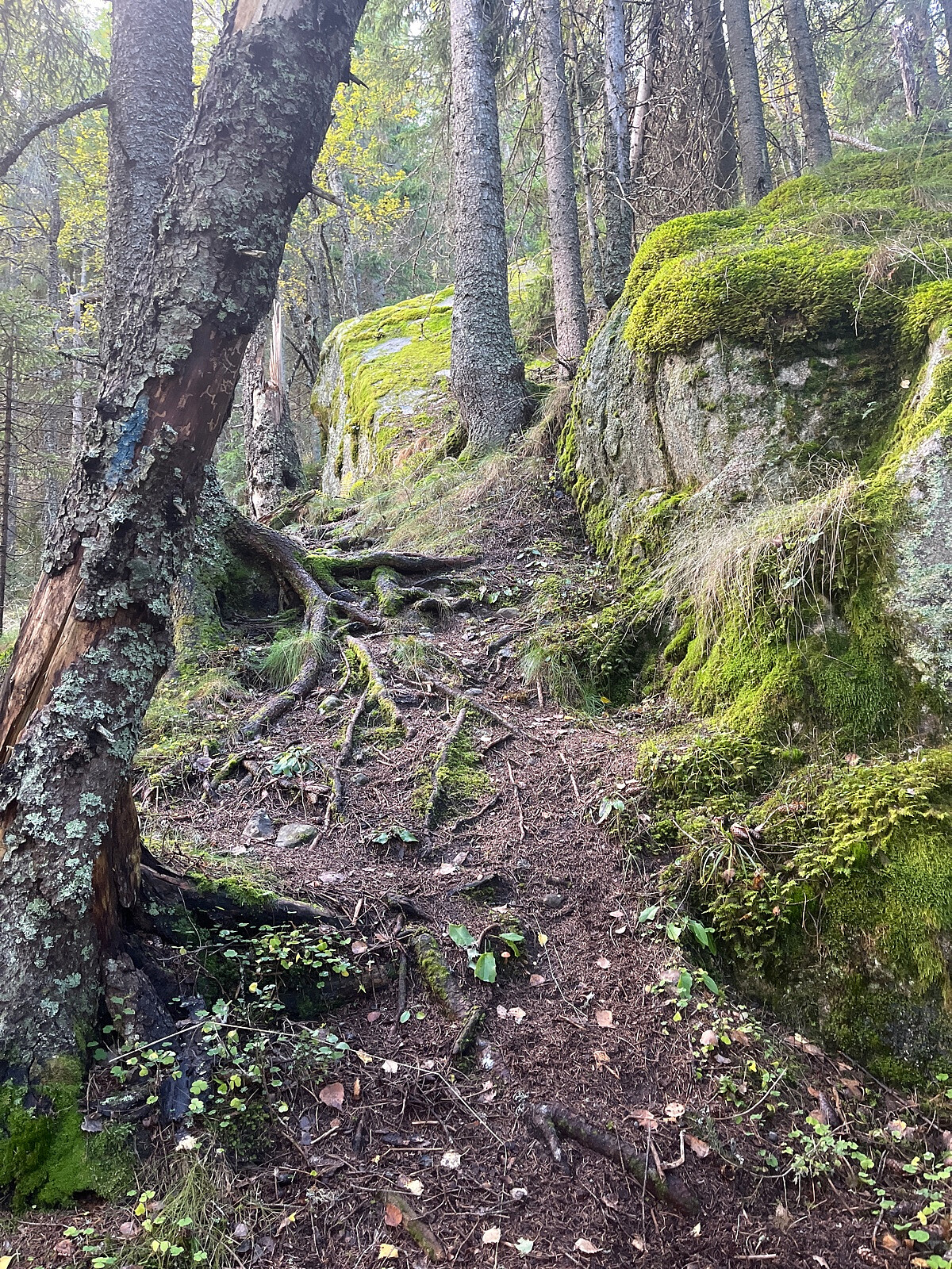 Og så var det slutt på vei og stien fortsatte rett frem og ble snart bratt