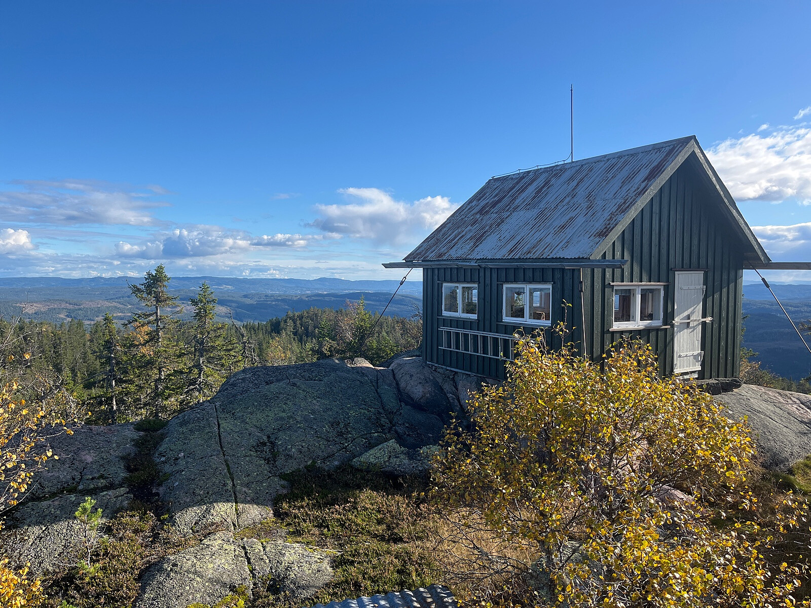 Fra toppvarden på Fjøsvikfjellet mot Skarkollen (709 moh) med Fjellhytta