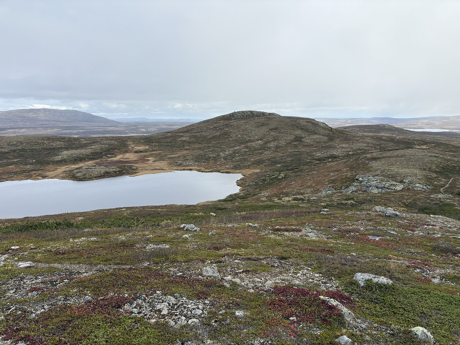 Selv om det er noe bratt var det greit å gå ned østsiden retning Risåhøgdene. Jeg fant en fin rute hvor jeg stort sett unngikk kratt og vier og snart sto jeg på toppen av Risåhøgda SV. Selve toppen var ikke så spennende i seg selv, men artig å se tilbake mot Nonstjønnkampen fra denne kanten.