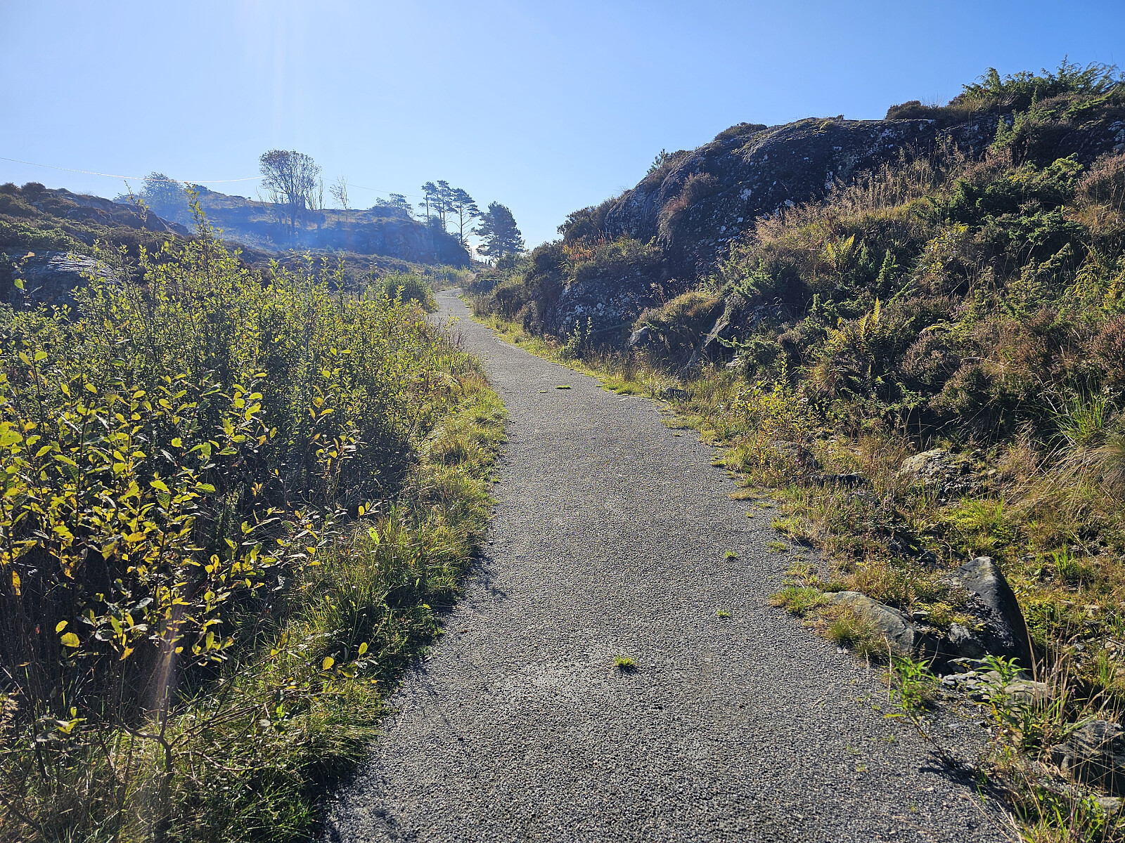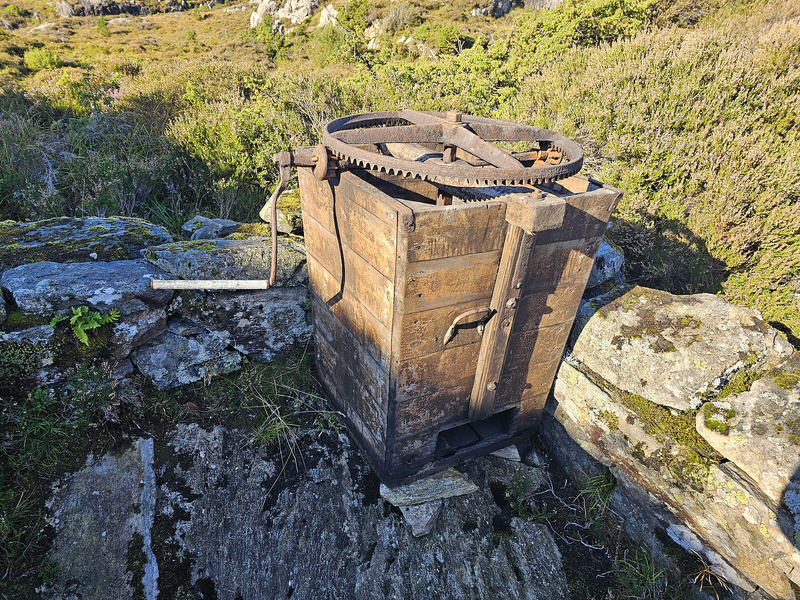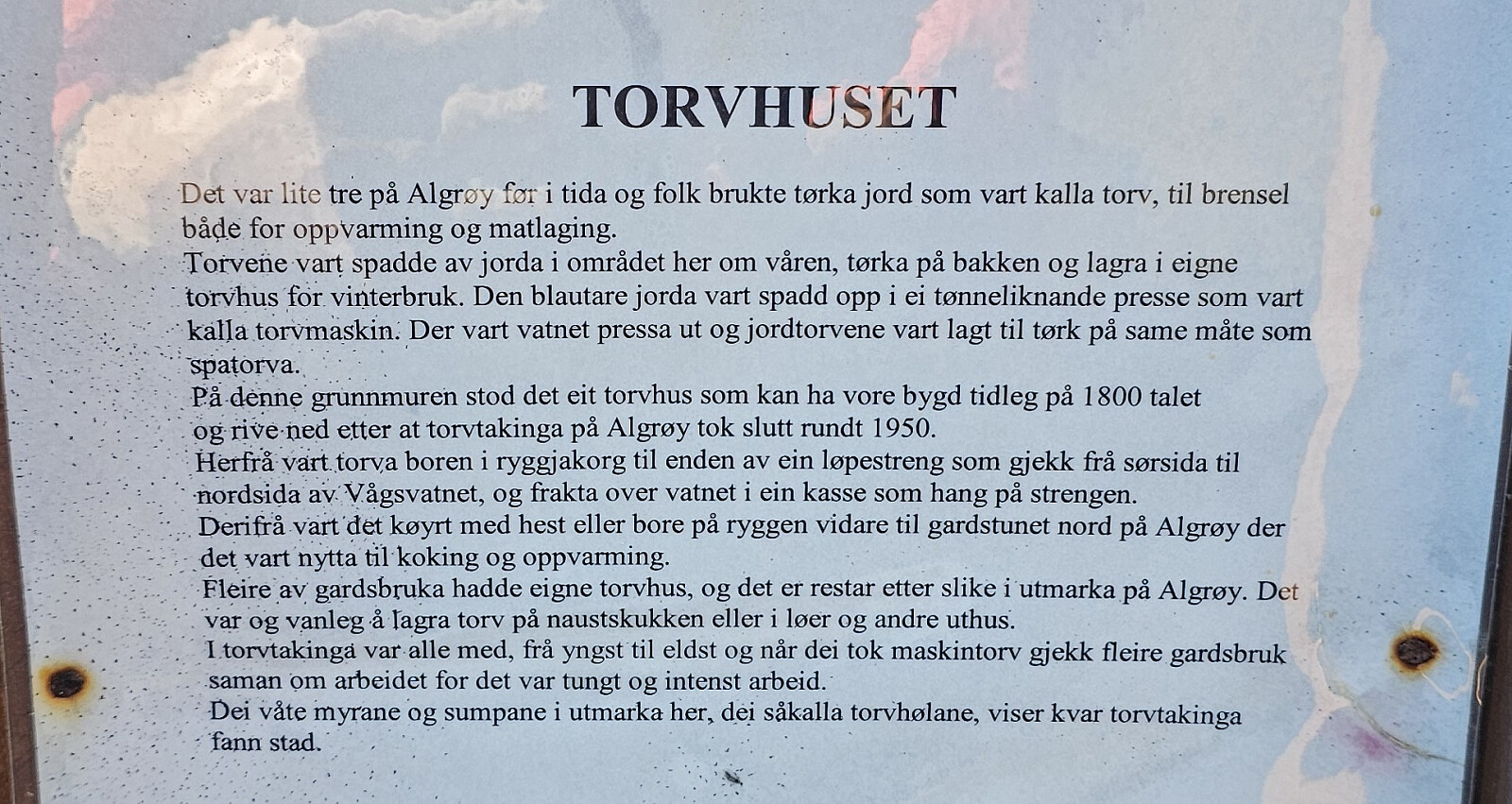 Kjørte ut til Øygarden og over broen til Algrøyna og parkerte på Algrøyna Parkering. Gikk sydover først på gruset gangvei til en hytte, derfra på godt merket stil til toppen på Hillefjellet. Her er det flott utsikt alle veier. På vei ut passerte jeg restene etter et gammelt torvhus. Innfor murene står det en gammel kasse med sveiv, tannhjul og kniver inne i kassen. Formål male opp torven og presse ut vannet.