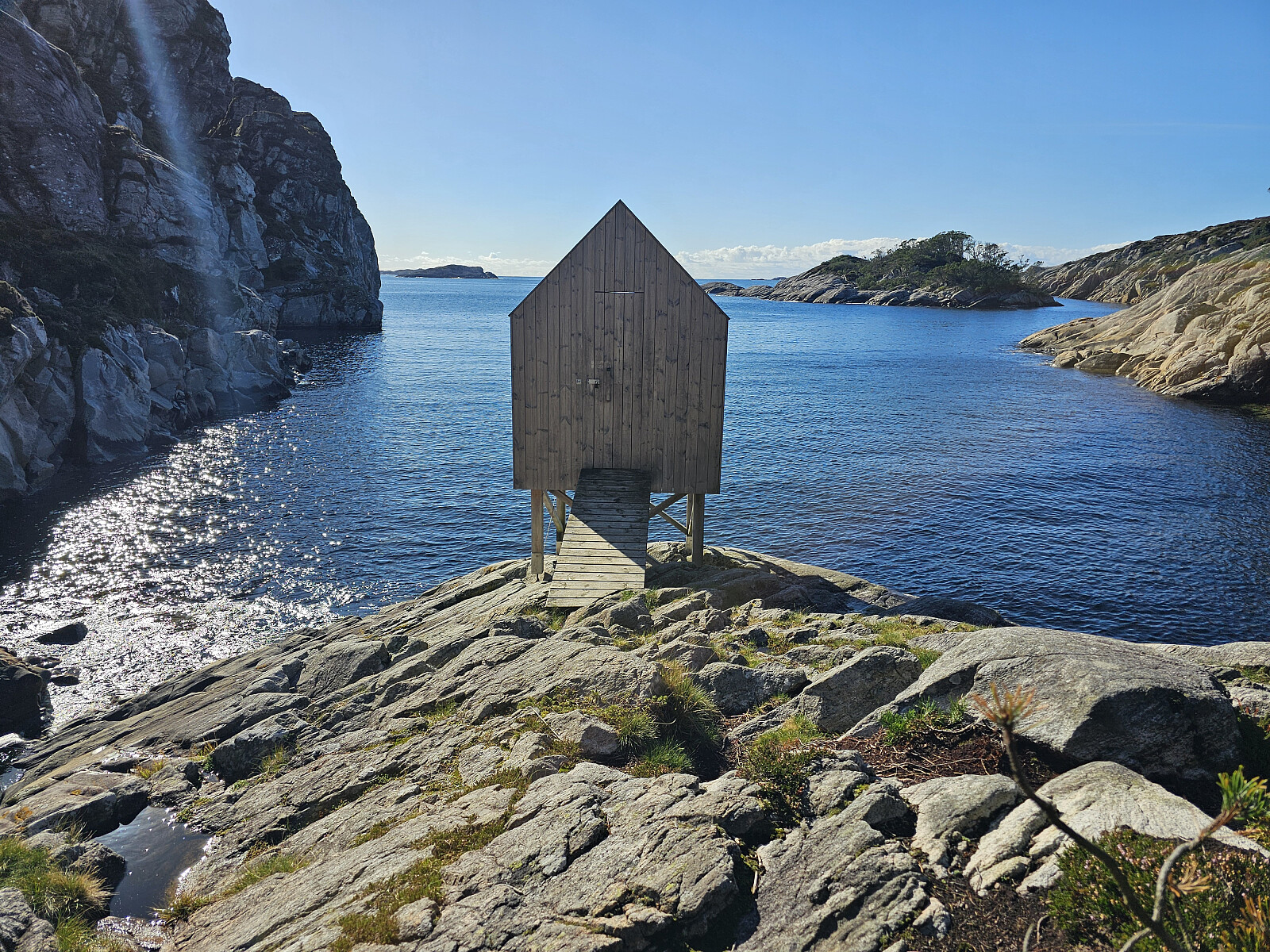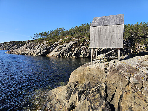 Videre vestover mot Sandeie som er dagens turmål. Måtte passere Illeidet, et dalsøkk med myr og tett krypfuru. På vei ned så jeg en liten hytte som står på påler helt i sjøkanten. Tok turen bort til hytten som var låst med kodet hengelås. Ser nå i etterkant at dette er en av 2 slike utleiehytter for medlemmer i Foreningen Nullmeteroverhavet plassert i Øygarden.