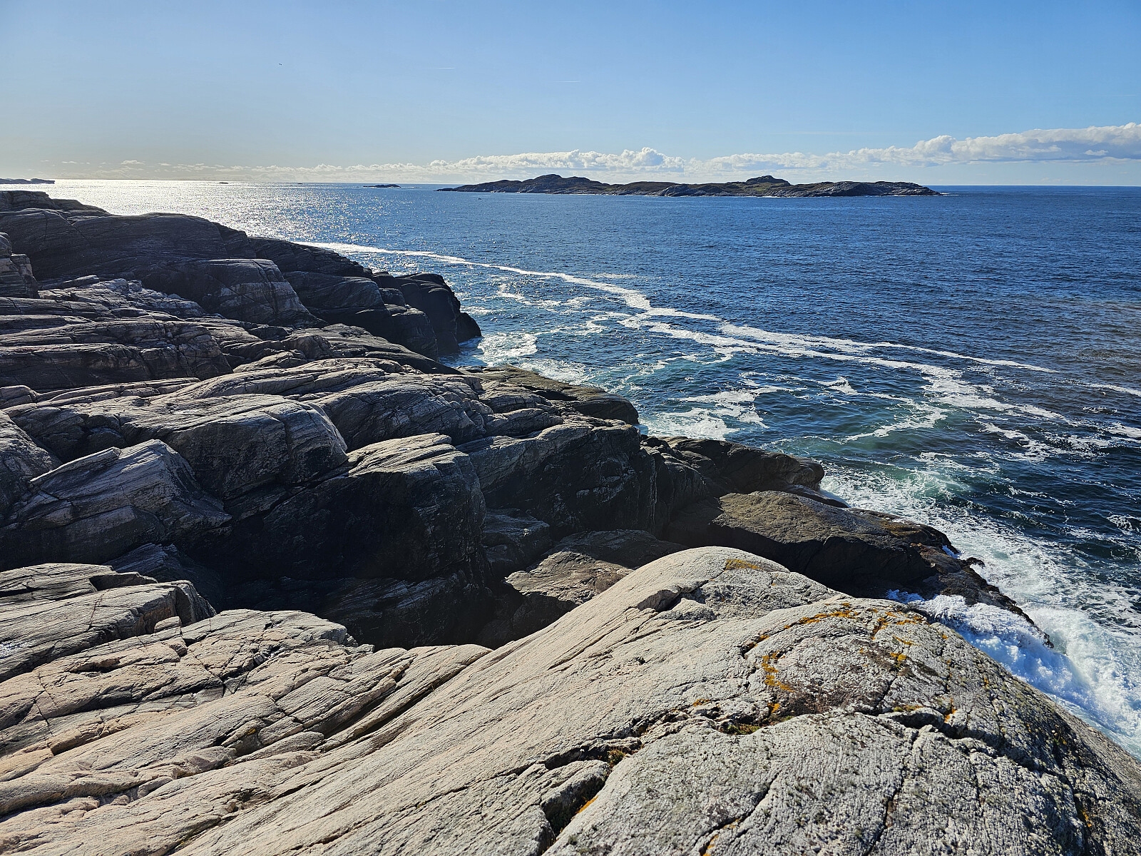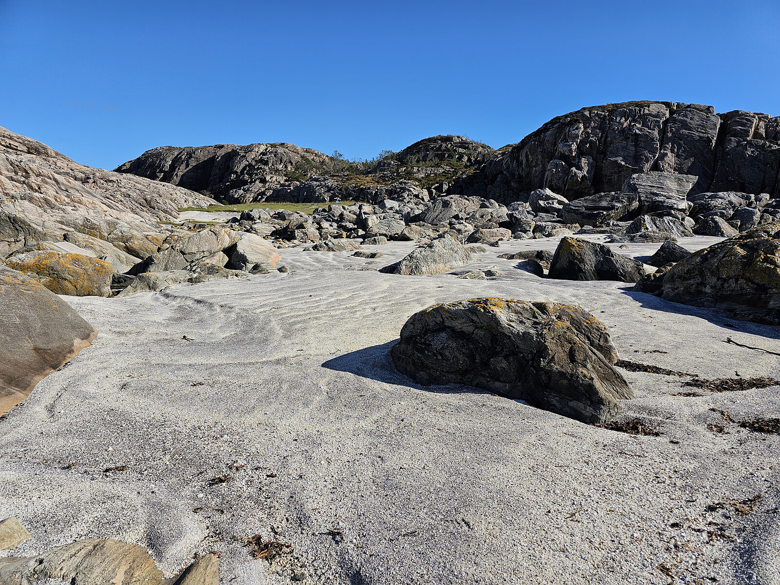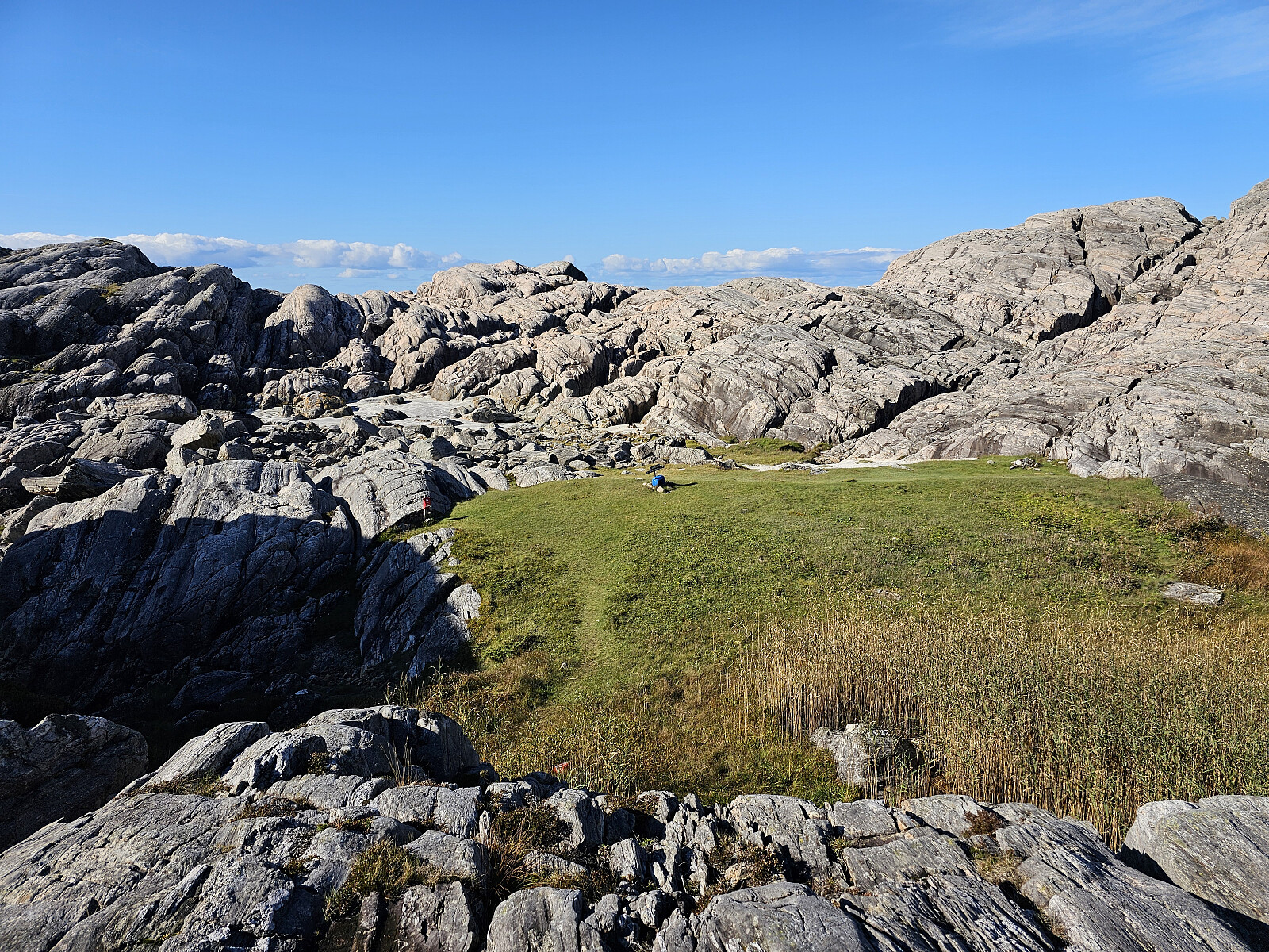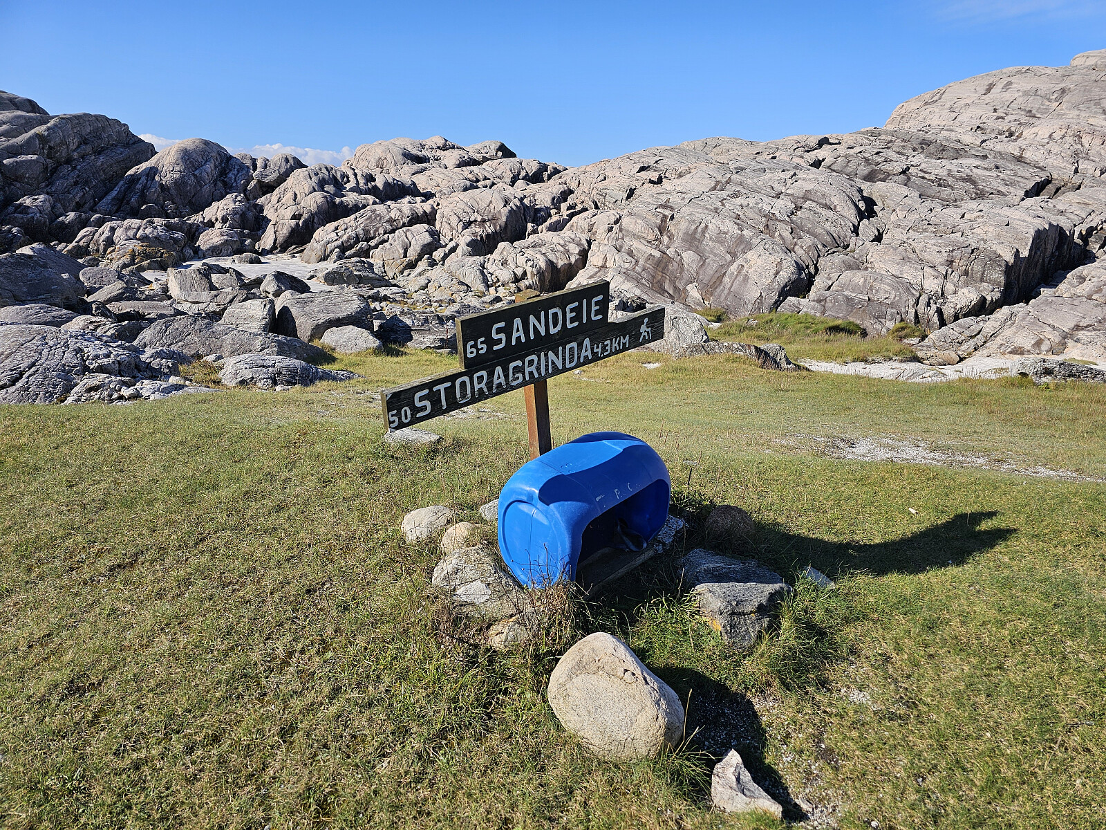 Videre ut til Saneide. Fortsatt merket sti men terrenget var nå mer kupert med småskog og myr med søle og knauser. Er lagt ut en og annen plank i blaute partier men de lå ikke i ro da jeg prøvde å komme over. Men turen ut til Sandeie er verd strevet. Her er det et spesielt landskap, grønn plen med skjellsand omkranset av bart fjell som beskytter mot storhavet. Tok turen opp på en av knausene som har navn Barmen. Fjellet har 3 kløfter som er fylt med stor stein indre del. Gikk over en og hørte at skjøen vasket under steinene. Regner med at det er her sjøen har skylt inn skjellsanden.