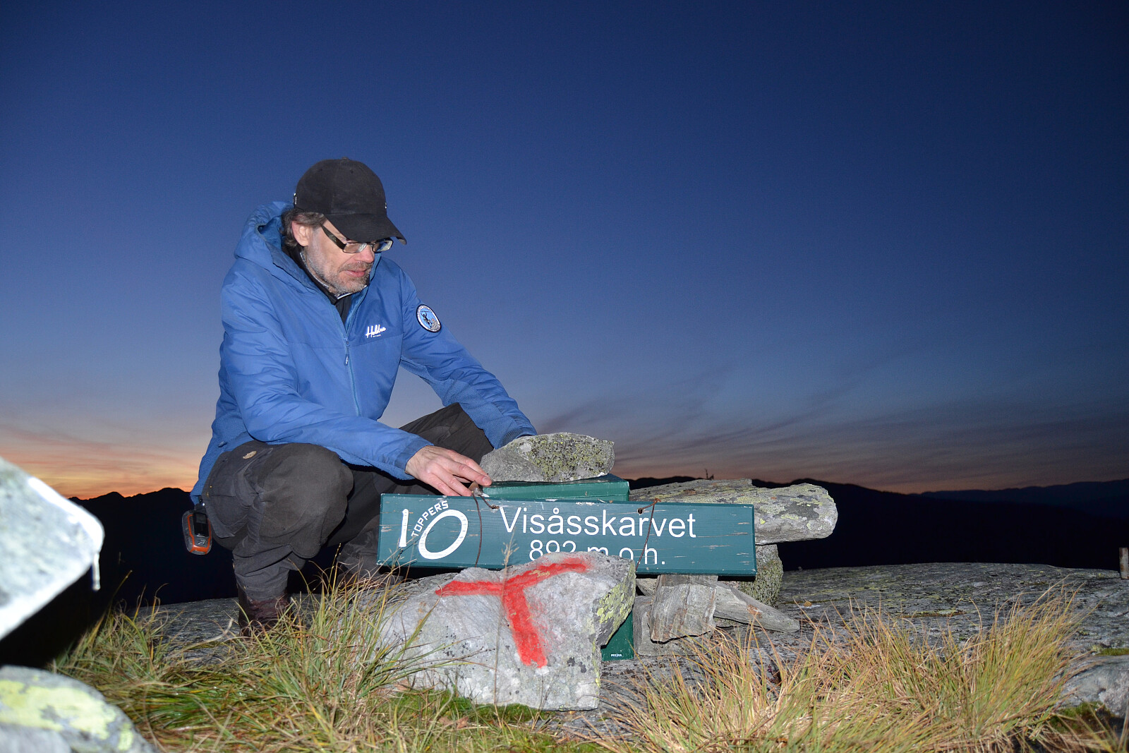Oppstigningen opp langs en merket traktorvei med videre sti til toppen, ble dagens mest våte opplevelse. Her var det så bløtt det kunne bli, så her gikk det ikke annet enn å bli kliss våt. Jeg var spent på om jeg ville rekke siste stripe av kveldssol på toppen, men det ble en seig oppstigning den siste halvdelen. Kom opp 15 minutter etter at jeg så siste glød forsvinne over toppene i øst. Ble på toppen i 20 minutter før jeg gikk ned igjen med lykt. Det gikk nokså seint ned igjen i mørket på den ujevne, steinete stien med slitne bein. Særlig i det bratteste i starten på nedturen. Merket også at jeg hadde spist litt for lite i løpet av dagens turer. Men målet var nådd, og var godt fornøyd med det.