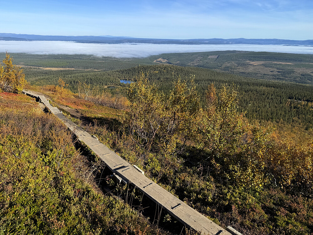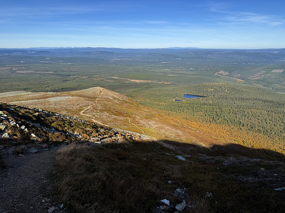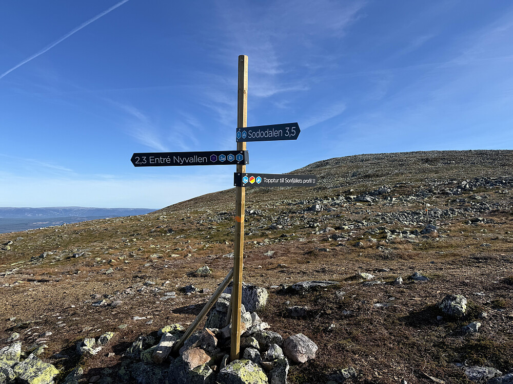 Det er to populære utgangspunkt for å nå toppene på Sonfjellet. Enten å kjøre Hedeviken-Nyvallen eller Hede-Nysæteren. Jeg valgte Nyvallen som mange andre gjorde i dag. Turistvennlig opplegg med bred sti og godt skiltet. Fulgte først merket rute til Sonfjellets profil (1247). Fjelltoppen er godt synlig fra E84. Fortsatte over nordtoppen (1265) og måtte litt ned. Underveis var det mye stein og lite grønt. Videre opp siste kneika til Høgfjellet (1278). Fikk øye på Helagsfjella og Storsylan i nord. Returnerte til stien som går innom Sododalen Stuga. Avsluttet småbratt ned korteste rute som faktisk var veldig fin uten stein. // Med utgangspunkt Nysæteren er det merket rute til høyeste punkt (7 km en vei).