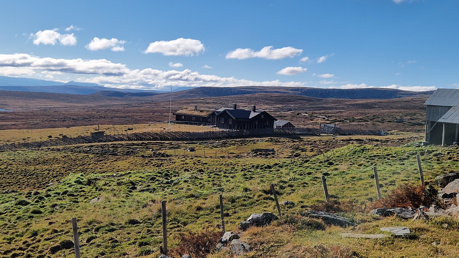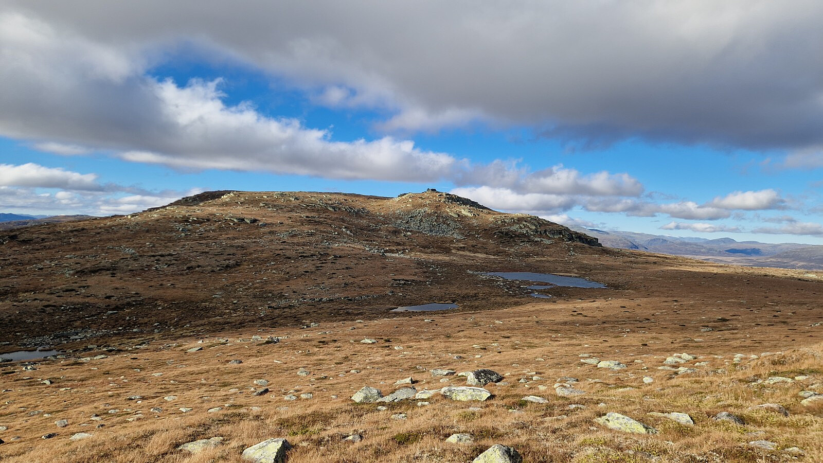 Fin rundtur i Øystre Slidre. Ein må komme seg ut av den for tida mørke dalen i Lærdal, og få seg litt sol-timar. Det var mange stiar rundt om i terrenget. Eg satsa beint på grøn nål som fyrste. Sti opp til fjellfoten. Så vart det utan sti fram til siste toppen. Sett bort frå eit lite strekk med raude T-ar. Sti heile vegen nedatt til stølen. Det var fint å gå oppå fjellet. Berg og dalbane mellom toppane. Ikkje særleg bratt, og greitt terreng. Ingen vier, og låg lyng. Kosa meg heile dagen, sjølv med litt vind oppå fjellet. Sønnavinden som kom, fekk opp temperaturen som var låg på morgonkvisten.