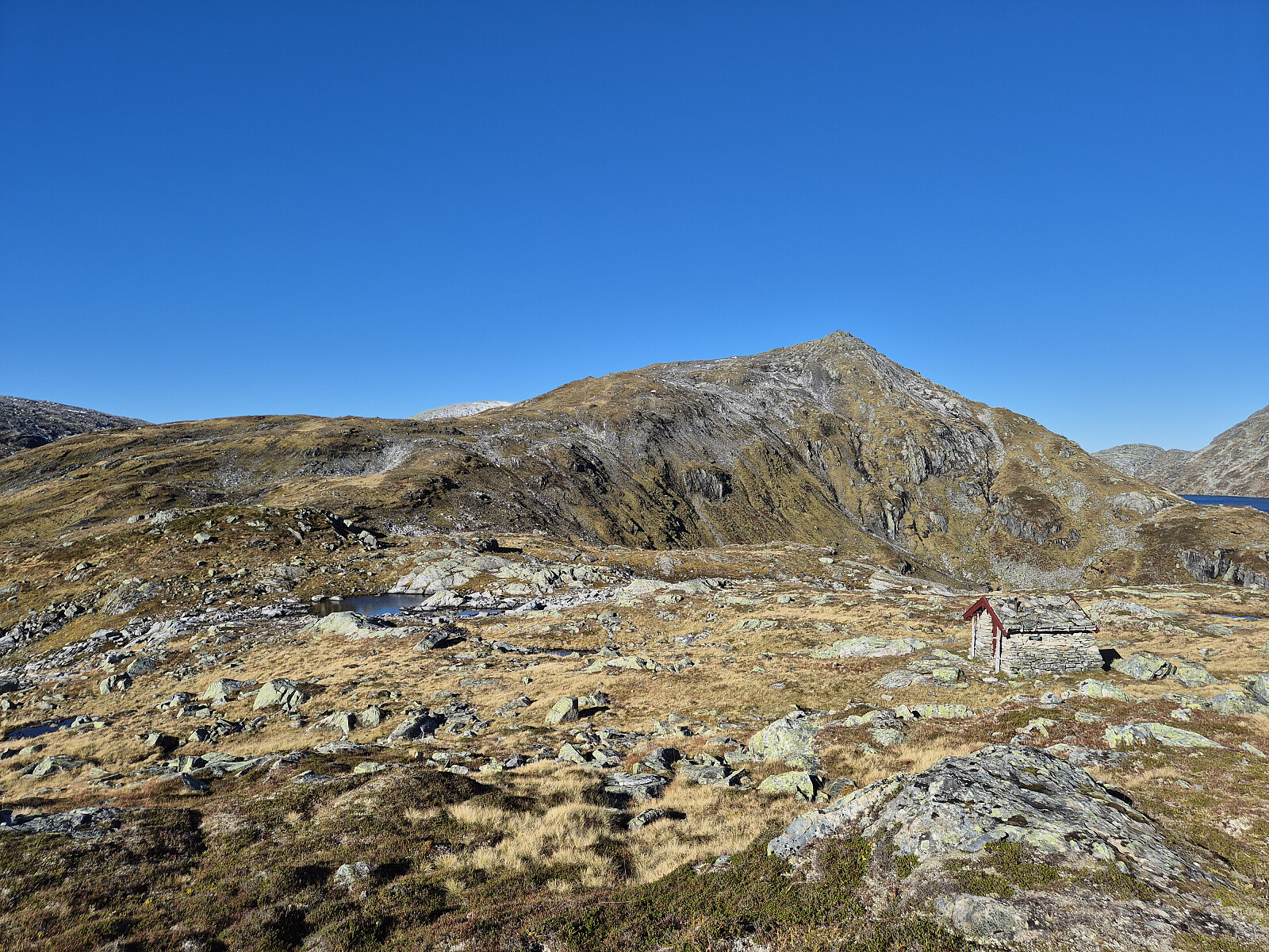 Sikta meg så opp mot Ramnenipa og hadde ein kort stopp der før eg gjekk nedatt. Prøvde å finne stien eg fann ned frå Ramnenipa sist. Fann den lenger nede. Det viste seg at eg hadde tatt for mykje austover då eg gjekk nedover lia. Siste stykket ned mot Nesstøylen var på fin sti. Dersom eg skal oppover ein gang til, føl eg stien oppover frå stølen og oppover. Det trur eg må være det enklaste.