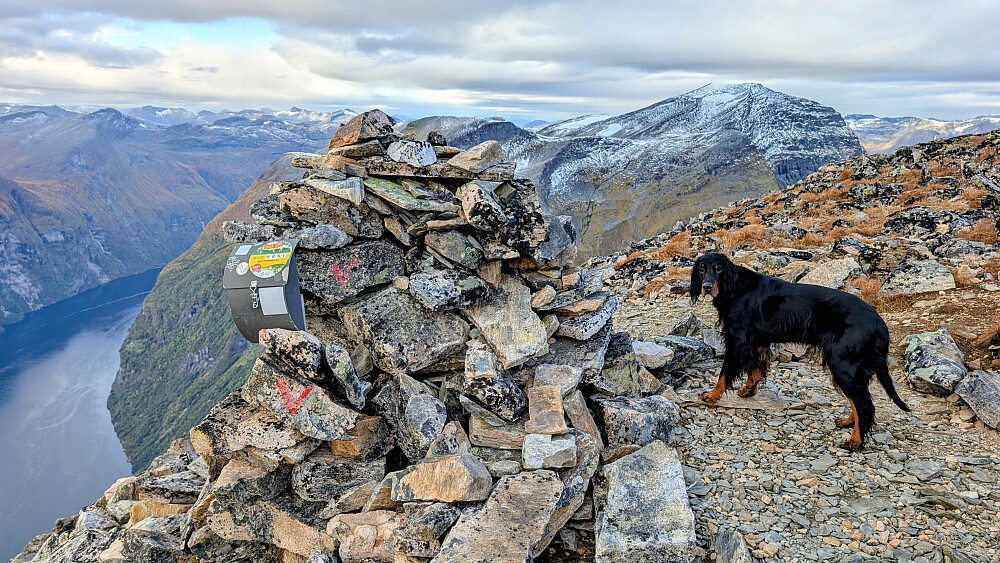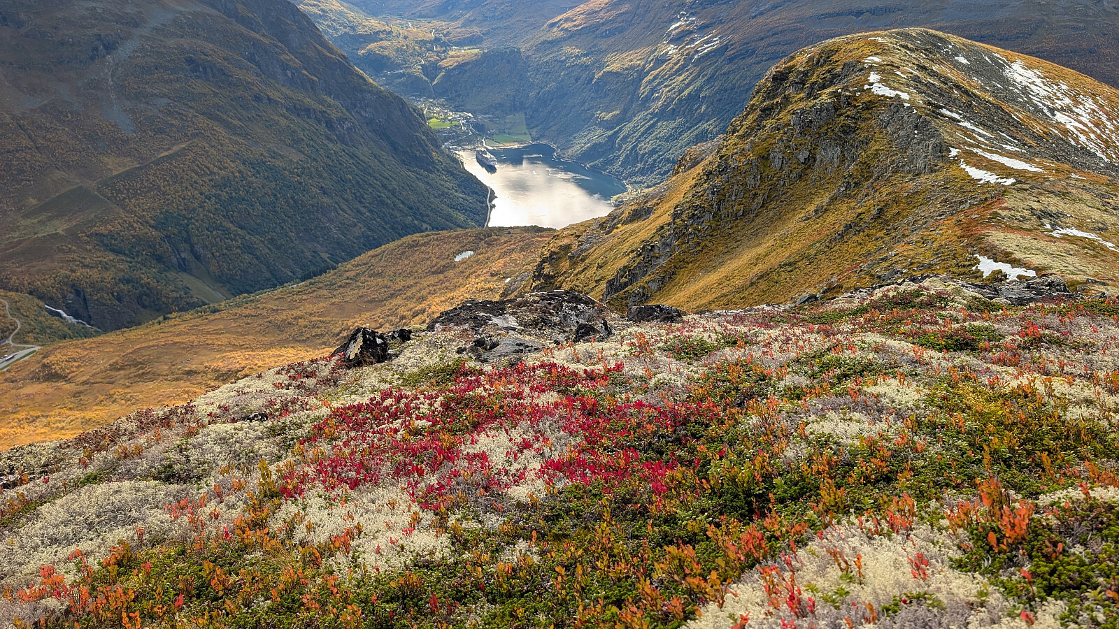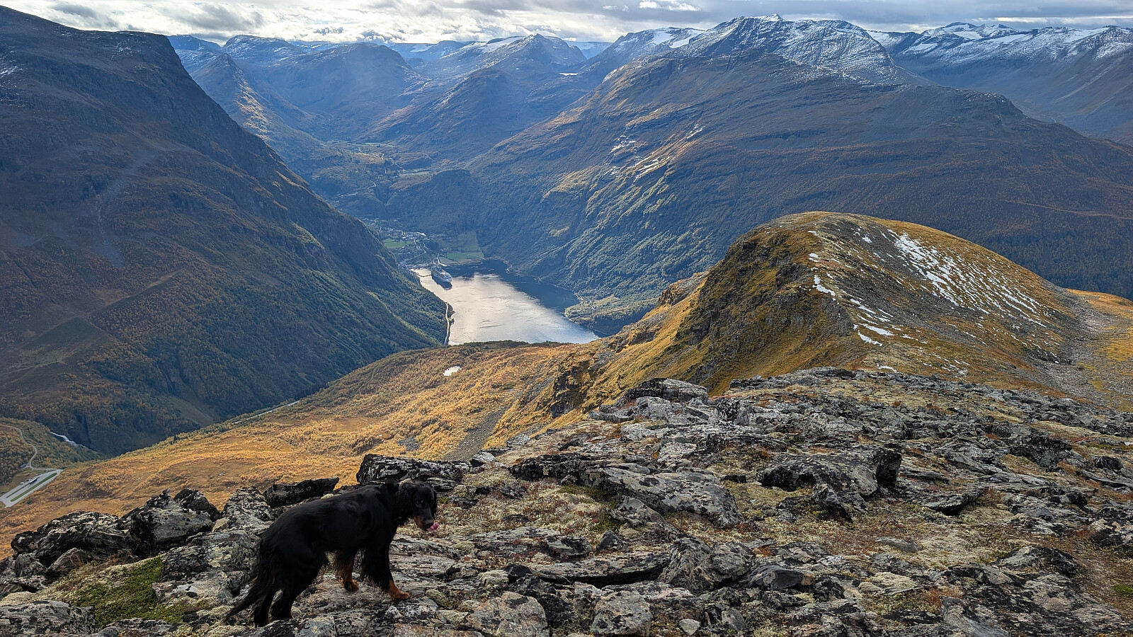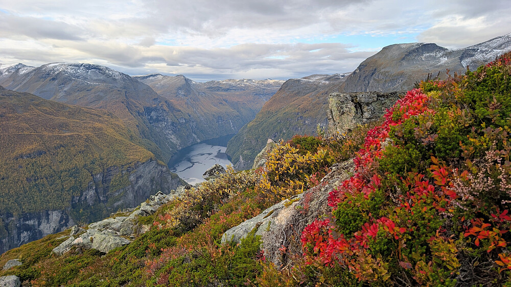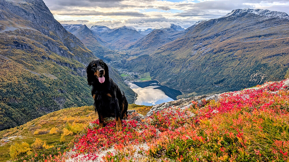 Derfra ble det nesten et antiklimaks med ur resten av turen opp til Eidshornet. Fantastisk utsikt nesten fra første skritt i dag. Fantastisk å se Geirangerfjorden...stille.. og se en stor cruisebåt sige stille inn mot Geiranger. Denne turen kan jeg virkelig anbefale og HØSTEN med mulighet for en slik fargesprakende opplevelse. Fy...f...minne for livet dette altså. Fotograferte helt vilt på vei opp og ned. Valgte å gå ei bratt ur ned fra Eidshornet slik at jeg fikk en runde idag. Ura var bratt og løs. Embla og jeg kom oss velberget med og kunne igjen nyte det flotte terrenget nedover.