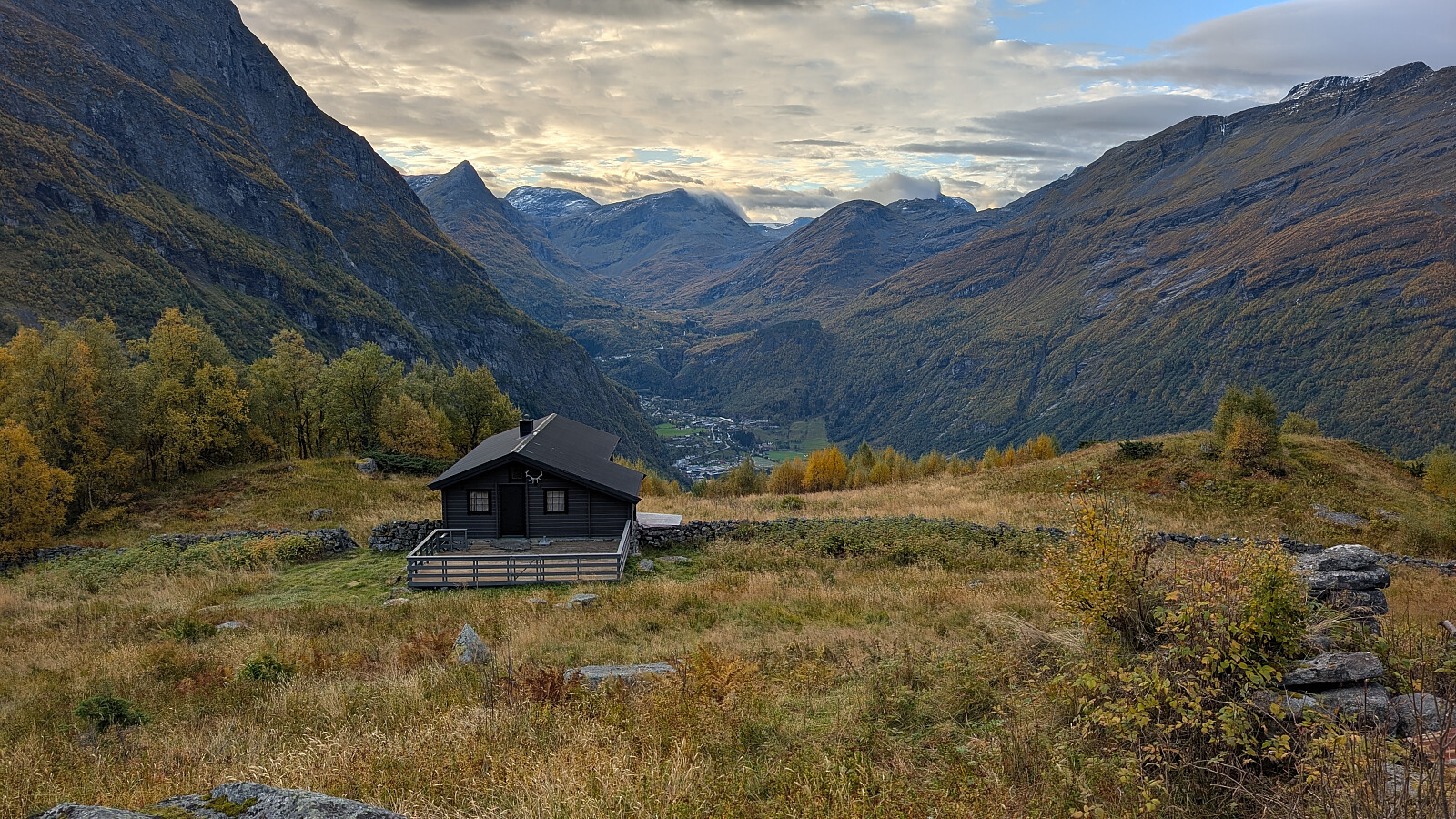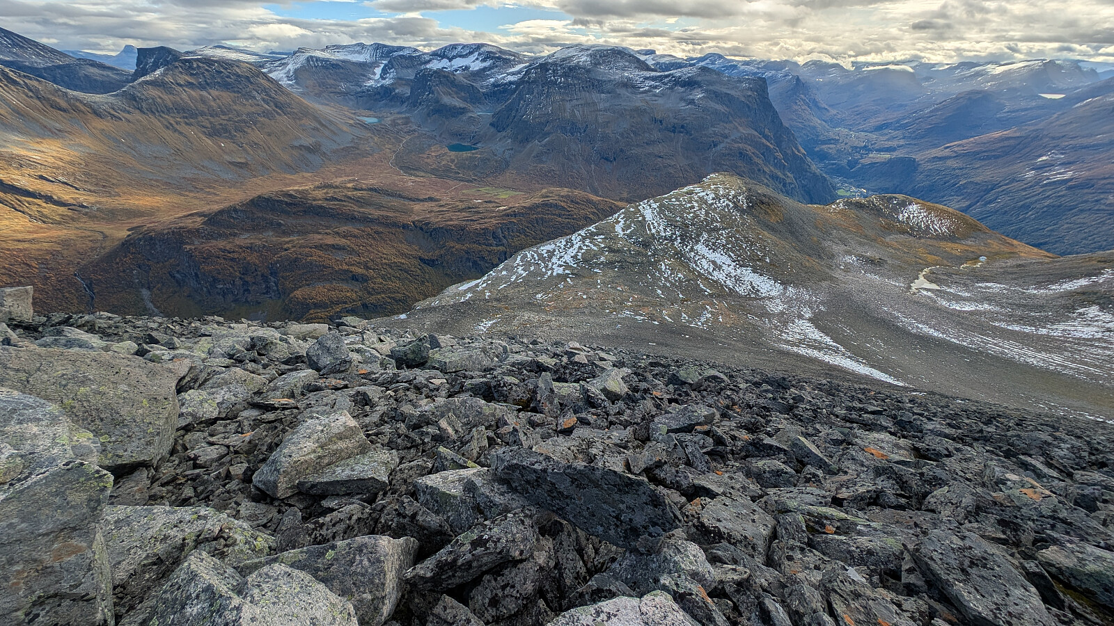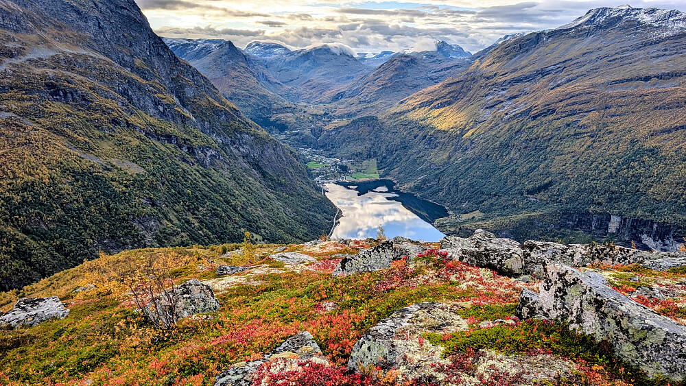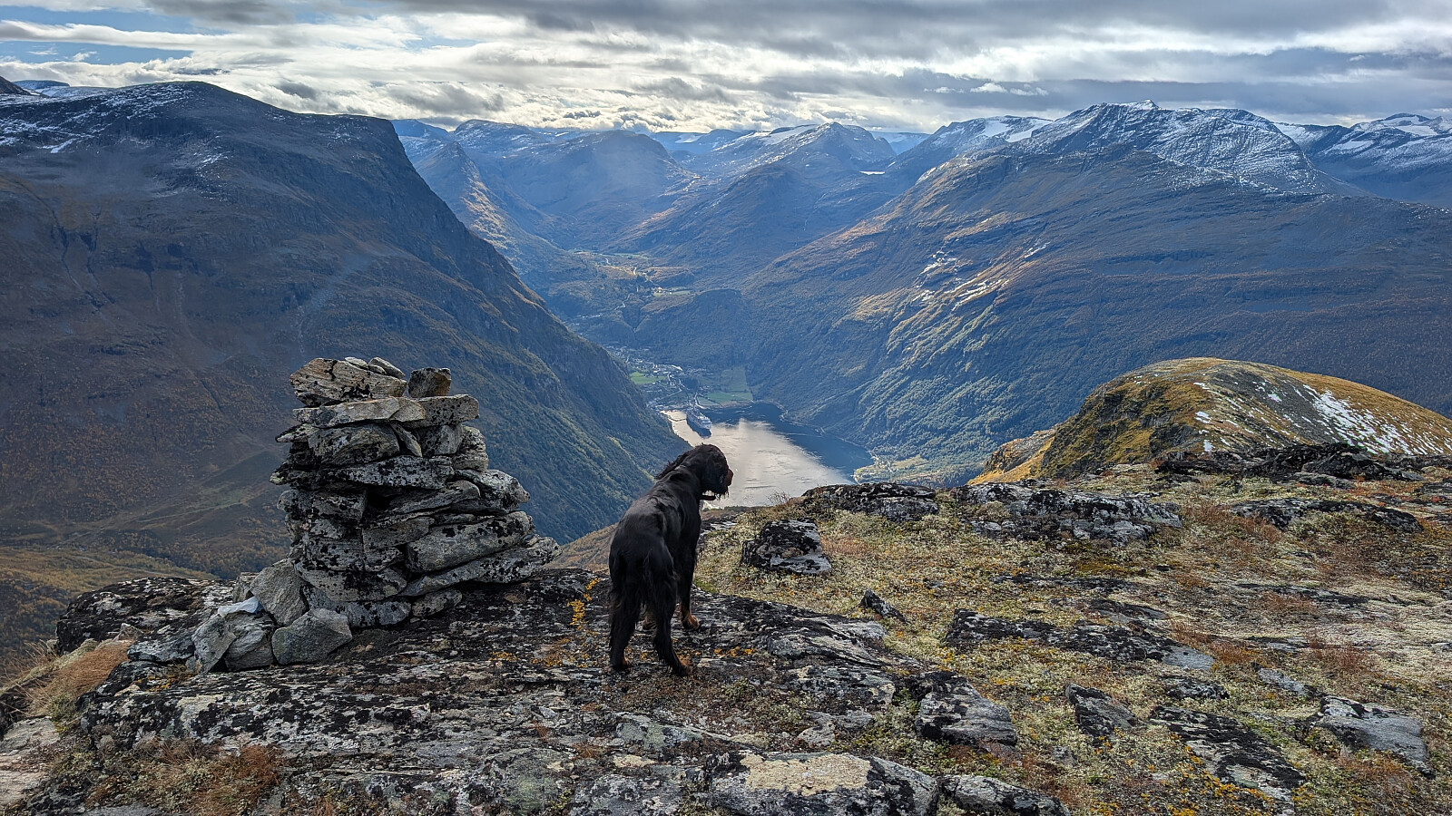 Derfra ble det nesten et antiklimaks med ur resten av turen opp til Eidshornet. Fantastisk utsikt nesten fra første skritt i dag. Fantastisk å se Geirangerfjorden...stille.. og se en stor cruisebåt sige stille inn mot Geiranger. Denne turen kan jeg virkelig anbefale og HØSTEN med mulighet for en slik fargesprakende opplevelse. Fy...f...minne for livet dette altså. Fotograferte helt vilt på vei opp og ned. Valgte å gå ei bratt ur ned fra Eidshornet slik at jeg fikk en runde idag. Ura var bratt og løs. Embla og jeg kom oss velberget med og kunne igjen nyte det flotte terrenget nedover.