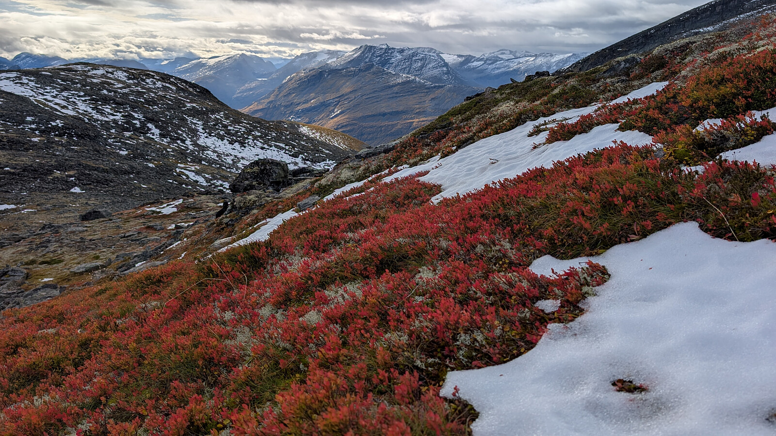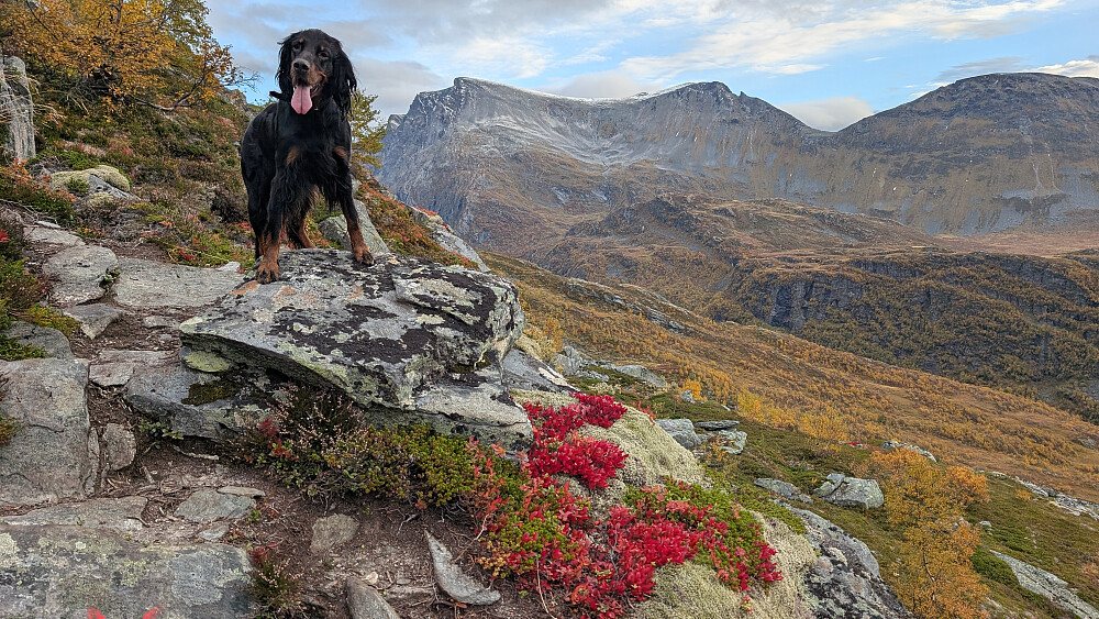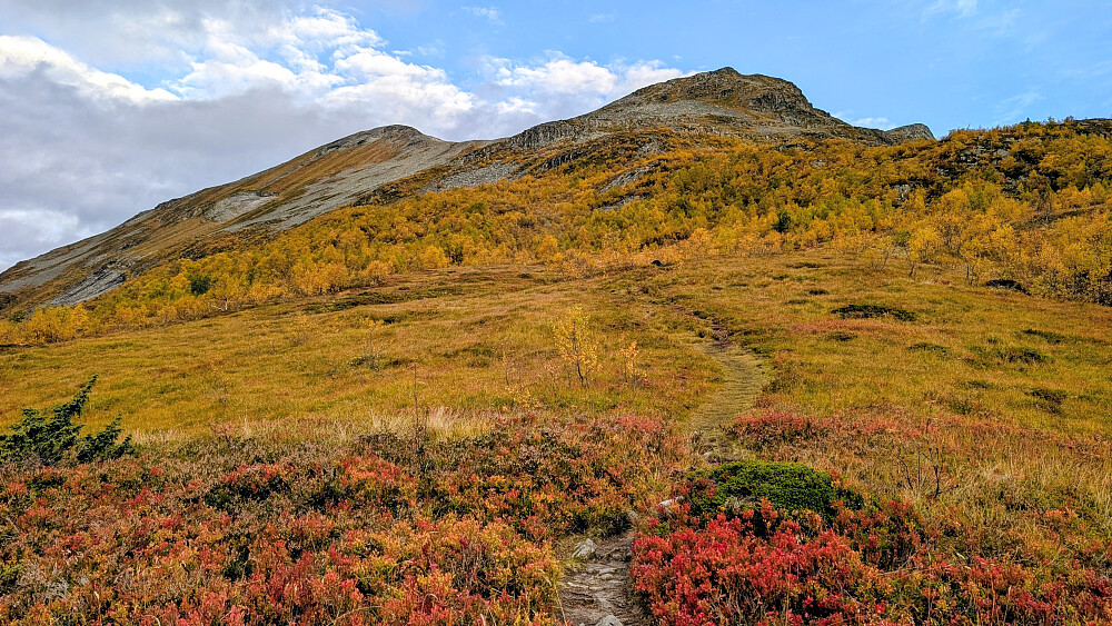 Dette ble en virkelig kanontur. Godt turvær og noen helt rå høstfarger. Vindstille, fint lys og passe temperatur. Litt tunge bein idag, og tok det derfor rimelig rolig den bratte stigningen som startet ved Haugset. Jeg tror nesten ikke jeg har sett så flotte høstfarger. Jeg er gammel og kanskje litt glemsk, men dette var rått. Fargene var nesten helt opp Geitfonnegga.