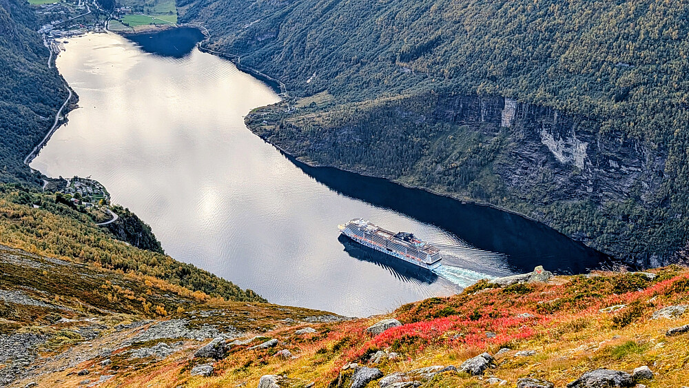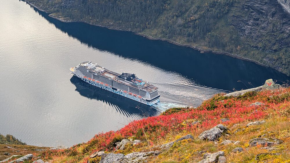 Skrevet av Atomsilda 02.10.2025 19:56Føltes nært ja. Jeg er vel her på ca 1000 moh tror jeg. Fin opplevelse å se det store cruiseskipet gli sakte inn fjorden. Så ikke noe eksos fra skipet heller.