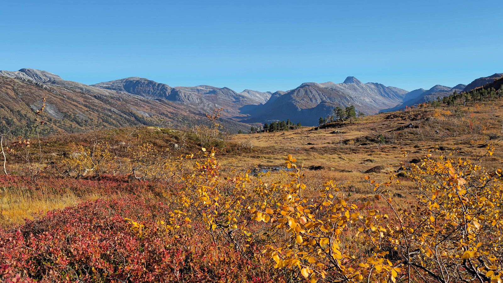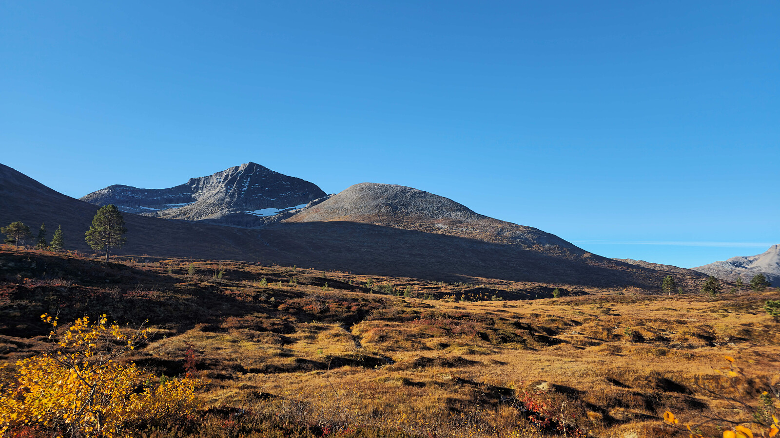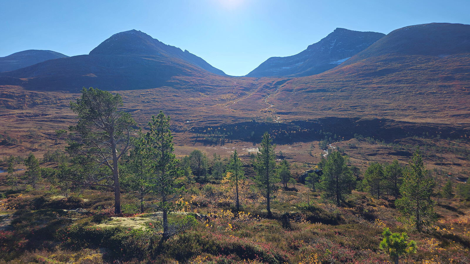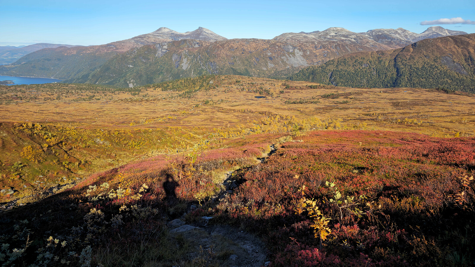 Fantastiske høstfarger i flott vær også denne dagen. Valgte en ny rute opp mot Bjøråskaret. Fremfor å gå stien fra Innerdalsmerket gikk jeg veien opp til Taløysetra. Bra standard på veien, og 300 nokså lettgåtte høydemeter. Foretrekker denne ruta fremfor stien. Tung bakke opp mot Snøfjellets nordtopp, før det ble kort og morsom klyving til NV1. Retur samme vei inkludert en svipptur innom Taløystorhaugen.