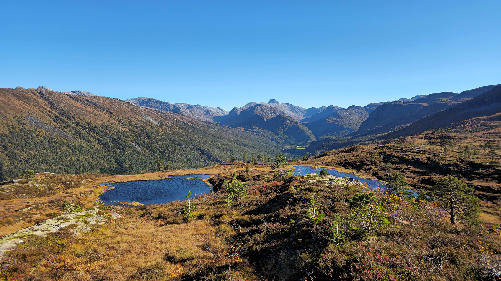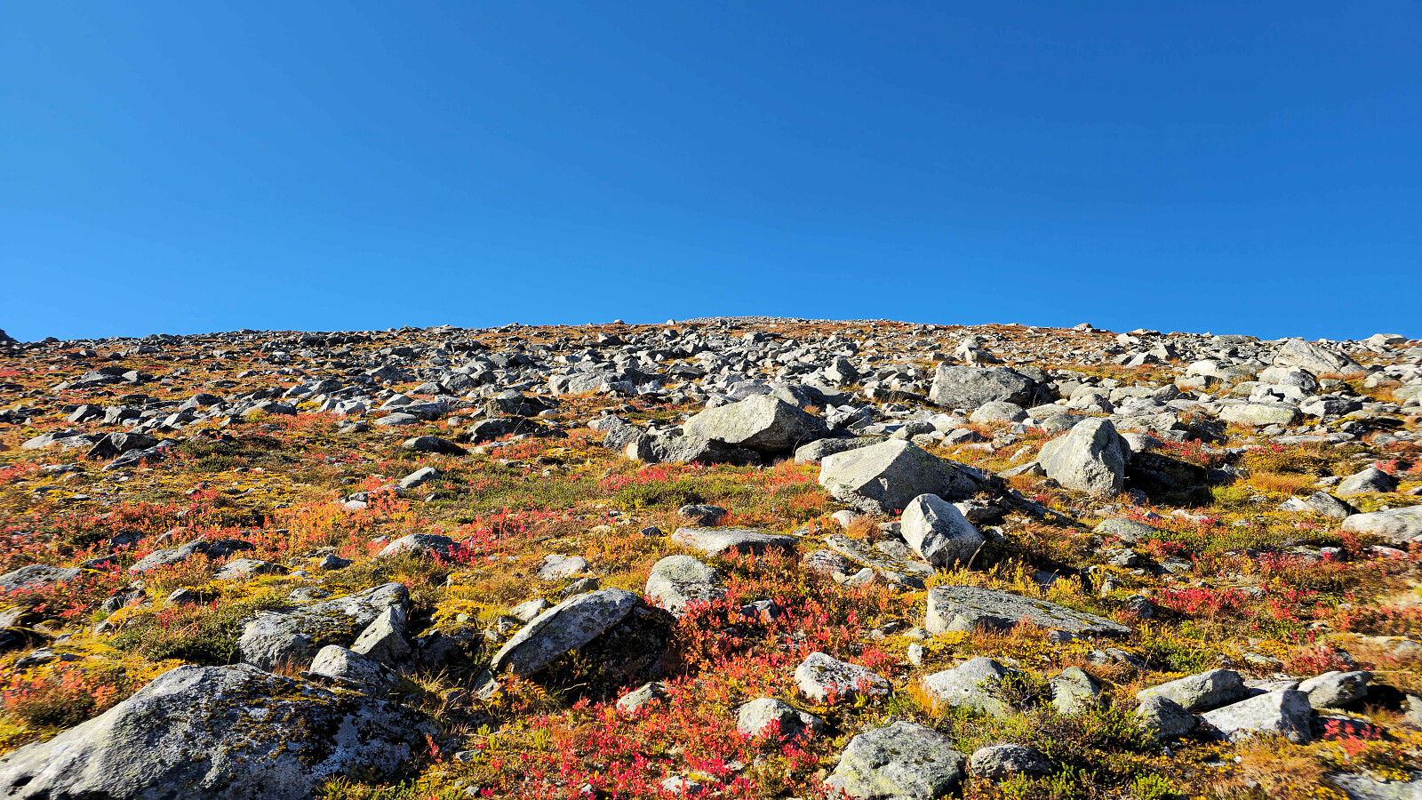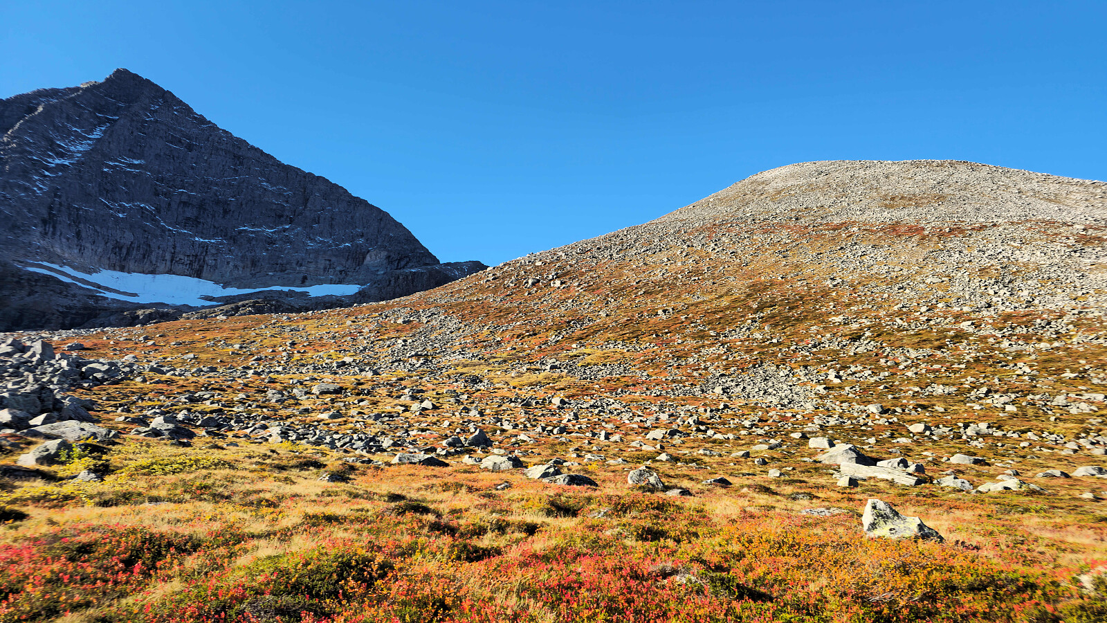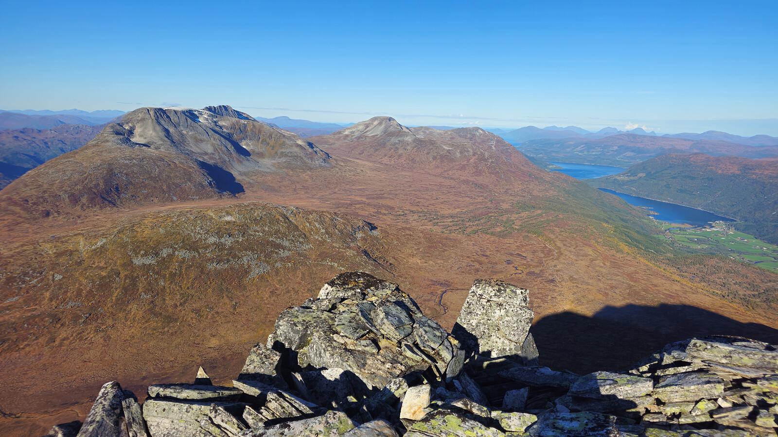 Fantastiske høstfarger i flott vær også denne dagen. Valgte en ny rute opp mot Bjøråskaret. Fremfor å gå stien fra Innerdalsmerket gikk jeg veien opp til Taløysetra. Bra standard på veien, og 300 nokså lettgåtte høydemeter. Foretrekker denne ruta fremfor stien. Tung bakke opp mot Snøfjellets nordtopp, før det ble kort og morsom klyving til NV1. Retur samme vei inkludert en svipptur innom Taløystorhaugen.