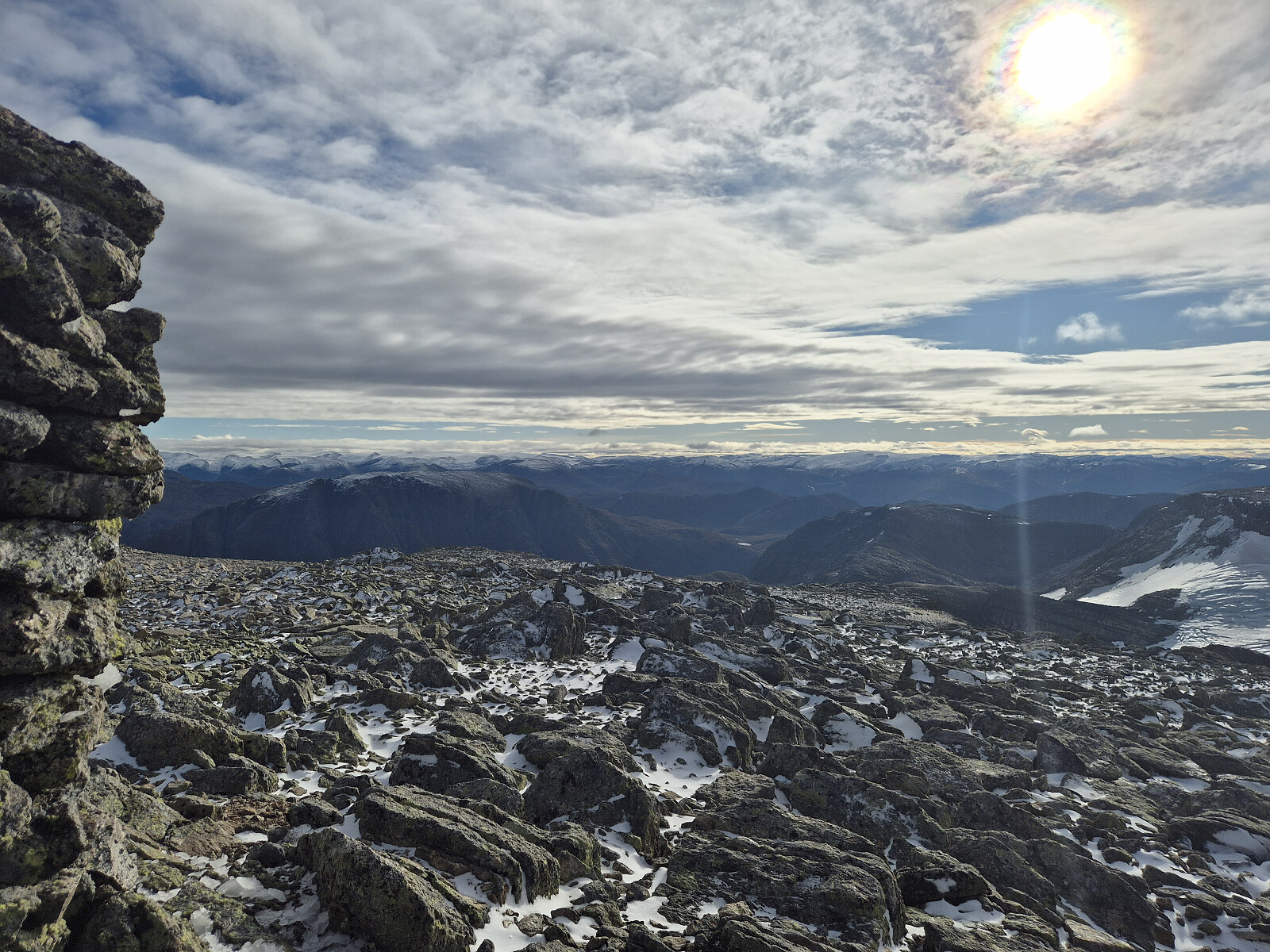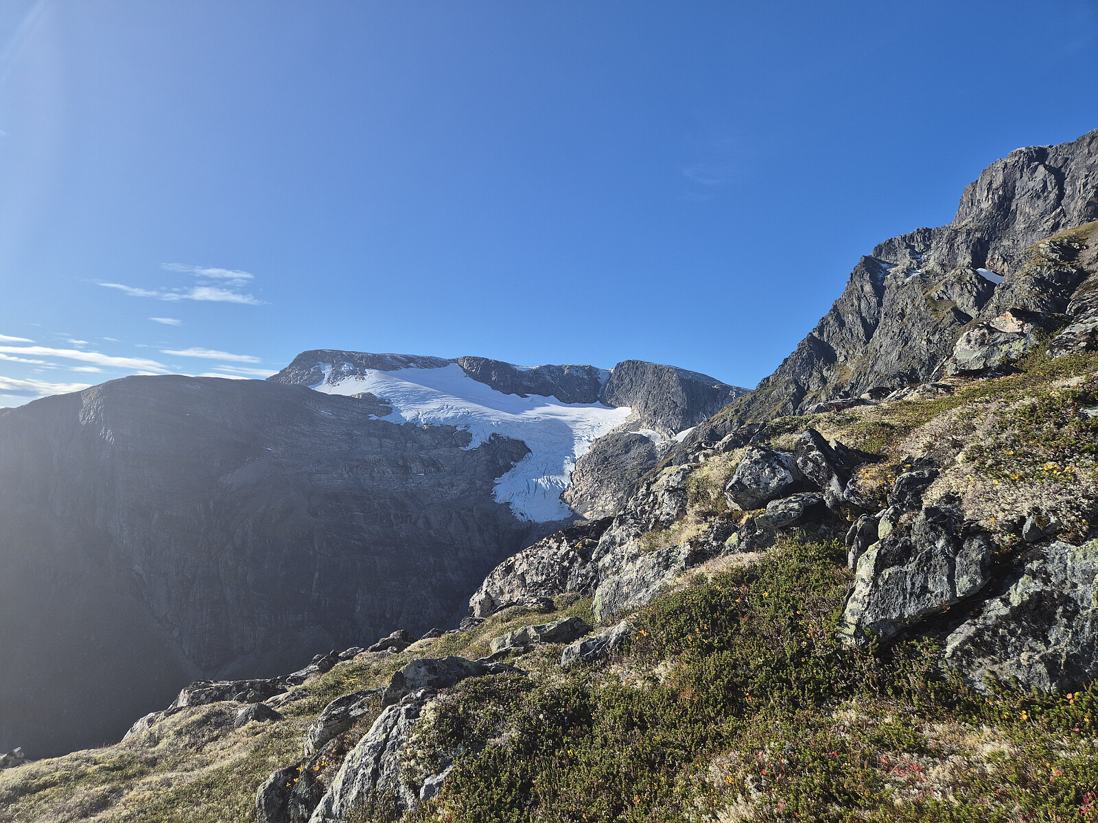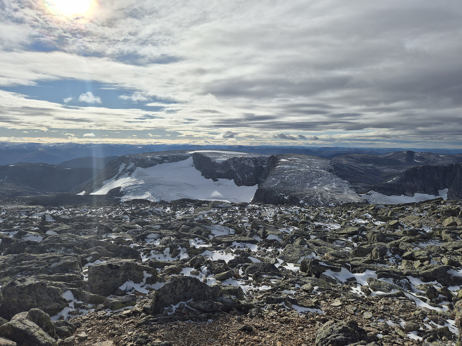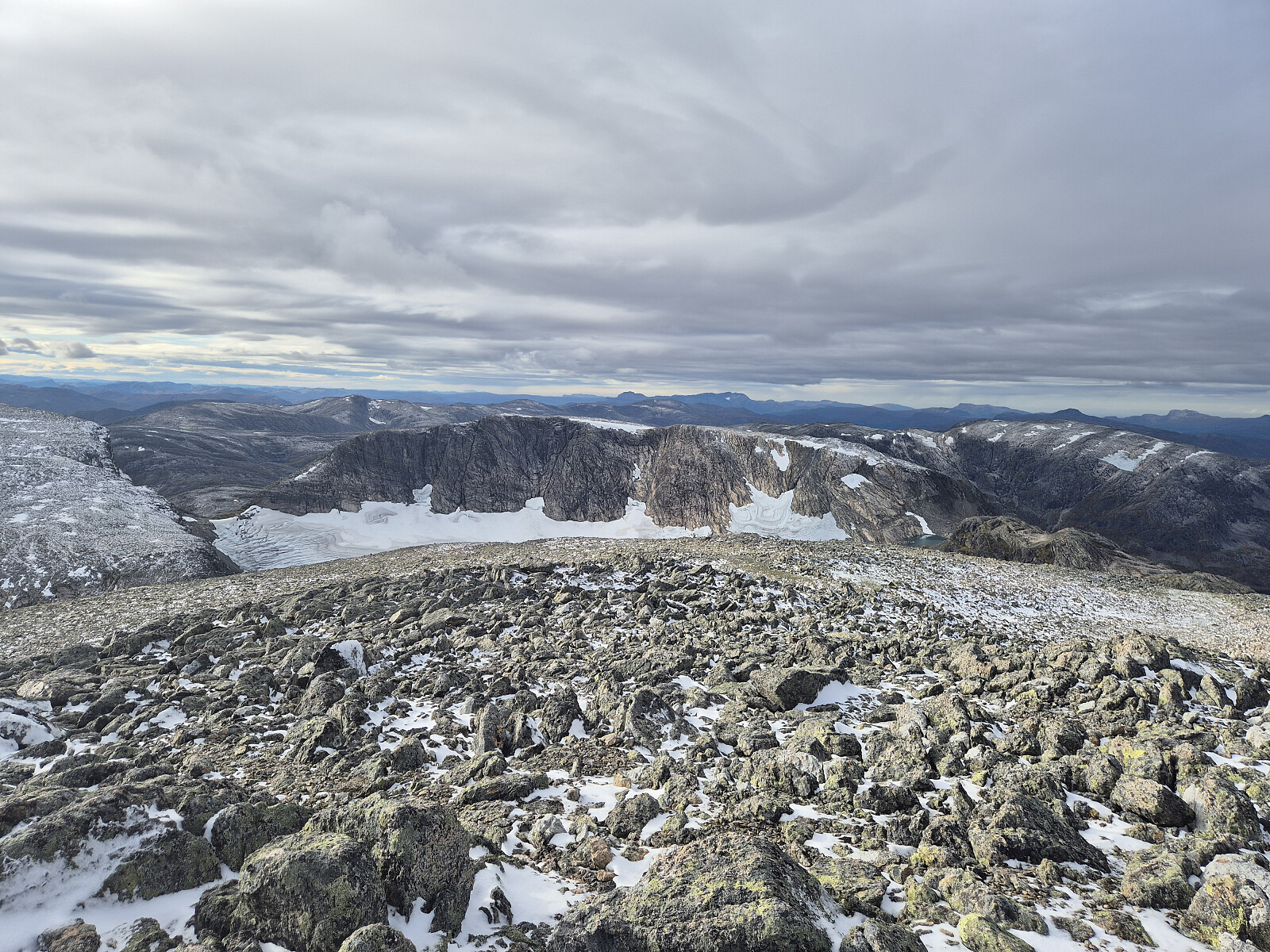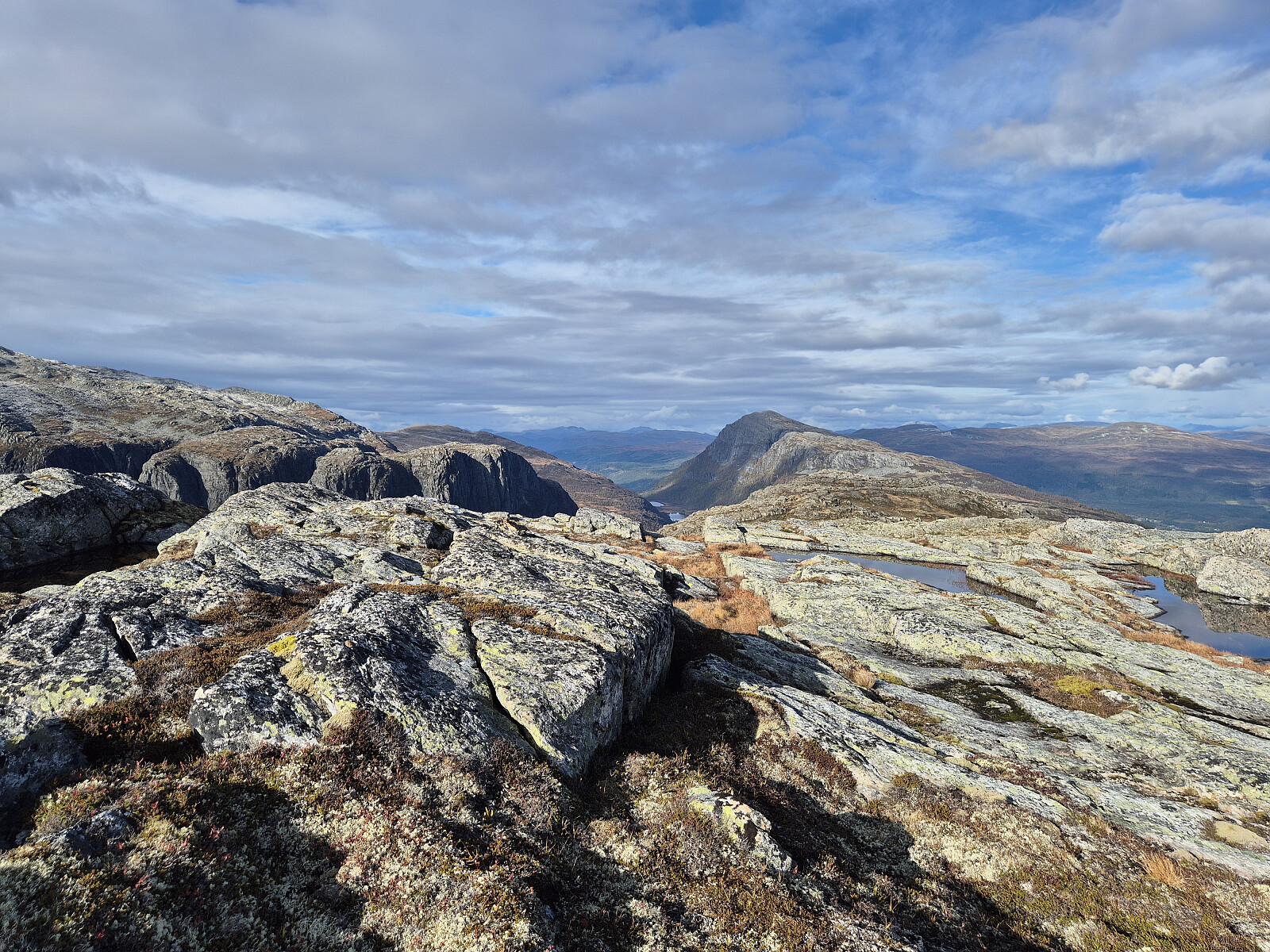 Vindstille og fint på toppen i dag. Etter kvart kom det litt meir vind og litt meir skyar, så det var om å gjere å komme seg ned før regnet kom. Nede i botnen sikta eg meg opp mot Eggene og gjekk opp dit før eg sikta med ned mot hytta ved Øykjeheivatnet og vidare ned dalen mot bilen.