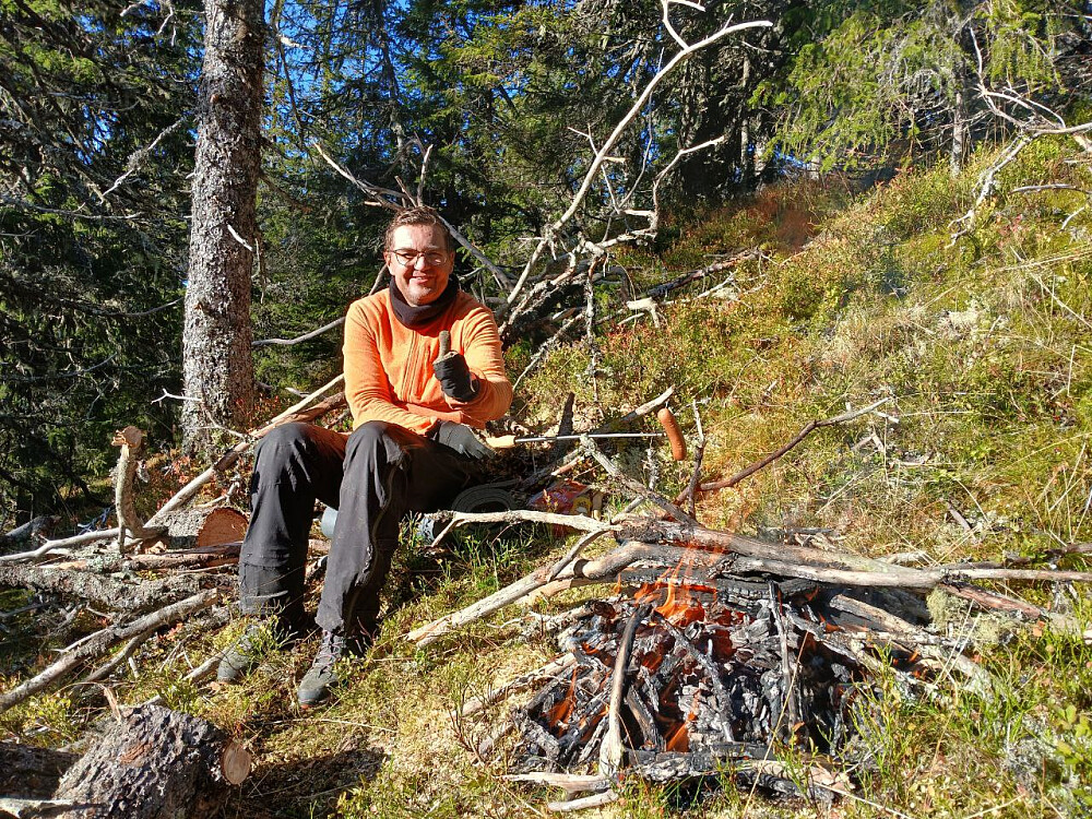 Jeg hadde med min kjære Stihl MS260C og fikset kjapt en diger tørrgran i små kubber i solhellinga nær toppen. Ved å la en passende bit av stubben stå igjen, fikk vi en utmerket hoggestabbe. Men den lille øksa ble for puslete i møtet med disse svære kubbene.
