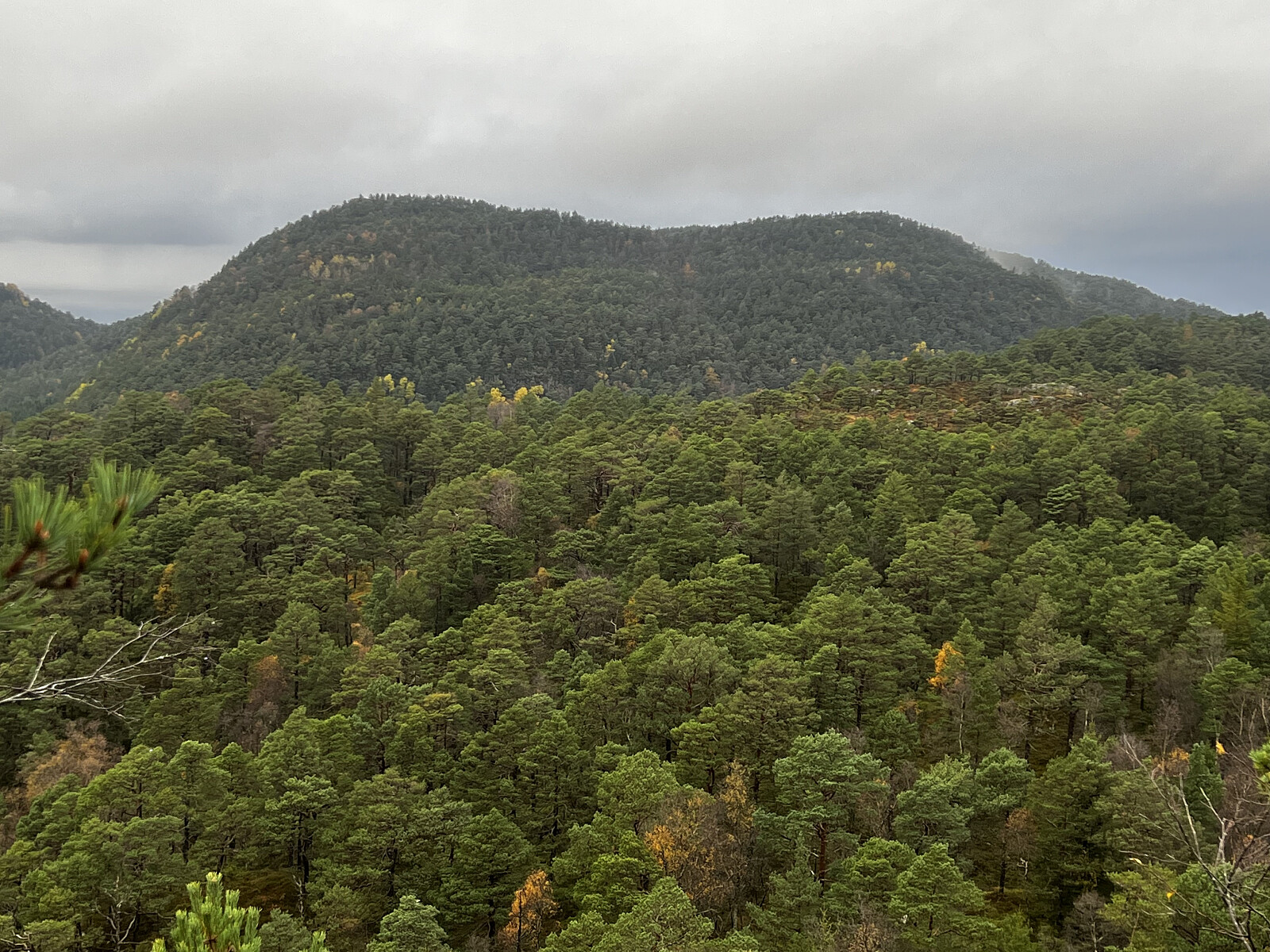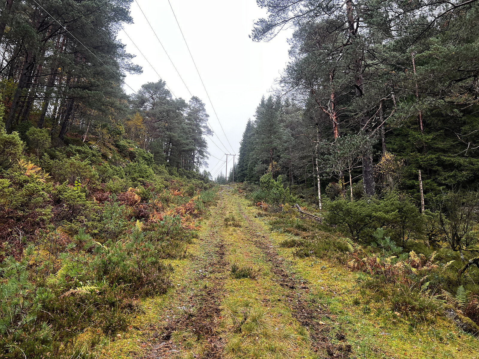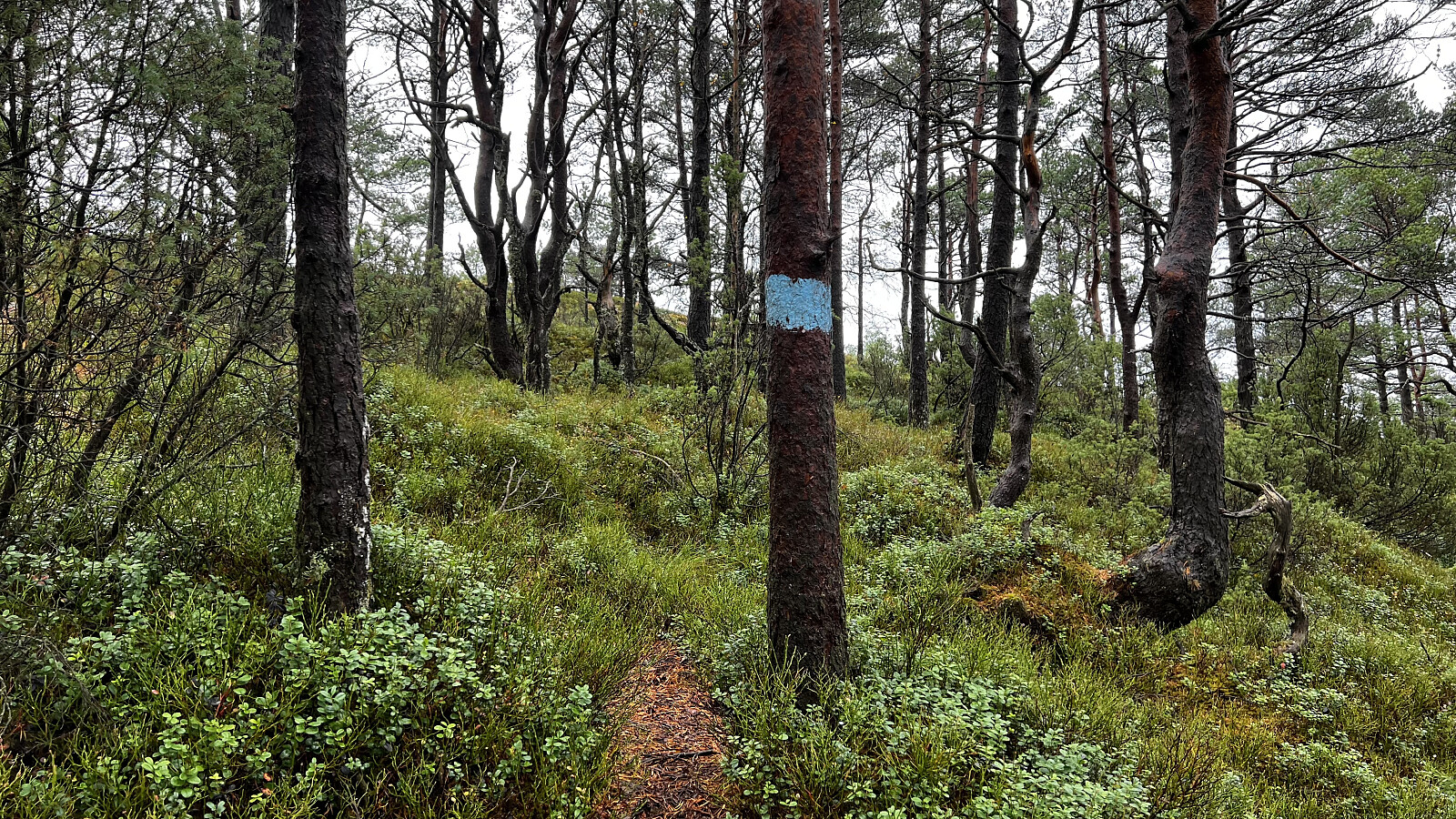 Hadde i forkant planlagt at jeg skulle følge stien på sørsiden opp til Tuvefjellet. Det var vått i terrenget og jeg var ikke helt innstilt på å krige mot vegetasjon akkurat i dag, men da jeg så hvor nærme toppen jeg var, falt jeg for fristelsen. Tok av på en av sideveiene og kom inn på et hjortetråkk. Helt greit å følge i starten. Ble noe brøyting gjennom div busker og klatring over noe rotvelt før jeg kom inn i det åpne myrområdet like nord for toppen. Dette kunne jeg følge helt opp. Duskregn og svette gjorde både fingre og mobil våt. Når den sårt må benyttes til navigering midt inne i skogen, er det ekstremt frustrerende når tuch-funksjonen ikke vil lystre.