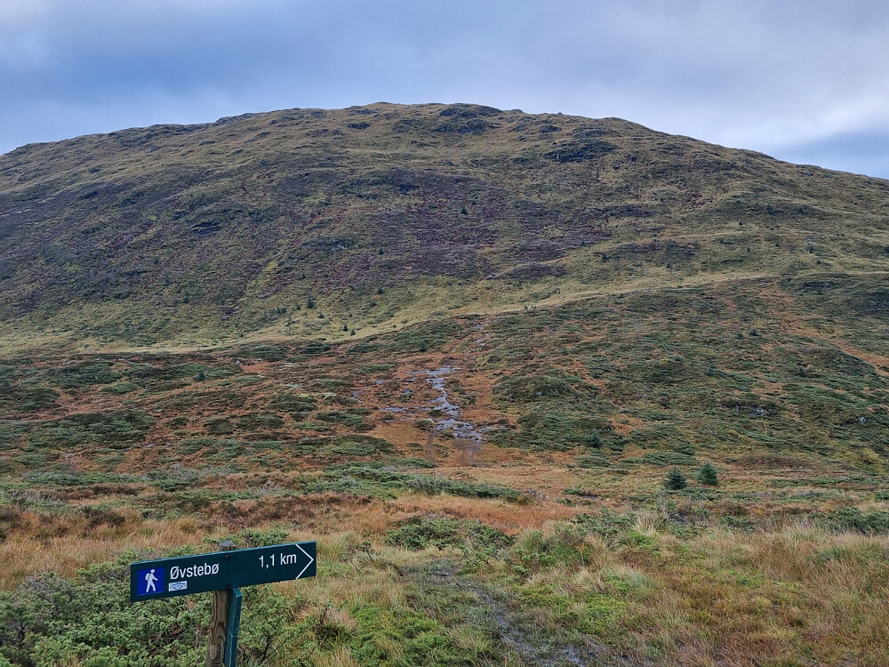 Øst for Hovden. Ennå tåkefritt. Skiltet viser vei mot Øvstebø, og min vei tilbake til bilen.