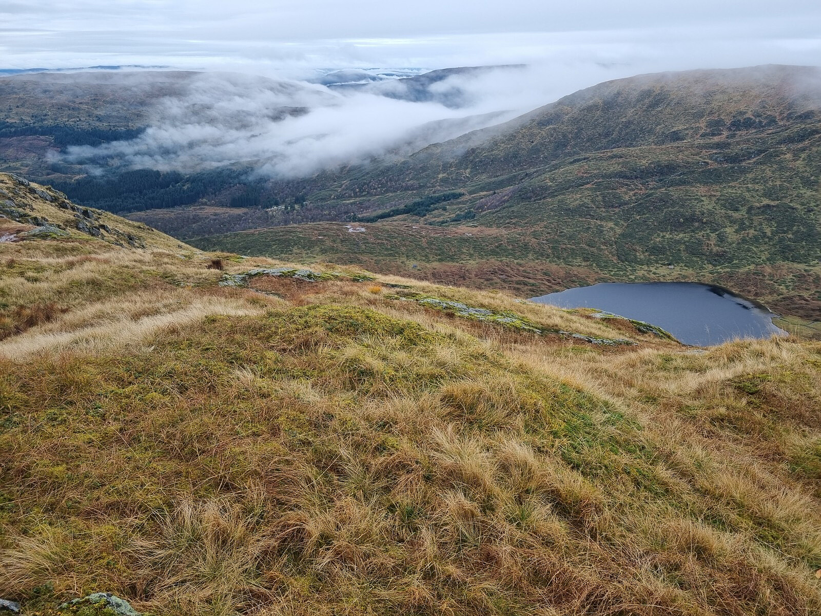 Toppen. Utsikt til Dyrdalen. Tåken kommer sigende, dekker toppen en liten stund og forsvinner. Heldig med den.