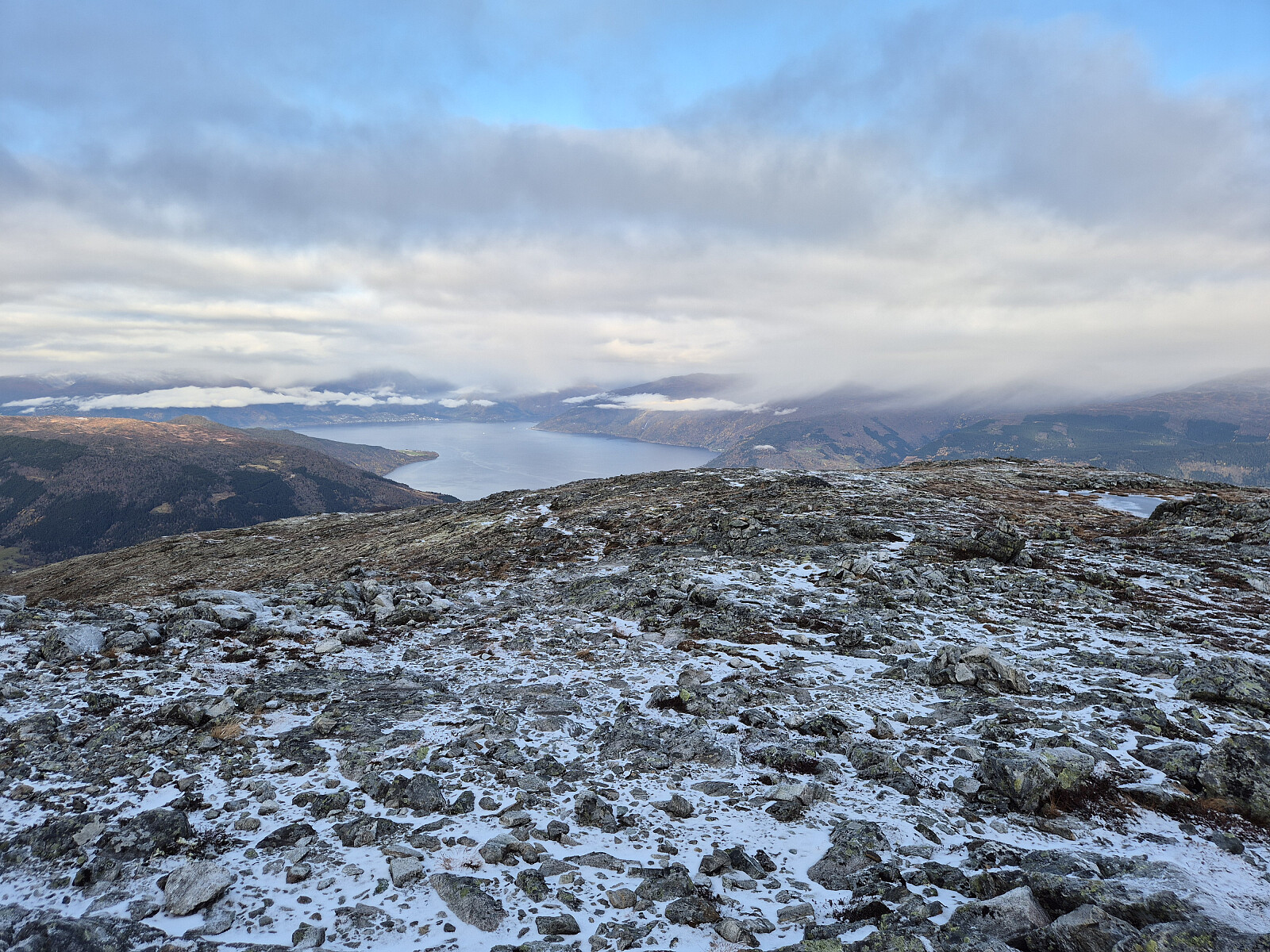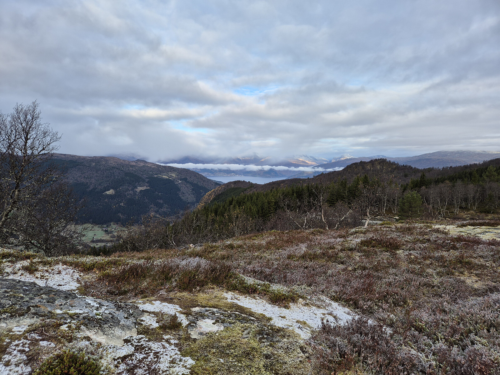 God sti opp til Vidasethovden. Derfrå ingen sti, men greitt å gå. Flott utsikt frå Vidasethovden. Litt tendensar til tåke ved Kjerringafjell.