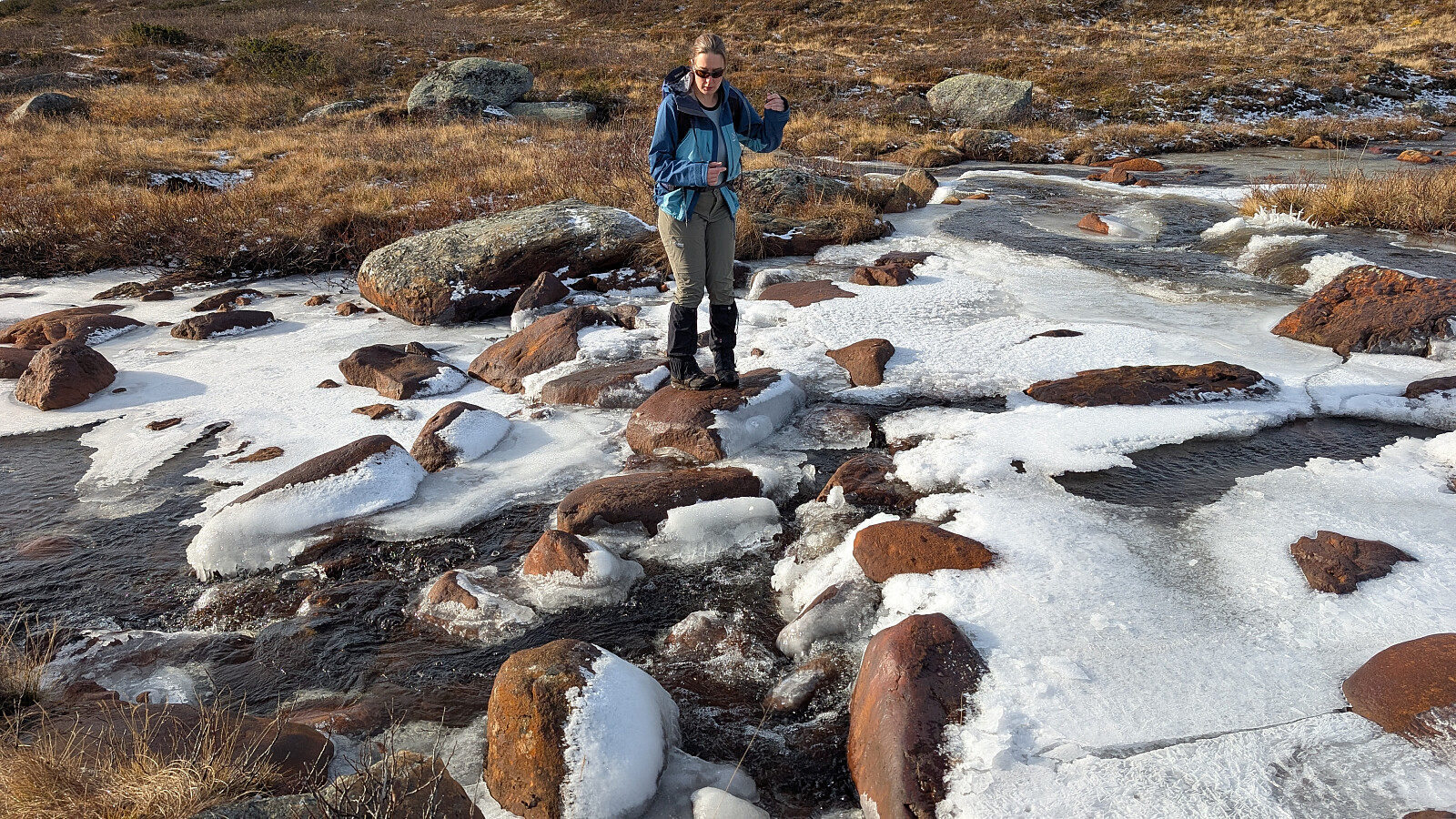Vi startet kl 11 og fulgte stien innover det laaaaange flate området innover mot Langsuaområdet.Vi gikk sørover mot Bøllhaug. Dette var nok ikke den beste ruta. Stien her er nok normalt mye våtere og med mer kjerr enn den ruta som går lenger nord. I tillegg er det ei elv som er litt trøblete å krysse. Idag med is og glatte steiner. Vi kom oss over etter å gått et kort stykke lenger ned i elva. Når man går her inne på dette flate litt kjedelige området er det bare å gå og gå...