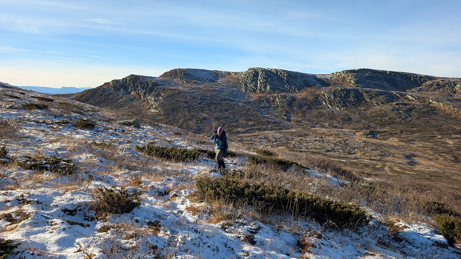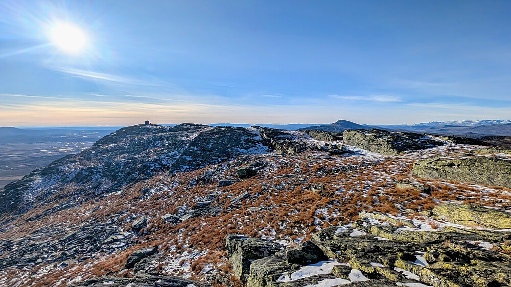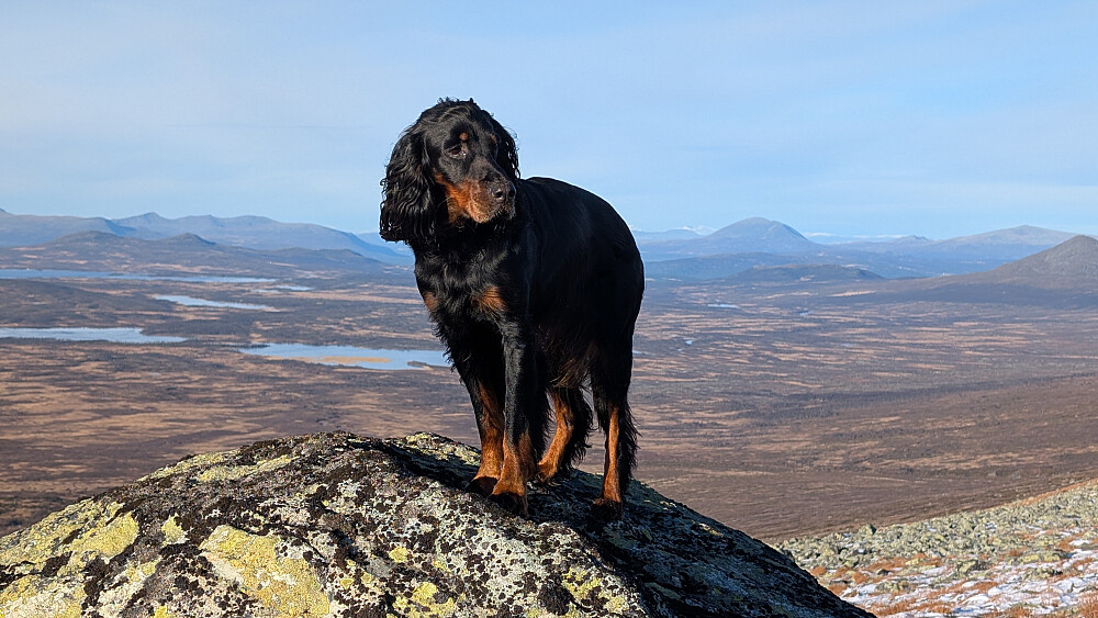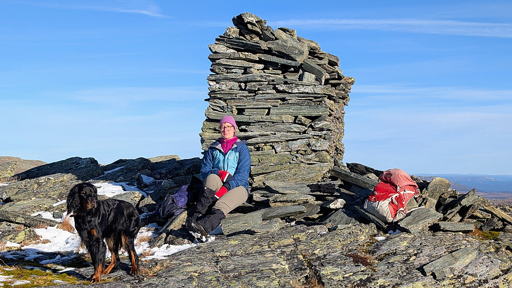 Omsider kom vi til et stidele der vi gikk mer i direkte retning mot Søre Langsua og ikke stein videre mot Halvorsbu. Ikke den tydeligste stien, men greit å gå et stykke opp lia før stien forsvant. Fant vår egen rute til ei lita flott hytte som lå ved foten til Søre Langsua. Tok en god pause her i solveggen før vi startet å gå oppover i flanken til toppen. Litt kjerr og noen steder med litt ur, men ei grei rute oppover mot toppen. Det vsr liksom NÅ høydemeterne begynte. Det ble ikke så mange av de idag, men langt og seigt ble turen. Fantastisk å være her inne....i sol og vindstille. Vi kunne ta pausen ved varden i sol og vindstille...men en virkelig fantastisk utsikt i alle himmelretninger.