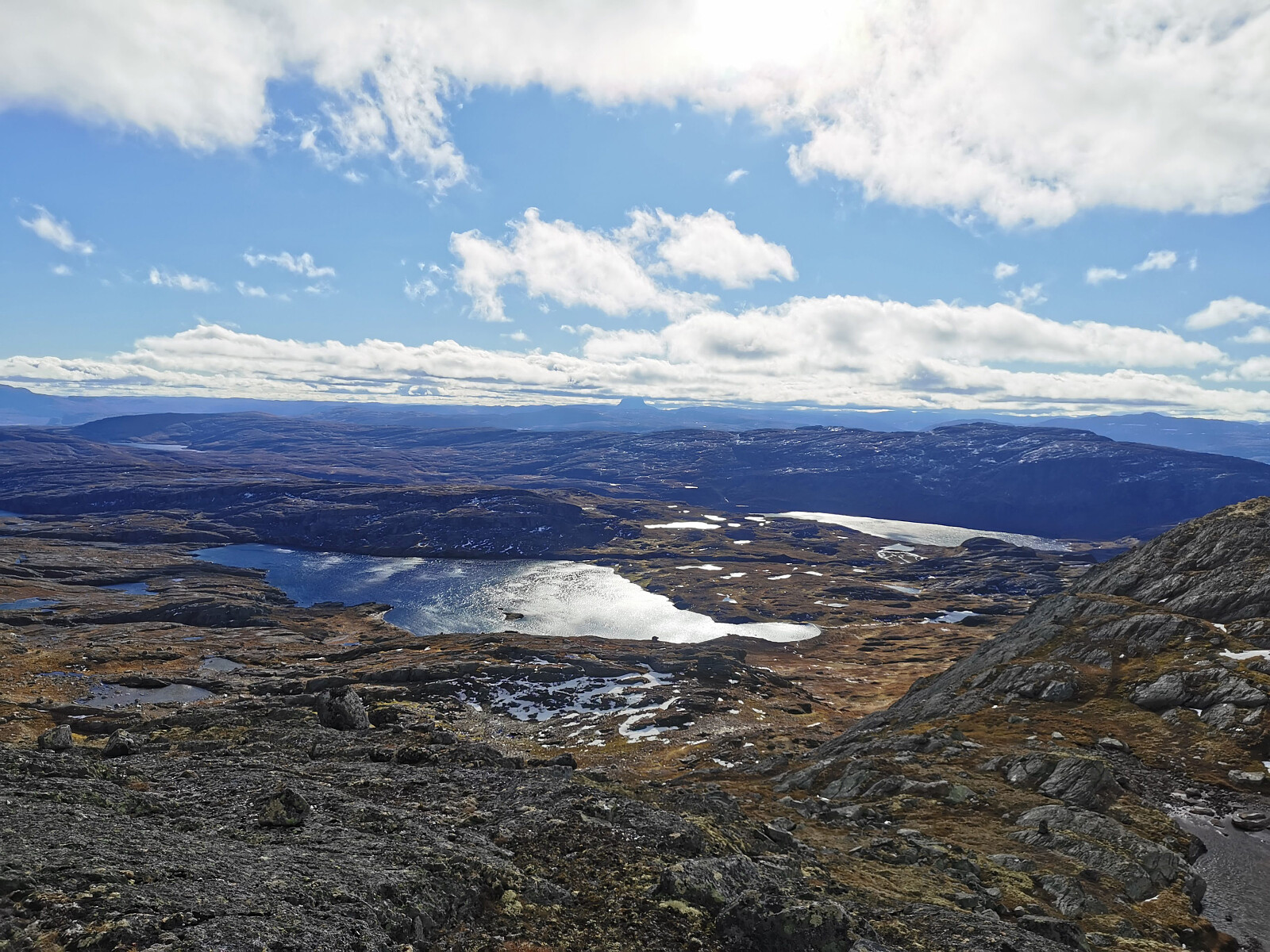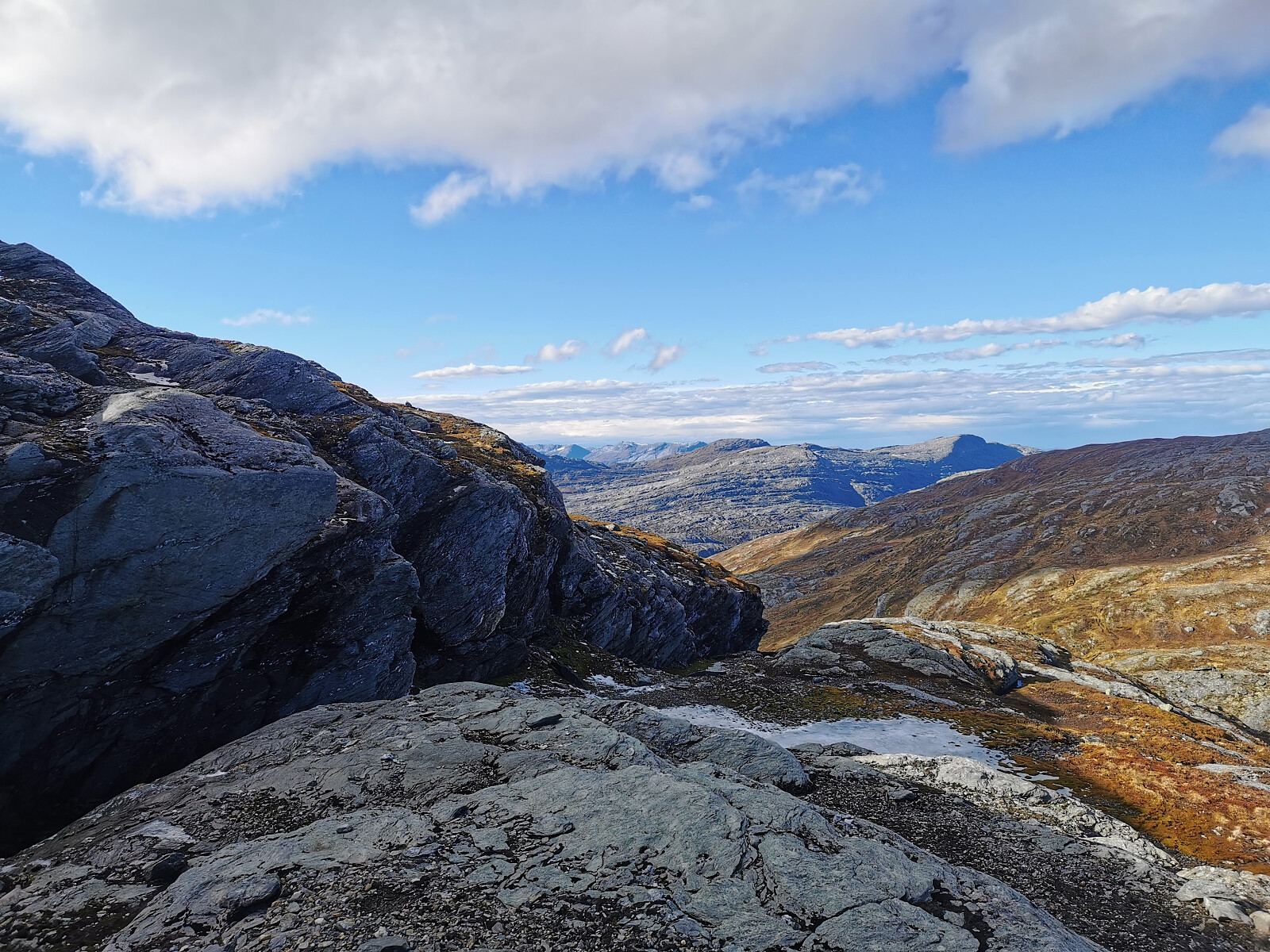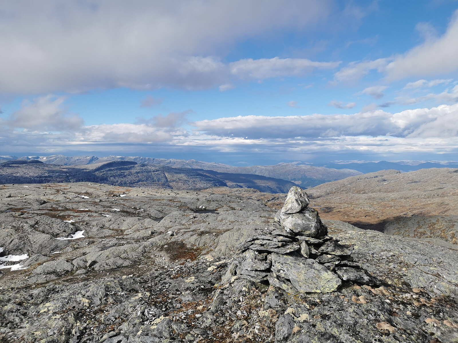 Våknet opp på Stavali til nok en dag med fint vær, men fortsatt noe kraftig vind. Gårsdagen hadde jeg gått 28,5 km fra Hjølmo over Nuhaugane, så kjente det litt i beina denne morgenen. Turen begynte bratt rett opp fra hytten, så det gikk ikke så veldig fort. Men, over 1300 moh ble det litt slakkere terreng og farten økte litt. Nådde det tidligere topp-punktet på Randinuten etter 1 time. Her oppe blåste det kraftig, men tok meg likevel tid til å stikke innom punktet rett vest av toppen. Videre var det bratt ned i sadelen mot nordtoppen og det nå høyeste punktet på Randinuten. Denne toppen er ikke like spennende som den første, men fin utsikt vestover. Gikk også oppom det mye mer distinkte og brattere, men lavere østlige utsiktspunktet. Her tok jeg også en kaffepause i le av toppen.
