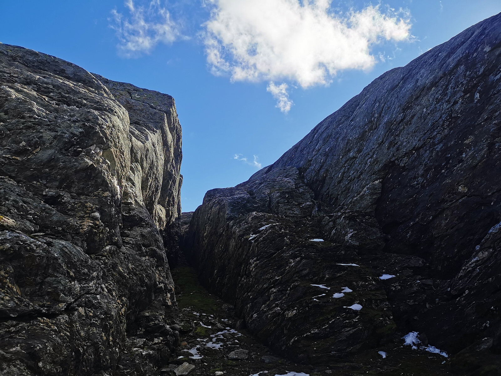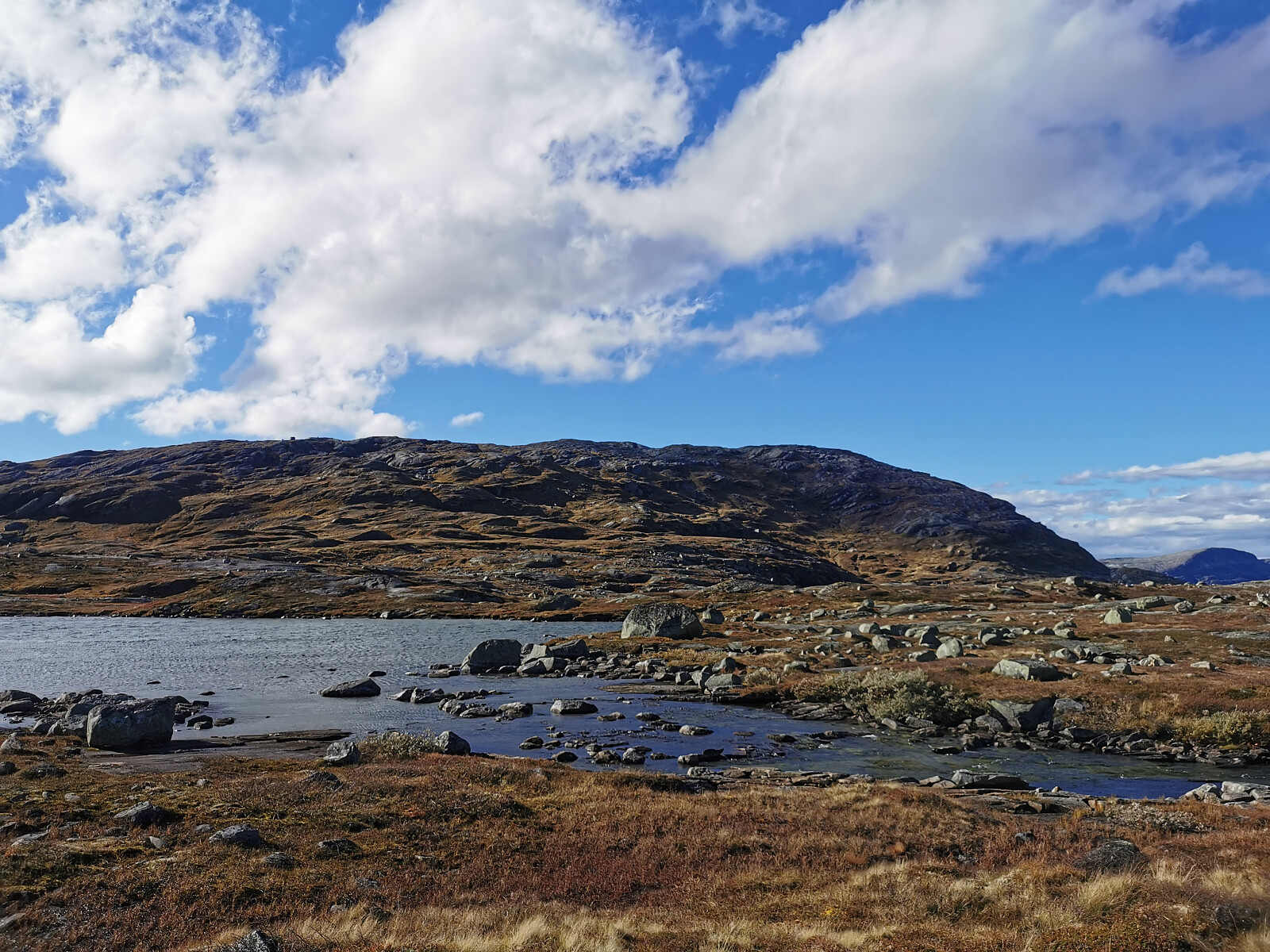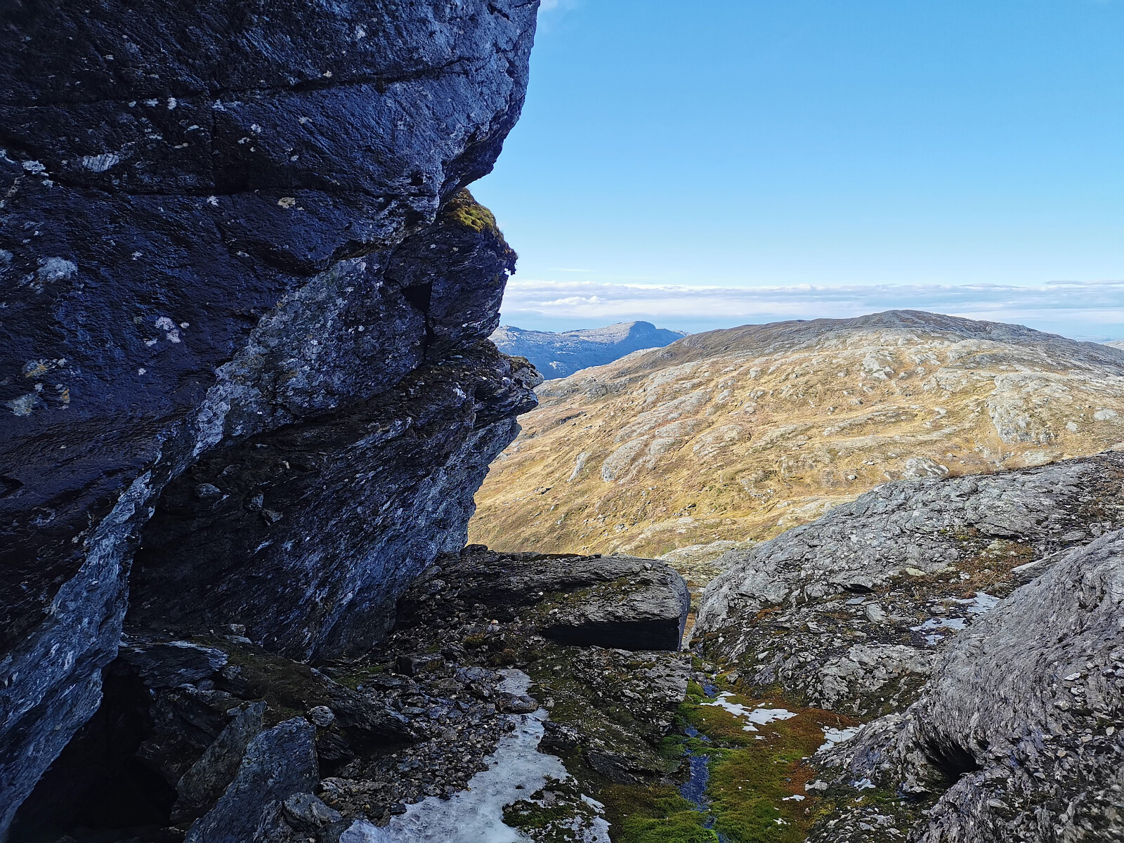 Våknet opp på Stavali til nok en dag med fint vær, men fortsatt noe kraftig vind. Gårsdagen hadde jeg gått 28,5 km fra Hjølmo over Nuhaugane, så kjente det litt i beina denne morgenen. Turen begynte bratt rett opp fra hytten, så det gikk ikke så veldig fort. Men, over 1300 moh ble det litt slakkere terreng og farten økte litt. Nådde det tidligere topp-punktet på Randinuten etter 1 time. Her oppe blåste det kraftig, men tok meg likevel tid til å stikke innom punktet rett vest av toppen. Videre var det bratt ned i sadelen mot nordtoppen og det nå høyeste punktet på Randinuten. Denne toppen er ikke like spennende som den første, men fin utsikt vestover. Gikk også oppom det mye mer distinkte og brattere, men lavere østlige utsiktspunktet. Her tok jeg også en kaffepause i le av toppen.