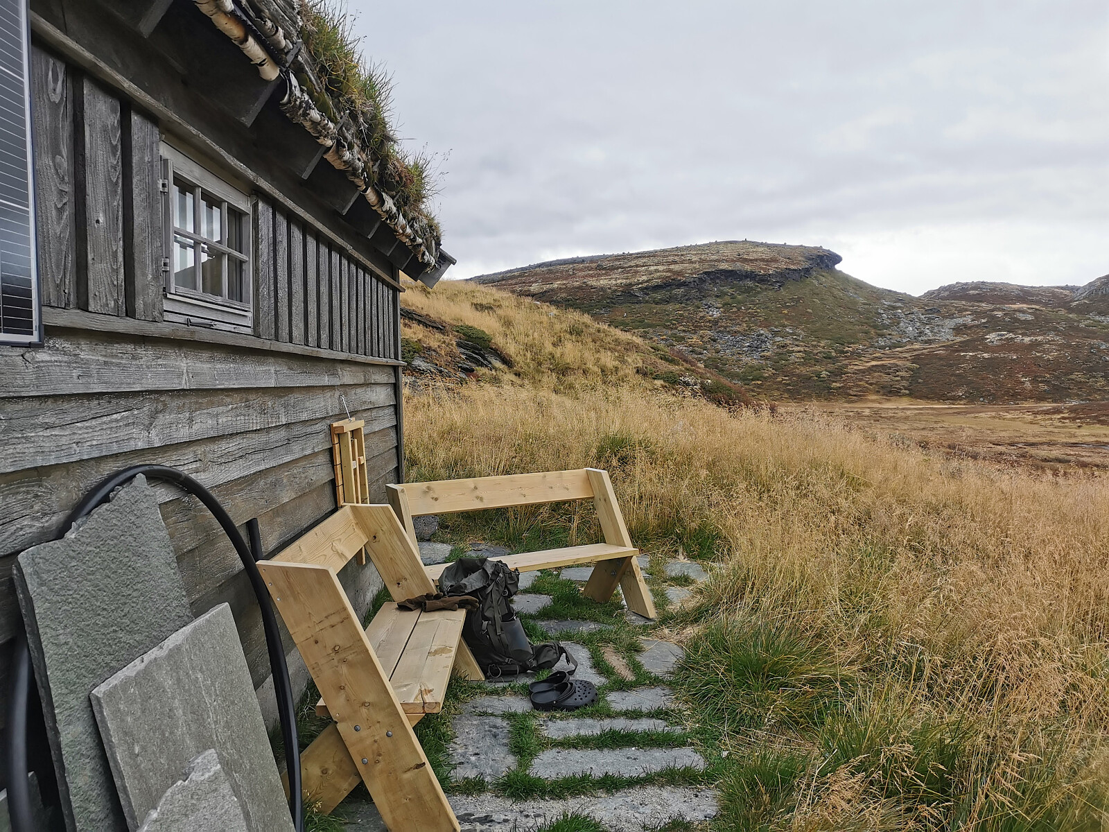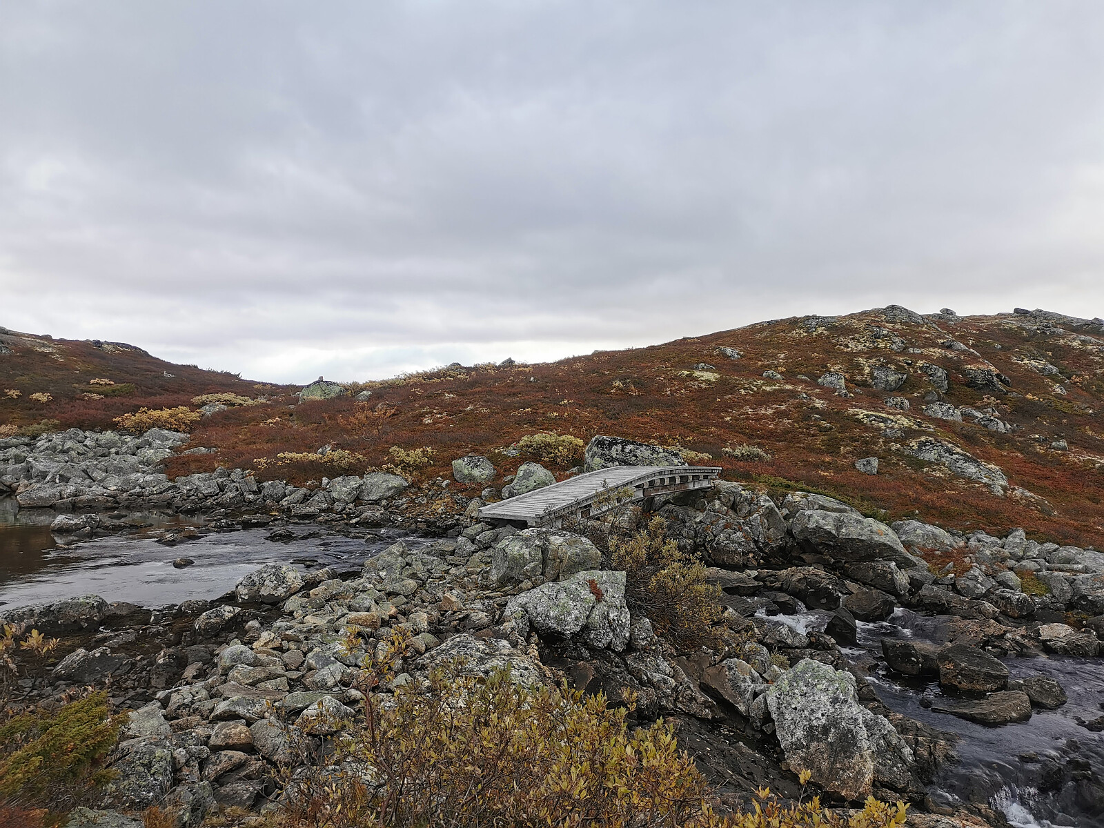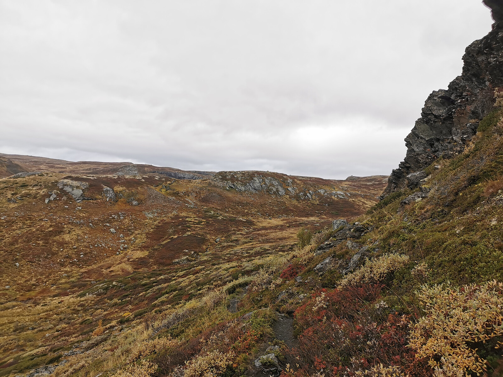Gårsdagen ble brukt på Randinuten og Helnaberg og denne mandagen var det på tide med retur tilbake til Hjølmo. Været var litt gråere, men det var ikke begynt å regne og vinden var mindre kraftig enn de siste to dagene. Jeg fulgte T-stien mot Vivelid i 6,5 km frem til Brottefonn. Her tok jeg korteste rute opp på toppen av Skinfjellet, som jeg nådde kl 09:45. Grei utsikt fra toppen, men fortsatt vindfullt! Satte kursen ned en naturlig renne og kom ned igjen på stien 1,5 km lenger fremme. Tok en to-minutter og nøt utsikten ned mot stølene på Skuggabjørn, før jeg fortsatte ned til Reinavotni (1080 moh). Her var det litt mer kronglete og bløt sti med meterhøye vier mange steder. Krysset den solide broen over utløpet av Reinavotni og kom rask frem til Vivheller. Her lånte jeg en benk og fikk meg en god lunsj og en kopp kaffe. Var tydeligvis folk i en av hyttene, men jeg så kun hunden utenfor.
