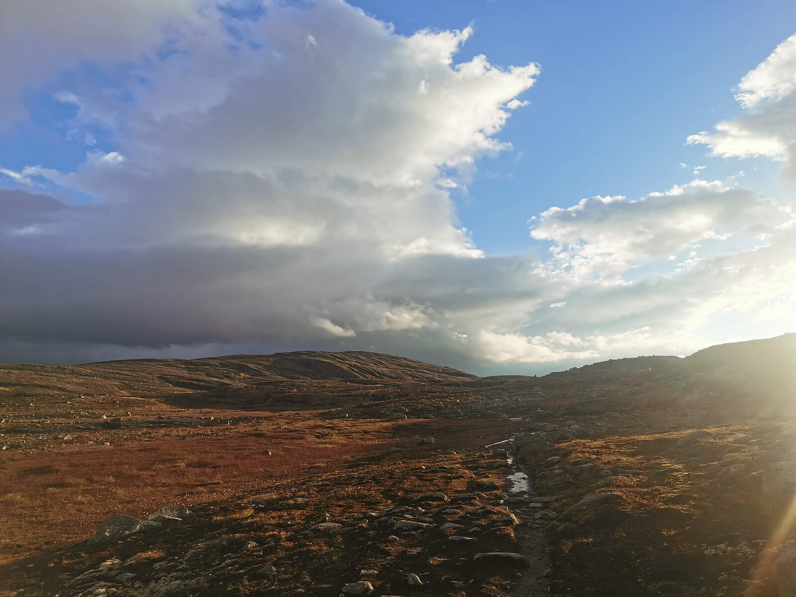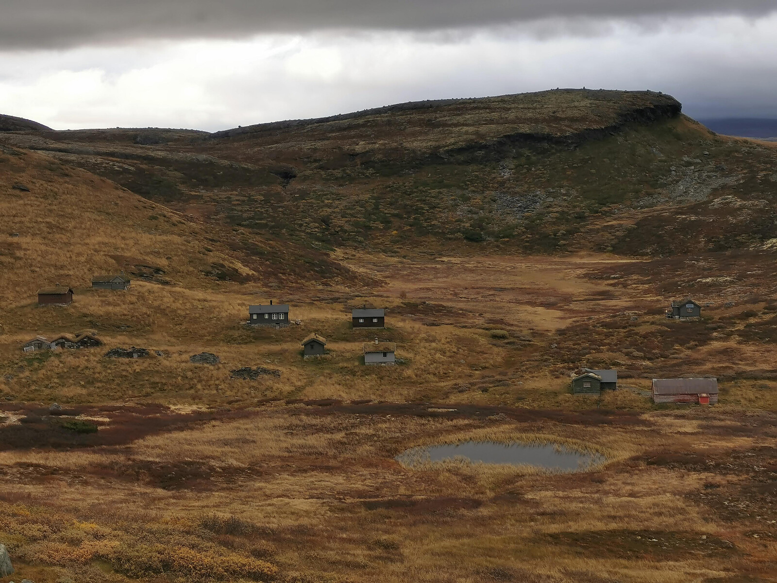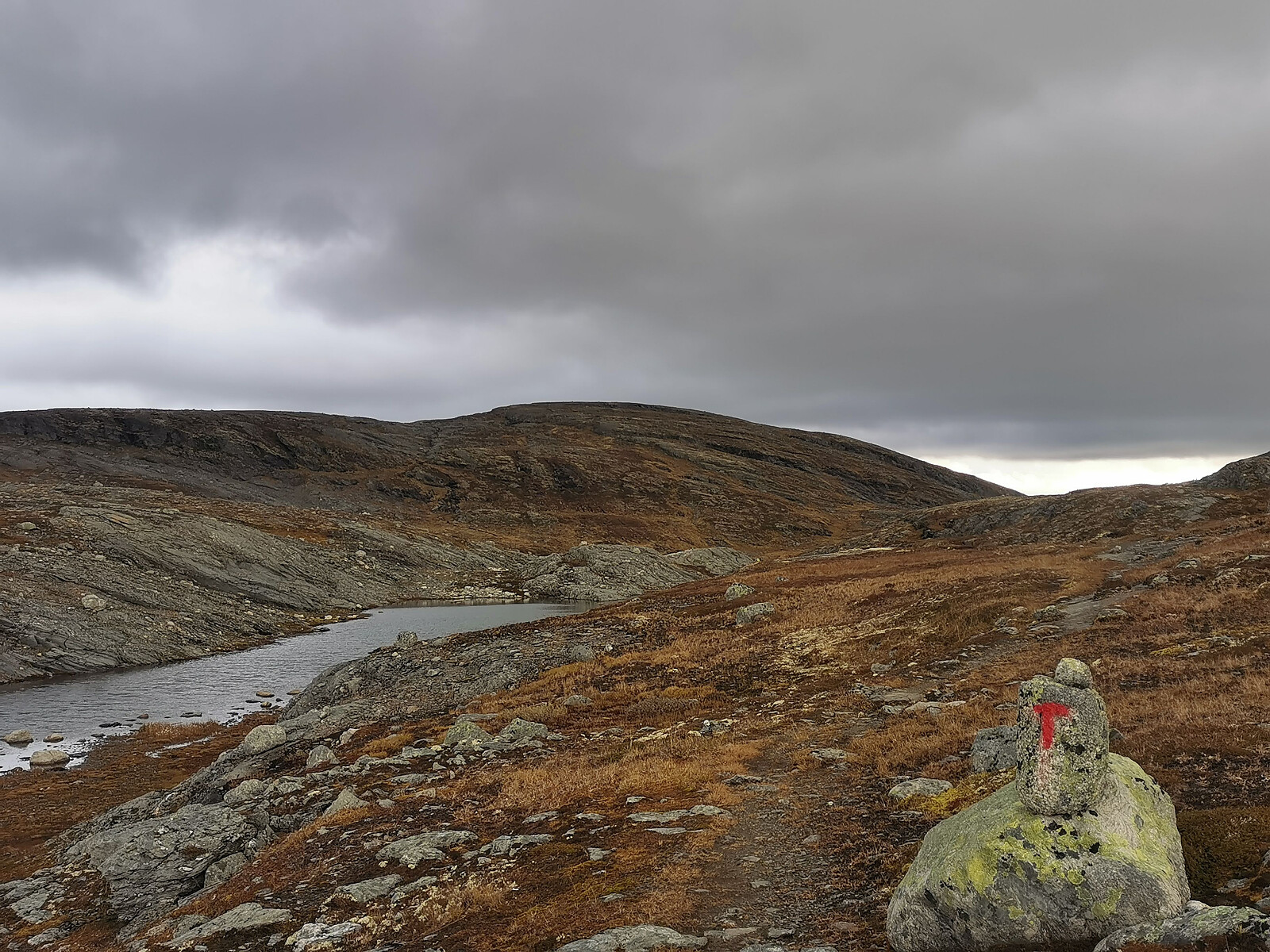 Gårsdagen ble brukt på Randinuten og Helnaberg og denne mandagen var det på tide med retur tilbake til Hjølmo. Været var litt gråere, men det var ikke begynt å regne og vinden var mindre kraftig enn de siste to dagene. Jeg fulgte T-stien mot Vivelid i 6,5 km frem til Brottefonn. Her tok jeg korteste rute opp på toppen av Skinfjellet, som jeg nådde kl 09:45. Grei utsikt fra toppen, men fortsatt vindfullt! Satte kursen ned en naturlig renne og kom ned igjen på stien 1,5 km lenger fremme. Tok en to-minutter og nøt utsikten ned mot stølene på Skuggabjørn, før jeg fortsatte ned til Reinavotni (1080 moh). Her var det litt mer kronglete og bløt sti med meterhøye vier mange steder. Krysset den solide broen over utløpet av Reinavotni og kom rask frem til Vivheller. Her lånte jeg en benk og fikk meg en god lunsj og en kopp kaffe. Var tydeligvis folk i en av hyttene, men jeg så kun hunden utenfor.