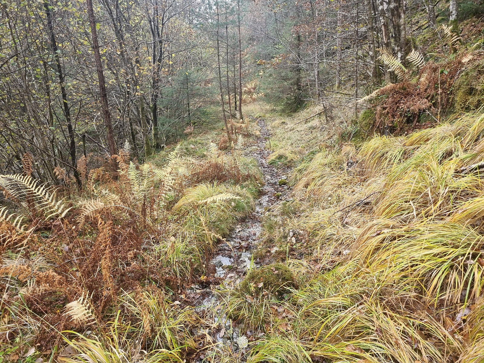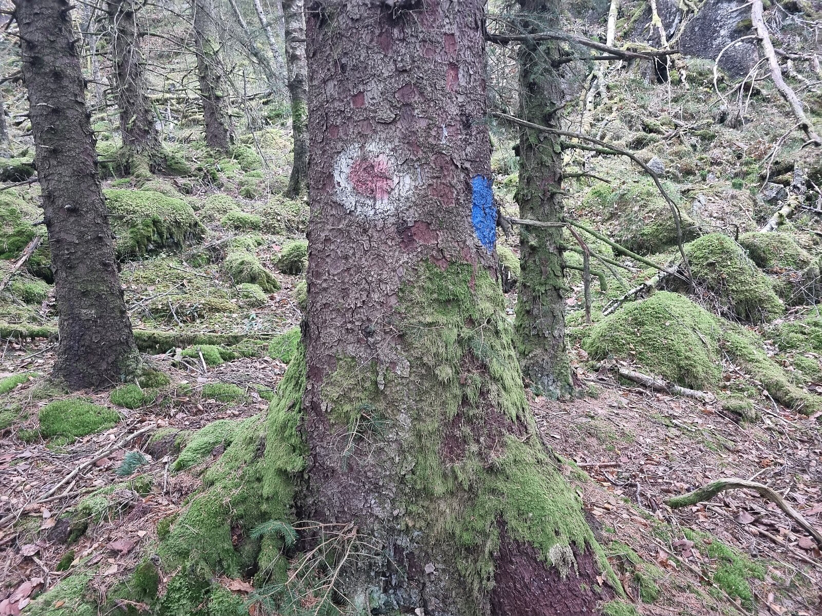Her har jeg funnet en bedre sti. Den var opprinnelig merket med hvitt og rødt og senere oppfrisket med blått. Stien dreier snart mot nord og jeg mister ikke særlig høyde. Når stien begynner å stige, mister jeg tålmodigheten og går rett ned til en sti som er merket på kartet.