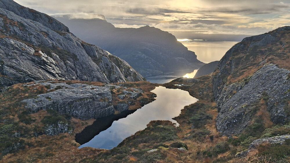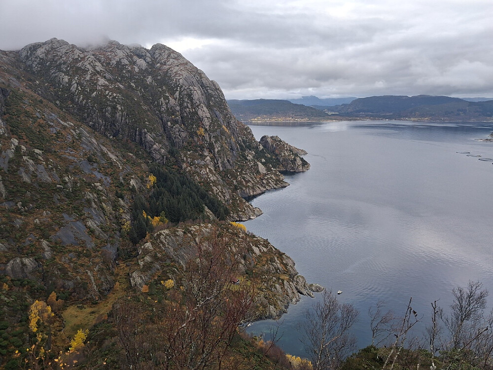 Fikk endelig kontaktet en lokal som er ofte på sjøen om skyss til Skorpa. Jeg hoppet på land ved Gulen, og gikk opp den nærmeste hyllen. Det starter med veldig mye vegetasjon, og det blir svaberg etter 100 moh., det var heldigvis tørt nok idag. Litt opp og ned, så var det tydelig rute til toppen. Veldig flotte skyer i dag, fikk ikke noe regn selv om det var meldt.
