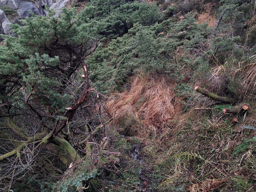 Til Stonga var det sti, noen har visst ryddet en løype opp den øverste skaret. Trær og busker har blitt saget. Den fortsetter visst østover nedover Stonga, men fikk ikke tid til å sjekke det ut. Det var fortsatt litt tøft siden det var glatt og vått.